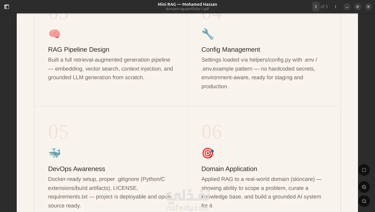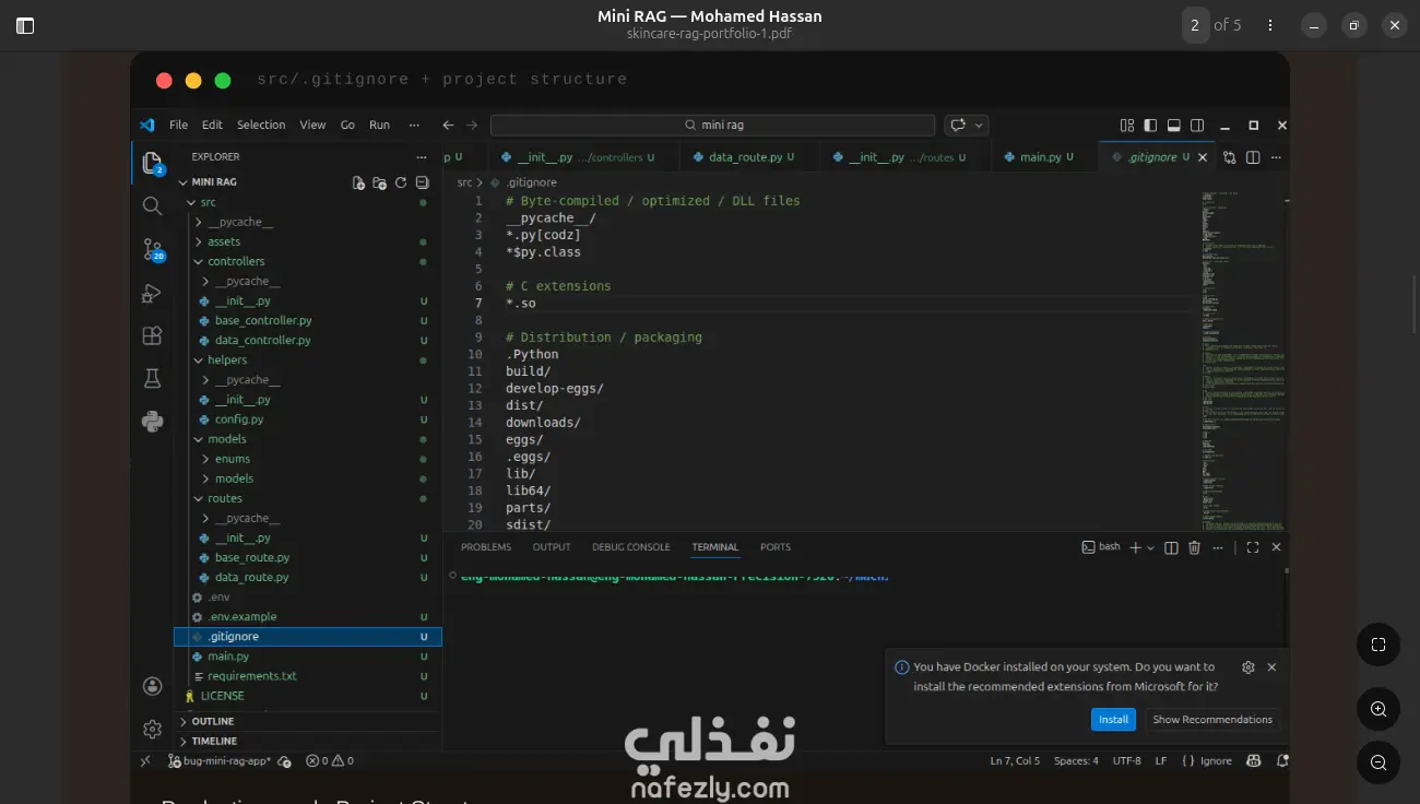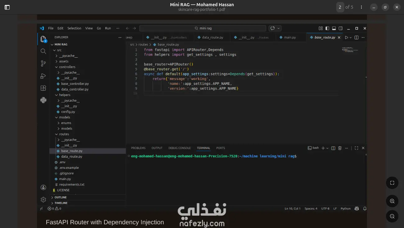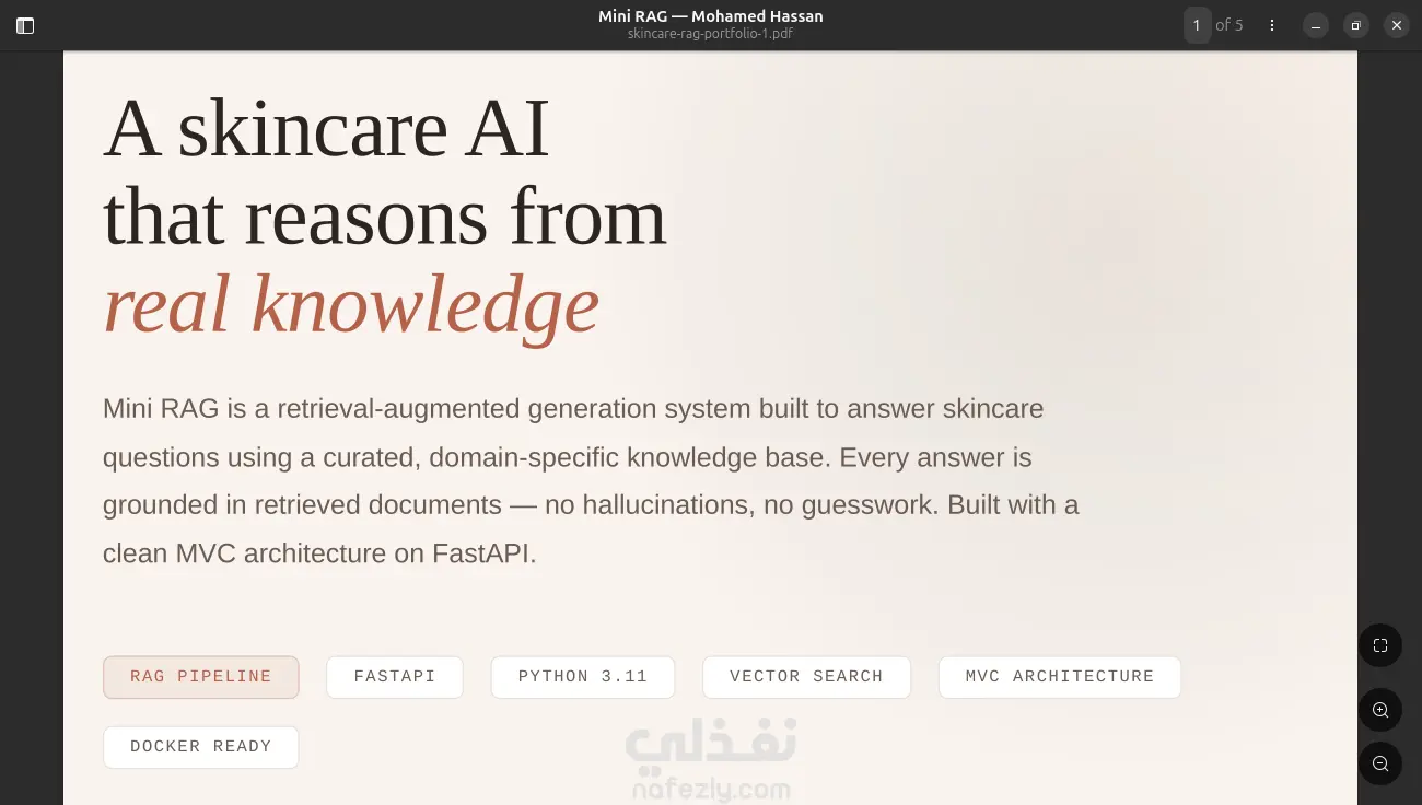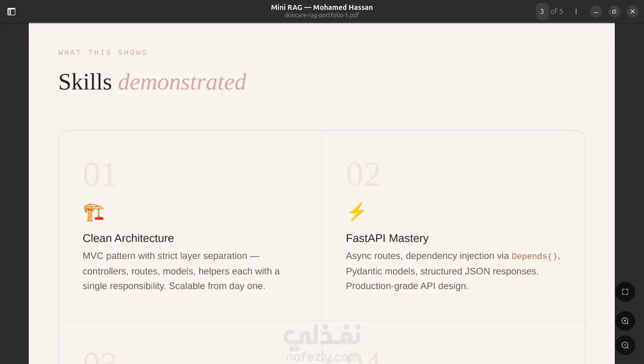 Built with FastAPI using strict MVC architecture, Pydantic validation, and Docker. Demonstrates ability to ship a full AI pipeline — from document ingestion and vector search to grounded LLM generation.