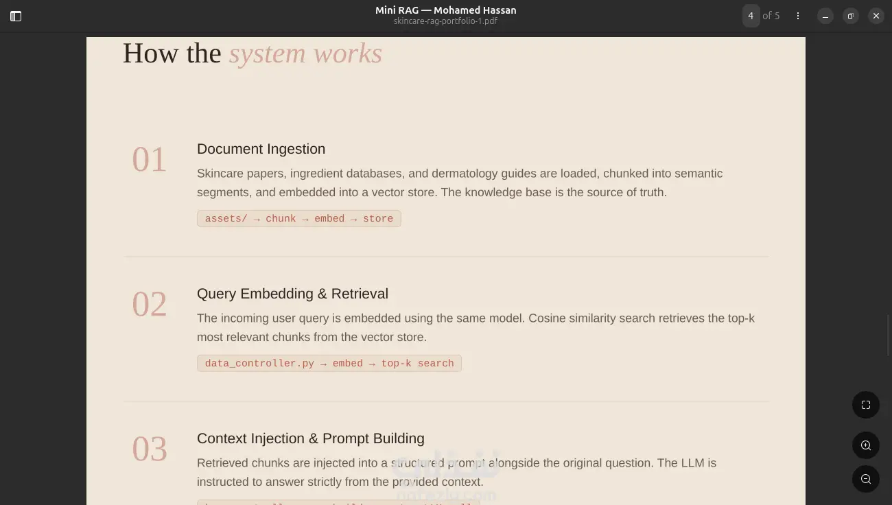 A Retrieval-Augmented Generation system that answers skincare questions using a curated knowledge base. Every answer is grounded in retrieved documents, no hallucinations.