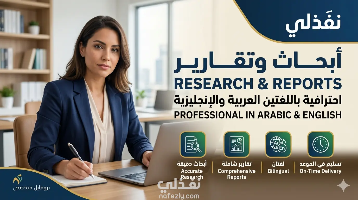 أقدم لكم خدمة إعداد وكتابة الأبحاث والتقارير في مختلف المجالات (الأدبية، التربوية، الإدارية، والاجتماعية) باللغتين العربية والإنجليزية، مع الالتزام التام بالمعايير المهنية والأكاديمية.