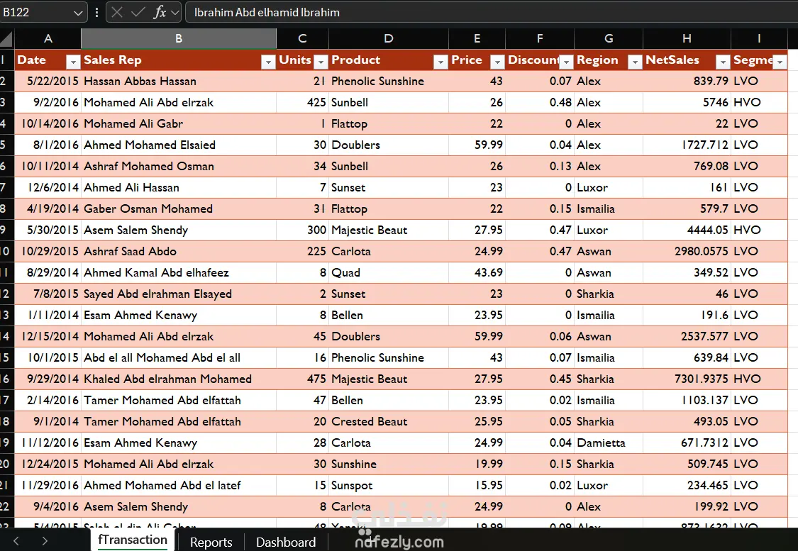 تعرض اللوحة مؤشرات أداء رئيسية مثل: إجمالي المبيعات، التكلفة، الربح، هامش الربح، وعدد الطلبات. تشمل اللوحة: تحليل المبيعات حسب المناطق والقنوات مقارنة الأداء عبر الزمن عرض أفضل المنتجات والعملاء رسوم بيانية تفاعلية وسهلة القراءة فلاتر ديناميكية لتحليل البيانات بسهولة تساعد هذه اللوحة في: فهم الأداء بشكل أسرع اتخاذ قرارات مبنية على البيانات تحسين الربحية الأدوات المستخدمة: Microsoft Excel – Data Analysis – Data Visualization مميزات الخدمة تحليل بيانات احترافي تحليل بيانات المبيعات واستخراج أهم المؤشرات والـ Insights لدعم اتخاذ القرار. لوحة تحكم تفاعلية تصميم Dashboard احترافي باستخدام Excel يعرض البيانات بشكل واضح وسهل الفهم. مؤشرات أداء رئيسية (KPIs) عرض أهم المؤشرات مثل المبيعات، الأرباح، التكلفة، وهامش الربح. فلاتر ديناميكية إمكانية تصفية البيانات حسب الوقت أو الفئة أو المنطقة بسهولة. دعم التعديل مستقبلاً تصميم مرن يسمح بتحديث البيانات بسهولة دون الحاجة لإعادة بناء الداشبورد.