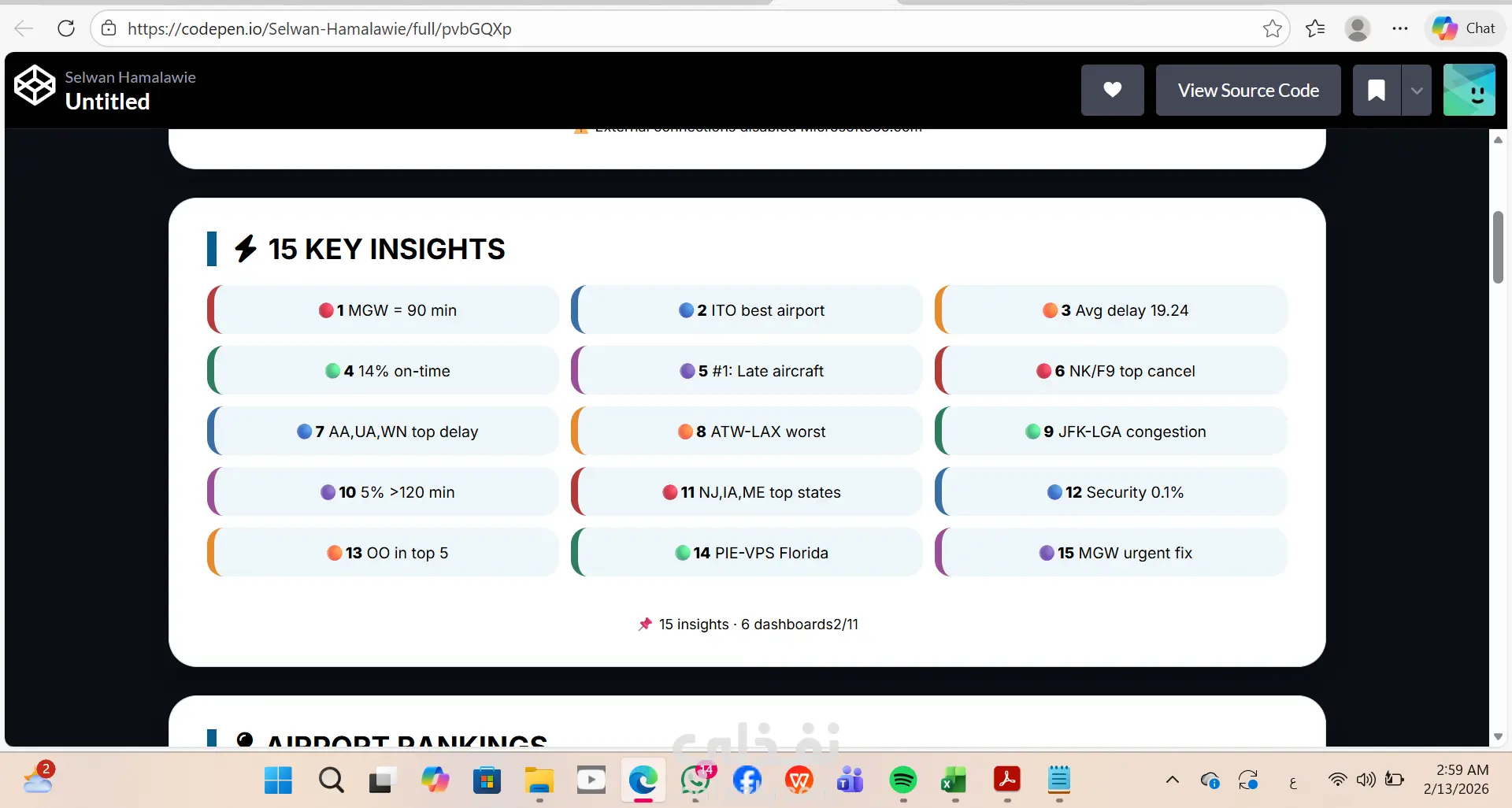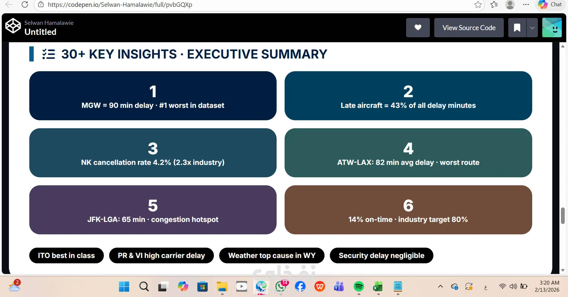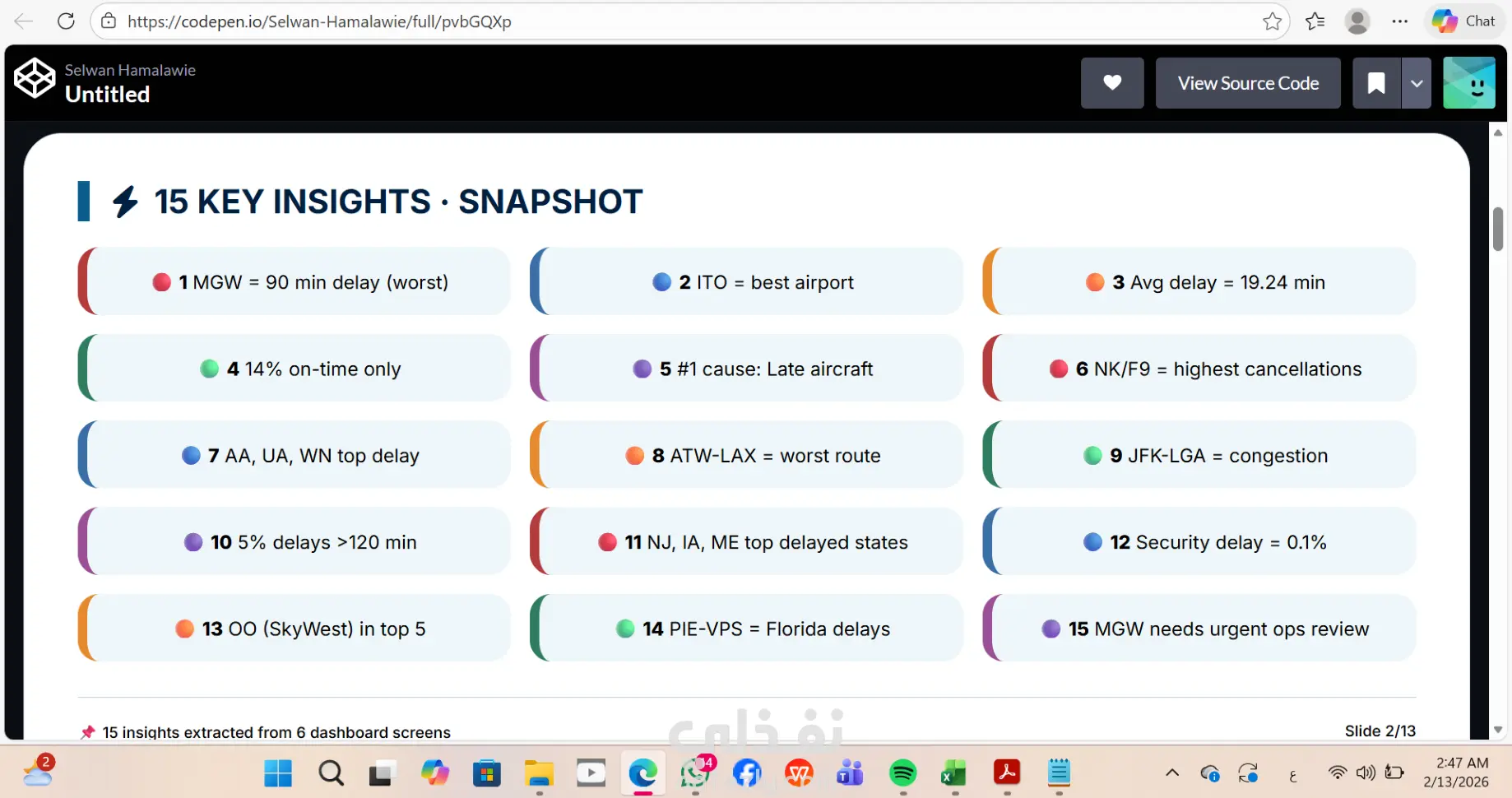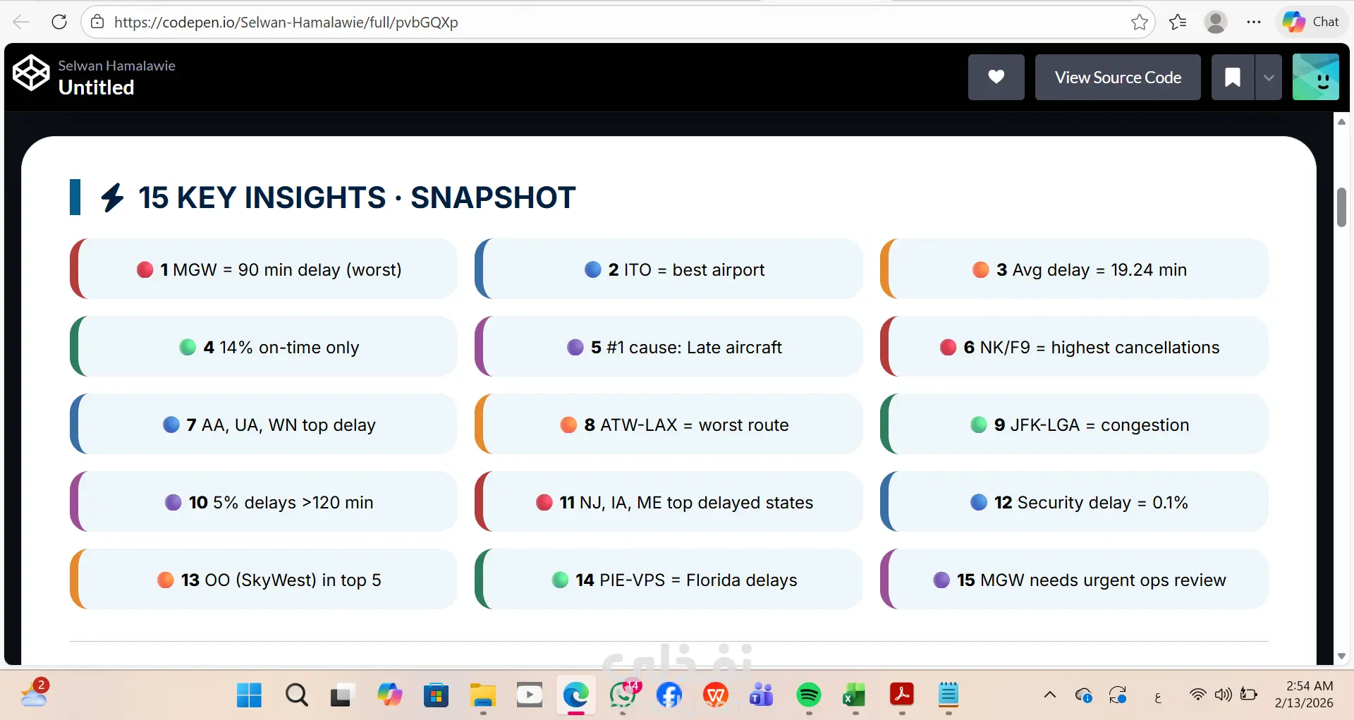 قمت بتنفيذ مشروع لتحليل بيانات رحلات الطيران باستخدام Excel، حيث بدأت بتنظيف البيانات وتنظيمها، ثم إنشاء Dashboard تفاعلي لعرض أهم المؤشرات بشكل واضح وسهل الفهم. الداشبورد بتوضح متوسط أسعار التذاكر، عدد الرحلات، توزيع الرحلات حسب شركات الطيران والمطارات، بالإضافة إلى مقارنة بين الرحلات المباشرة وغير المباشرة، مع استخدام Pivot Tables وCharts لعرض البيانات بشكل مبسط. في النهاية، قمت بإعداد تقرير احترافي يلخص أهم النتائج ويوضح أبرز المشاكل الموجودة في البيانات أو الأداء، مع تقديم اقتراحات عملية تساعد على تحسين النتائج واتخاذ قرارات أفضل بناءً على التحليل.