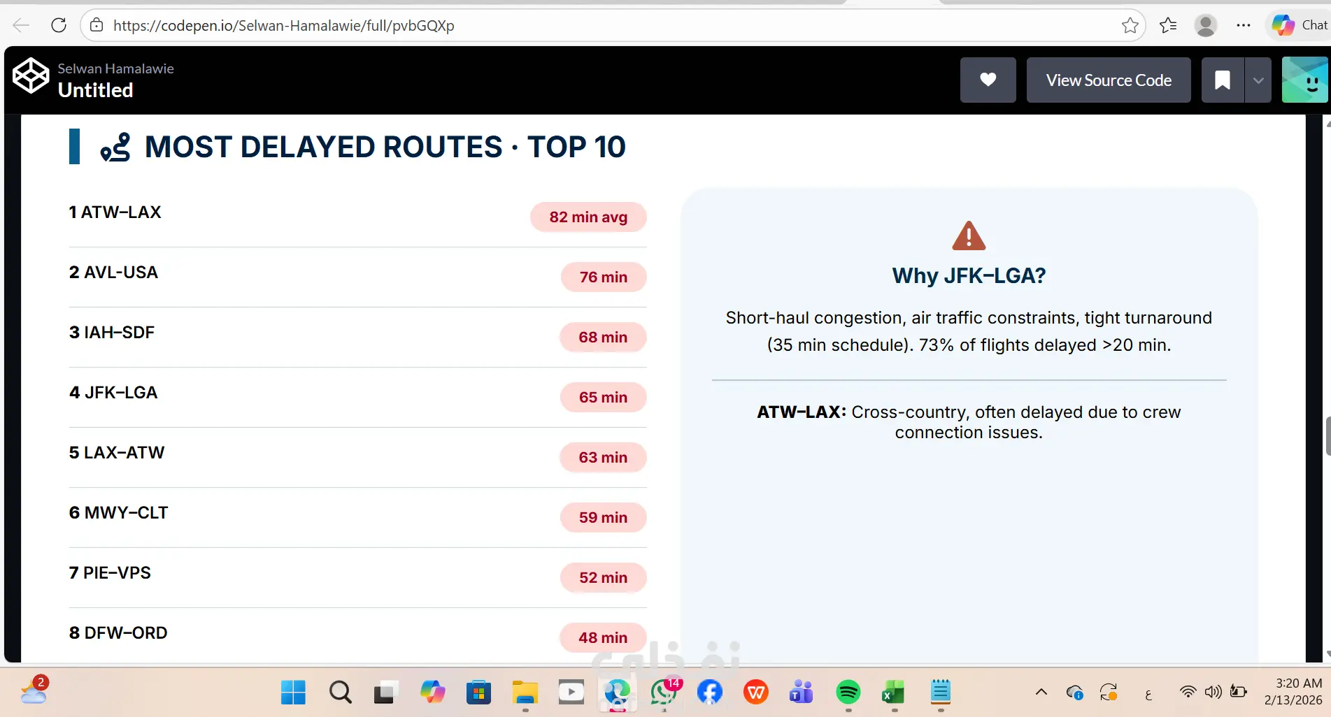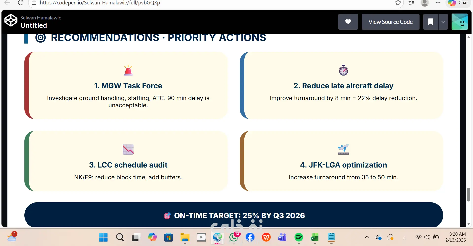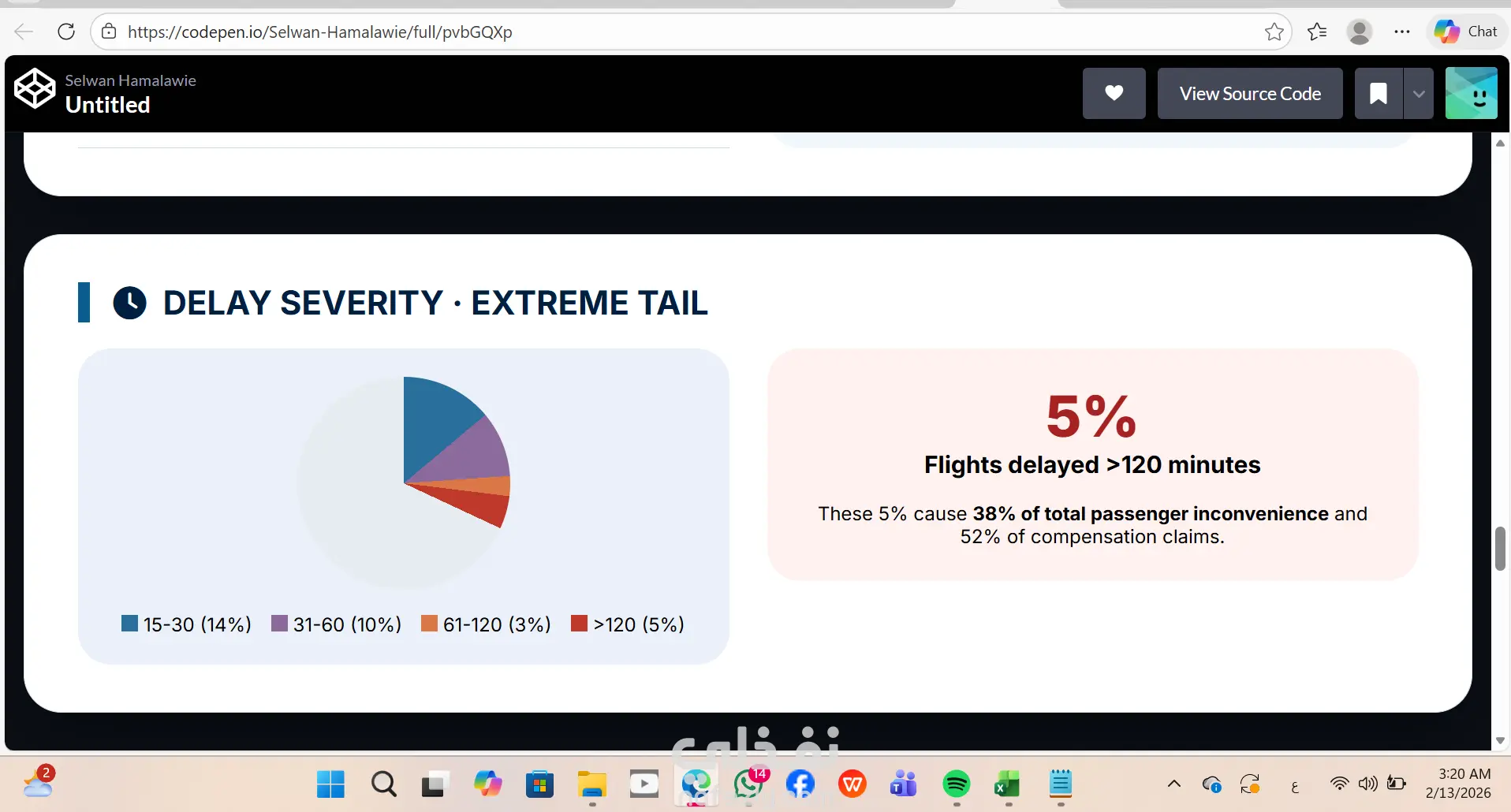 قمت بتنفيذ مشروع لتحليل بيانات رحلات الطيران باستخدام Excel، حيث بدأت بتنظيف البيانات وتنظيمها، ثم إنشاء Dashboard تفاعلي لعرض أهم المؤشرات بشكل واضح وسهل الفهم. الداشبورد بتوضح متوسط أسعار التذاكر، عدد الرحلات، توزيع الرحلات حسب شركات الطيران والمطارات، بالإضافة إلى مقارنة بين الرحلات المباشرة وغير المباشرة، مع استخدام Pivot Tables وCharts لعرض البيانات بشكل مبسط. في النهاية، قمت بإعداد تقرير احترافي يلخص أهم النتائج ويوضح أبرز المشاكل الموجودة في البيانات أو الأداء، مع تقديم اقتراحات عملية تساعد على تحسين النتائج واتخاذ قرارات أفضل بناءً على التحليل.