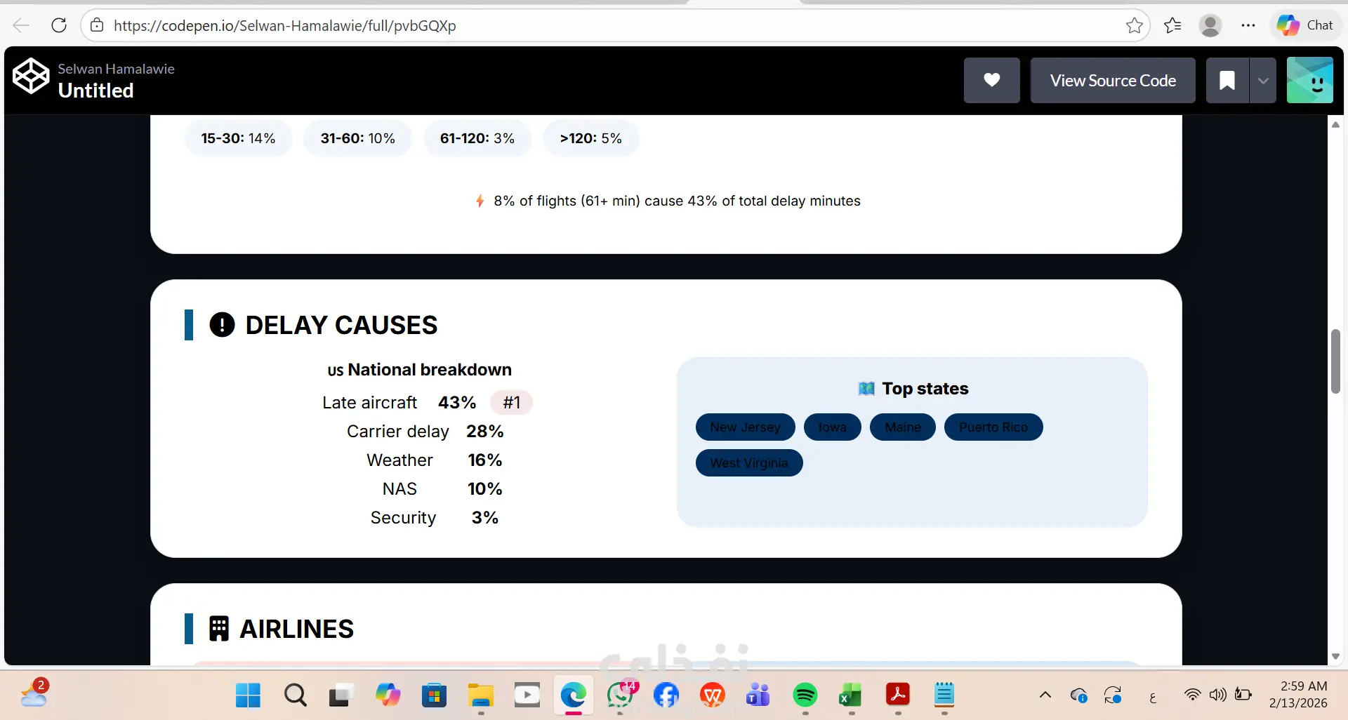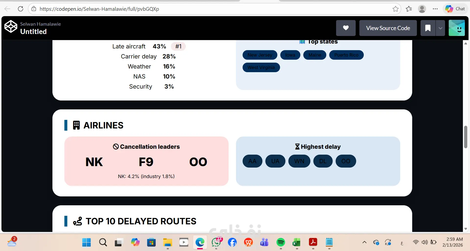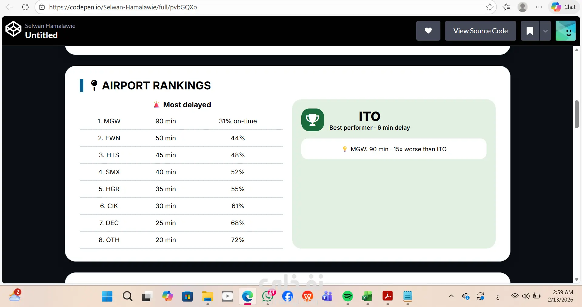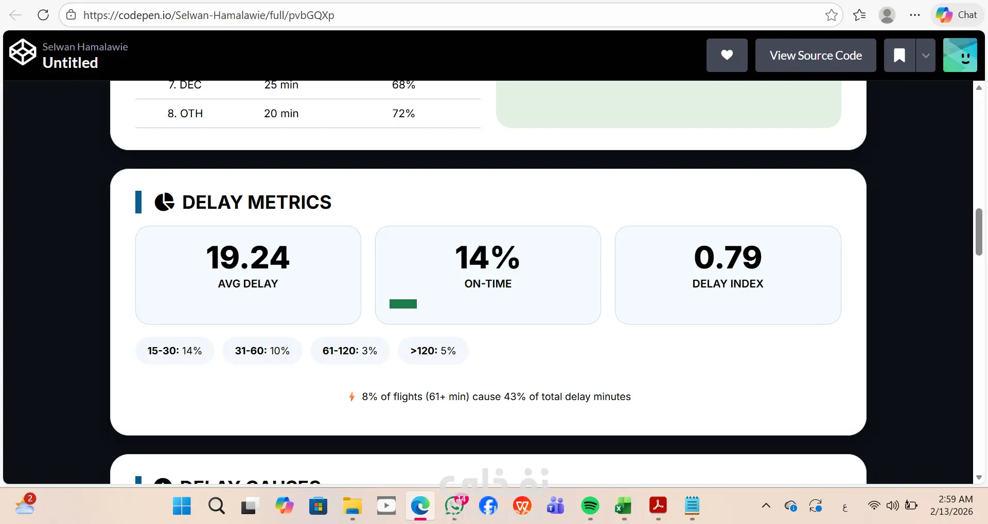 قمت بتنفيذ مشروع لتحليل بيانات رحلات الطيران باستخدام Excel، حيث بدأت بتنظيف البيانات وتنظيمها، ثم إنشاء Dashboard تفاعلي لعرض أهم المؤشرات بشكل واضح وسهل الفهم. الداشبورد بتوضح متوسط أسعار التذاكر، عدد الرحلات، توزيع الرحلات حسب شركات الطيران والمطارات، بالإضافة إلى مقارنة بين الرحلات المباشرة وغير المباشرة، مع استخدام Pivot Tables وCharts لعرض البيانات بشكل مبسط. في النهاية، قمت بإعداد تقرير احترافي يلخص أهم النتائج ويوضح أبرز المشاكل الموجودة في البيانات أو الأداء، مع تقديم اقتراحات عملية تساعد على تحسين النتائج واتخاذ قرارات أفضل بناءً على التحليل.