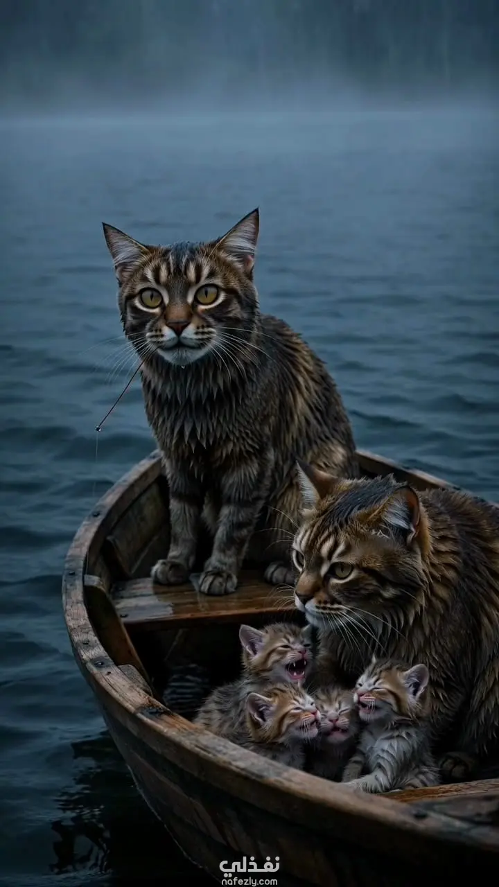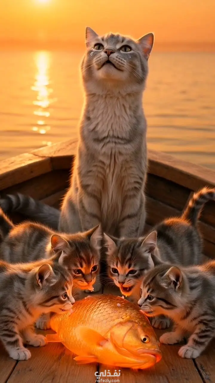 مجموعه من القطط تصتاد الاسماك ثم بعد ذالك اصتياد الاسماك ثم بعد ذالك اكل الاسماك و اللعب و الفرح ذالك الفيديو محول جميعا من صور الي فيديو ب الذكاء الاصطناعي
