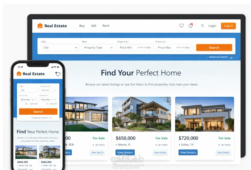 تصميم وتطوير موقع لعرض العقارات باستخدام React.js،