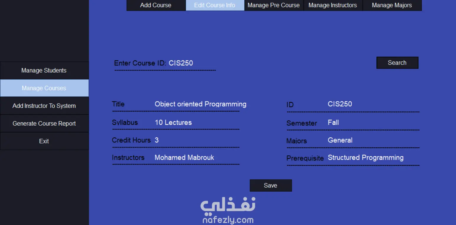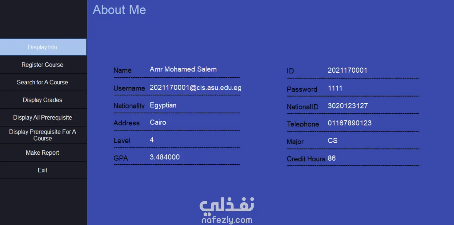 نظام تسجيل المقررات الدراسية هو تطبيق قائم على سطر الأوامر مكتوب بلغة C++، مصمم لتبسيط عملية تسجيل المقررات الدراسية للطلاب وتسهيل إدارة المقررات والدرجات للمسؤولين. يوفر النظام وظائف أكاديمية أساسية مثل التسجيل في المقررات، وعرض الدرجات، والتحقق من المتطلبات الأساسية، والتحكم الإداري في بيانات المقررات والطلاب.
