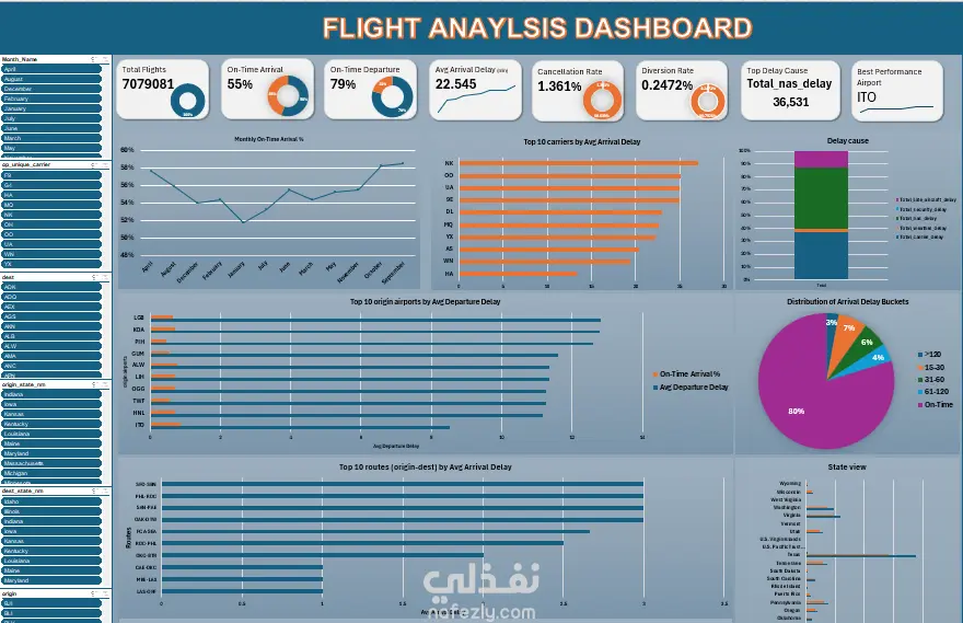 Project Overview يقدم هذا المشروع لوحة معلومات تفاعلية لتحليل تأخيرات الرحلات الجوية تم تطويرها باستخدام Microsoft Excel، حيث تركز على تحليل أداء الرحلات الداخلية داخل الولايات المتحدة لعام 2024. تقوم اللوحة بتحويل بيانات تشغيل الرحلات الخام إلى رؤى ذات معنى باستخدام Power Query، ونموذج البيانات (Power Pivot)، وPivotTables، وPivotCharts. تتيح لوحة المعلومات للمستخدمين متابعة أداء شركات الطيران، واتجاهات التأخير، وحالات الإلغاء والتحويل، وأسباب التأخير من خلال فلاتر وتصميمات تفاعلية. Project Objectives تحليل تأخيرات الرحلات ومدى الالتزام بالمواعيد تحديد الأسباب الرئيسية للتأخير (شركة الطيران، الطقس، نظام الطيران NAS، الأمن، تأخر الطائرة السابقة) مقارنة أداء شركات الطيران والمطارات تتبع أنماط الإلغاء والتحويل بناء لوحة معلومات احترافية في مجال ذكاء الأعمال باستخدام Excel Dataset Information مجموعة البيانات: flight_data_2024.csv النطاق: الرحلات الداخلية داخل الولايات المتحدة الفترة الزمنية: من يناير 2024 إلى ديسمبر 2024 مستوى البيانات: سجل واحد لكل رحلة البيانات تتضمن مواعيد الرحلات المجدولة مقابل الفعلية تأخيرات المغادرة والوصول بيانات الإلغاء والتحويل أسباب التأخير مدة الرحلة والمسافة Tools & Technologies Microsoft Excel Power Query (تنظيف وتحويل البيانات) Power Pivot (نمذجة البيانات) PivotTables وPivotCharts الدوال والمعادلات في Excel Dashboard Visualizations اتجاه الوصول في الوقت المحدد شهريًا أفضل 10 شركات طيران حسب متوسط تأخير الوصول أفضل 10 مطارات مغادرة حسب تأخير الإقلاع أكثر المسارات تأثرًا بتأخير الوصول مخطط يوضح مساهمة أسباب التأخير توزيع تأخيرات الوصول مقارنة الأداء بين الولايات تحليل شهري لحالات الإلغاء Learning Outcomes يوضح هذا المشروع المهارات التالية: تنظيف وتحويل البيانات نمذجة البيانات تطوير لوحات المعلومات حساب مؤشرات الأداء (KPIs) تحليل البيانات التجارية