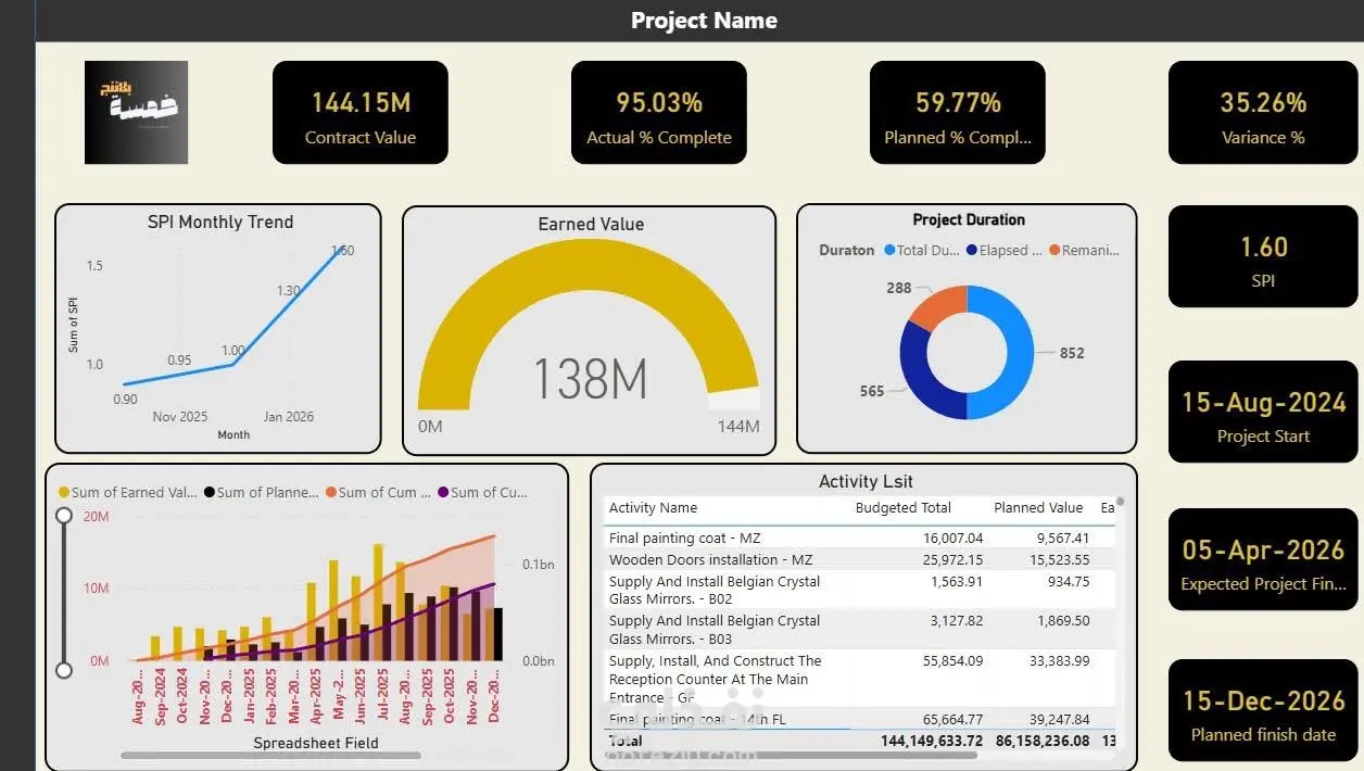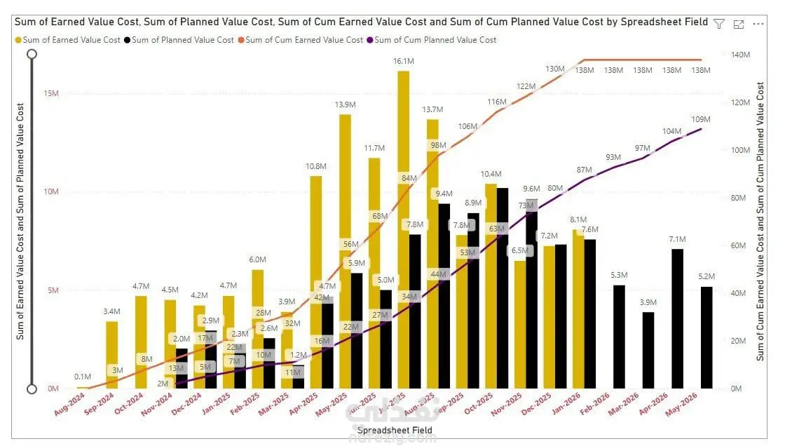 تحليل أداء المشروع باستخدام منهجية القيمة المكتسبة (Earned Value Management Dashboard)