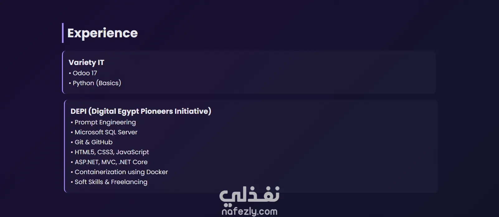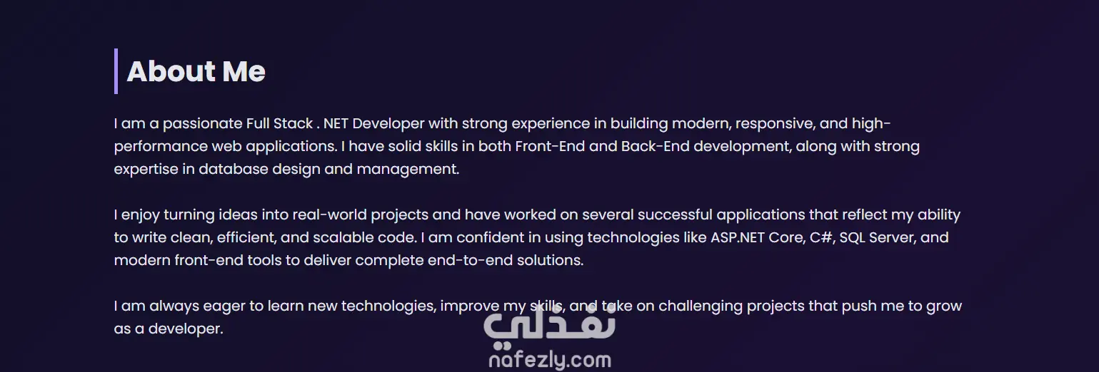 موقع Portfolio شخصي حديث ومتجاوب تم تطويره لعرض مهاراتي ومشاريعي وخبراتي كمطور Full Stack .NET. تم تصميم الموقع بواجهة مستخدم بسيطة وجذابة مع تجربة استخدام سلسة، مع التركيز على الأداء وسهولة التصفح. يحتوي الموقع على عدة أقسام مثل (نبذة عني – المهارات – الخبرات – المشاريع)، مما يتيح للزوار التعرف بسهولة على خلفيتي التقنية وأهم الأعمال التي قمت بتنفيذها. تم بناء الواجهة الأمامية باستخدام HTML و CSS و JavaScript مع إضافة تأثيرات تفاعلية وتصميم احترافي متجاوب يعمل بكفاءة على جميع الأجهزة. يعكس هذا المشروع قدرتي على تطوير مواقع ويب متكاملة تجمع بين التصميم الجذاب والأداء القوي، بالإضافة إلى خبرتي في التعامل مع قواعد البيانات وبناء الأنظمة باستخدام تقنيات .NET.
