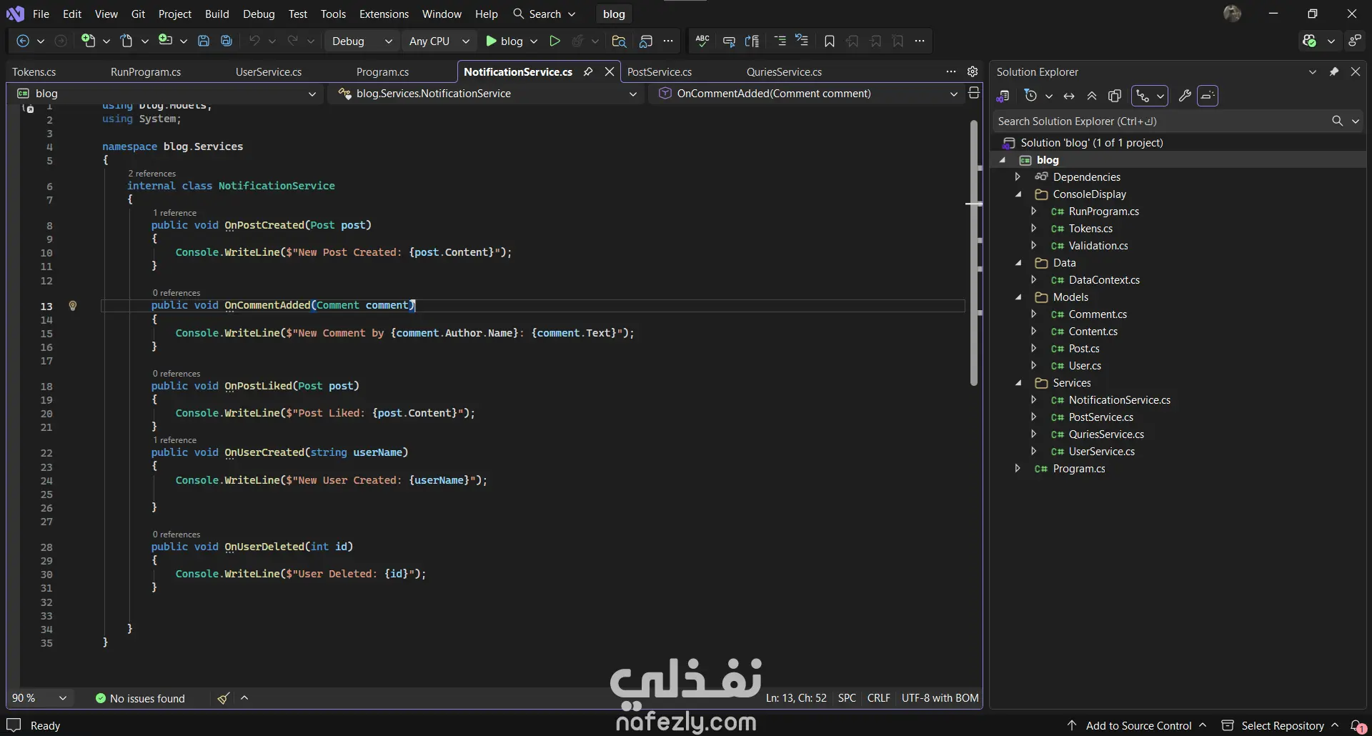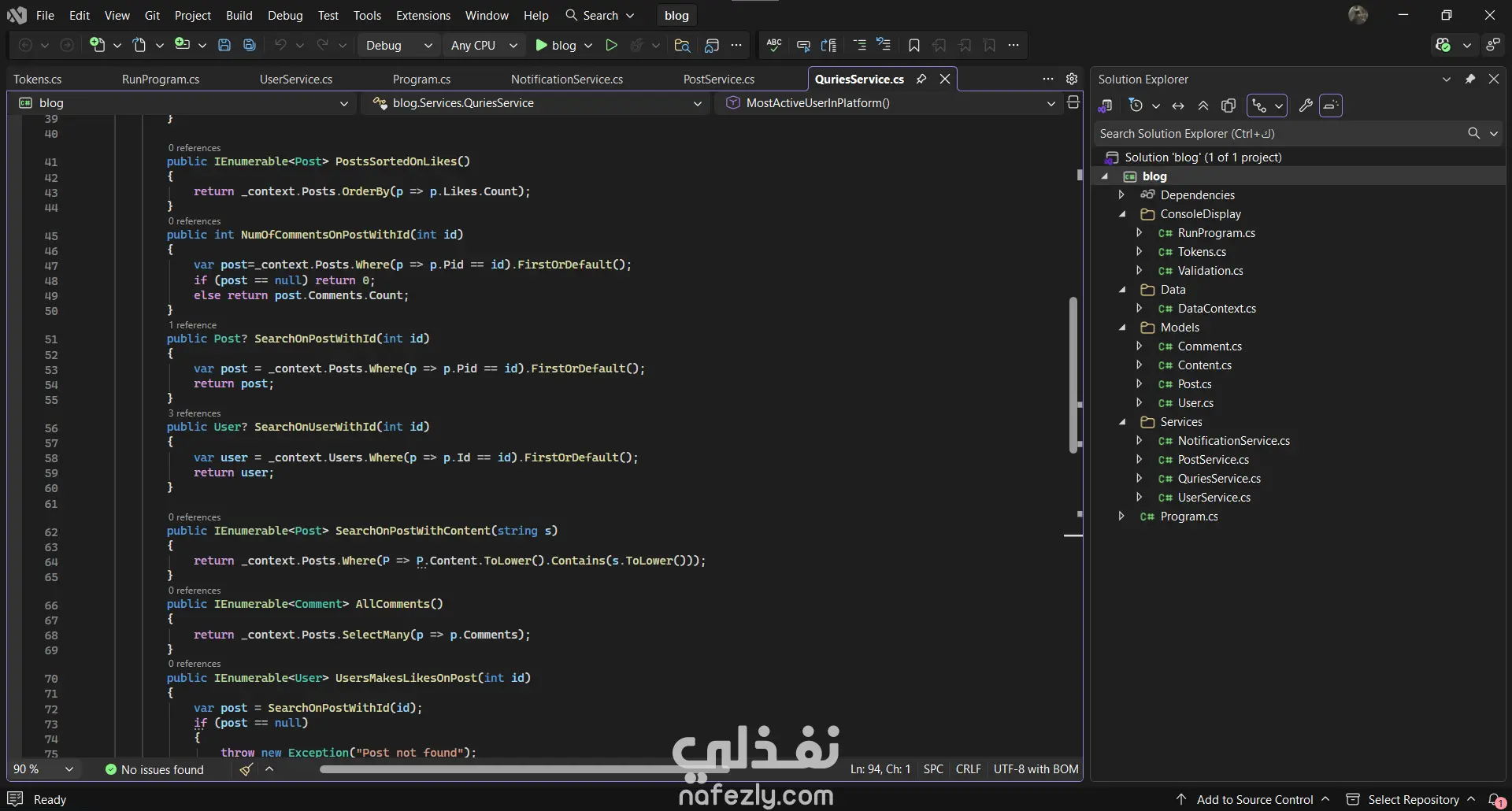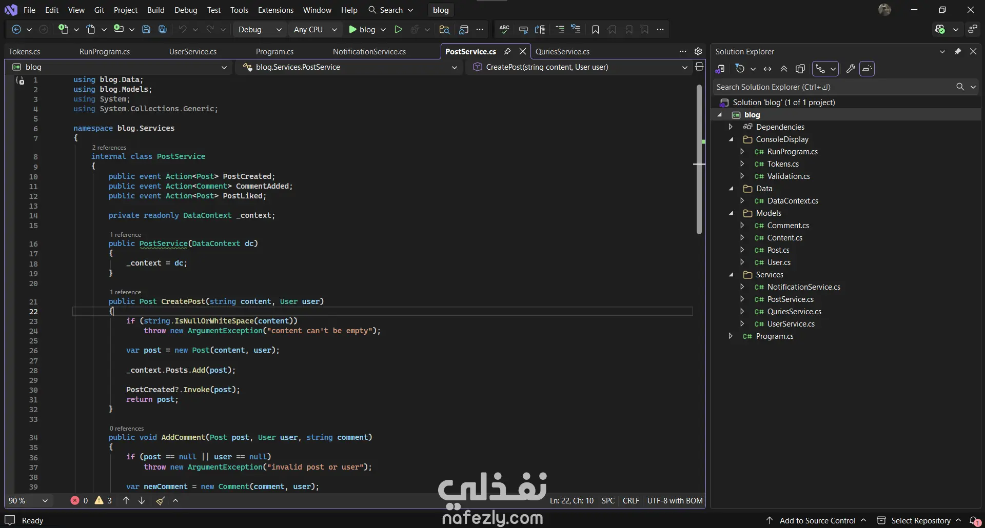 هذا المشروع هو تطبيق برمجاي مصمم لمحاكاة الأنظمة التفاعلية للمدونات ومنصات التواصل الاجتماعي. تم بناؤه باستخدام بيئة .NET Core، ويهدف إلى تنظيم العلاقة بين المستخدمين والمحتوى (المنشورات والتعليقات) بطريقة برمجية منظمة.
