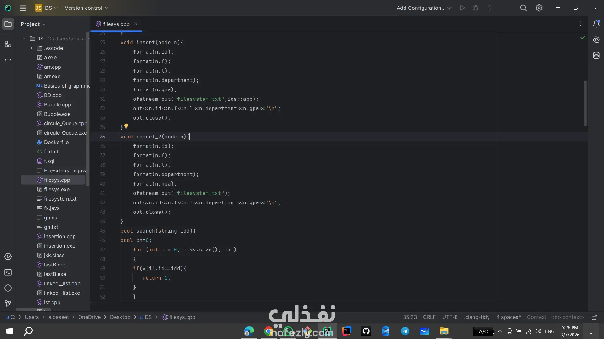 تخزين البيانات الثابت (Fixed-length Record Formatting): يستخدم النظام دالة format لضمان تخزين كل حقل بطول ثابت (15 حرفاً)، مما يسهل عملية القراءة والتنظيم داخل الملف النصي filesystem.txt.