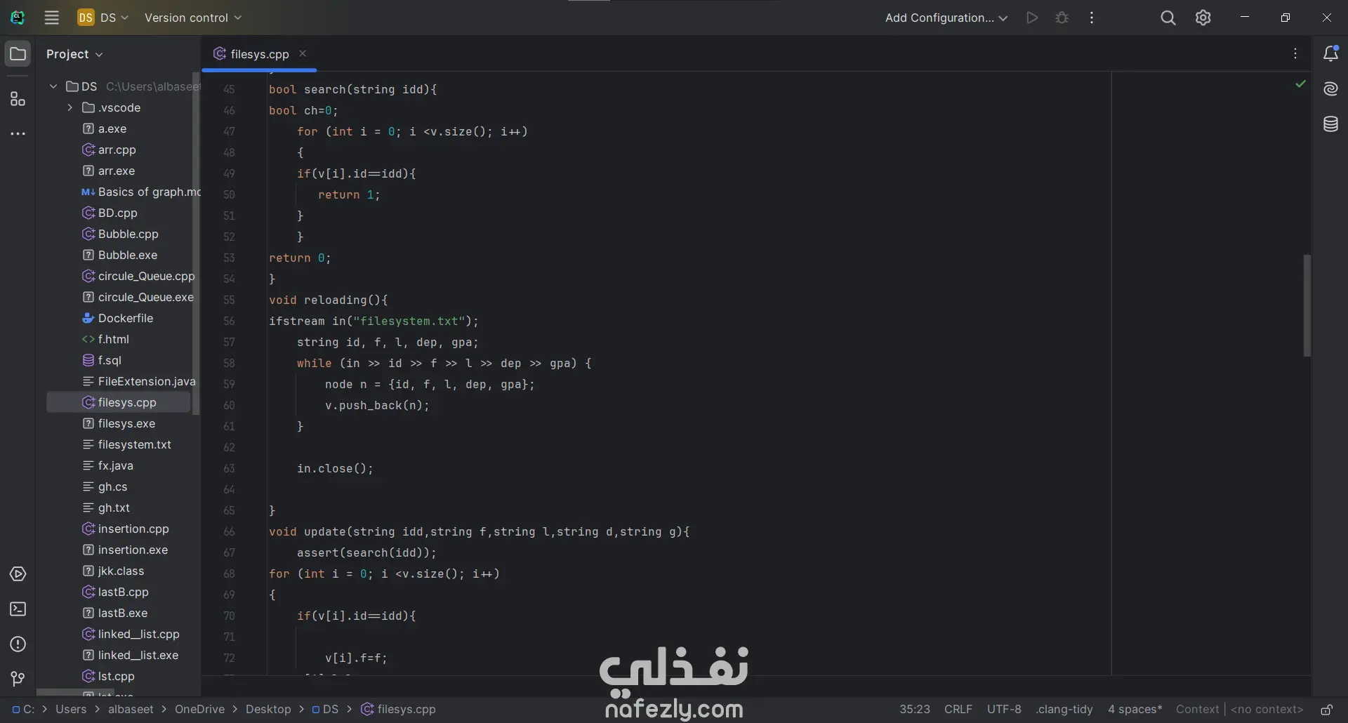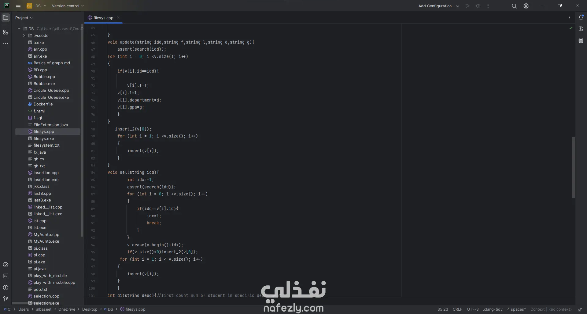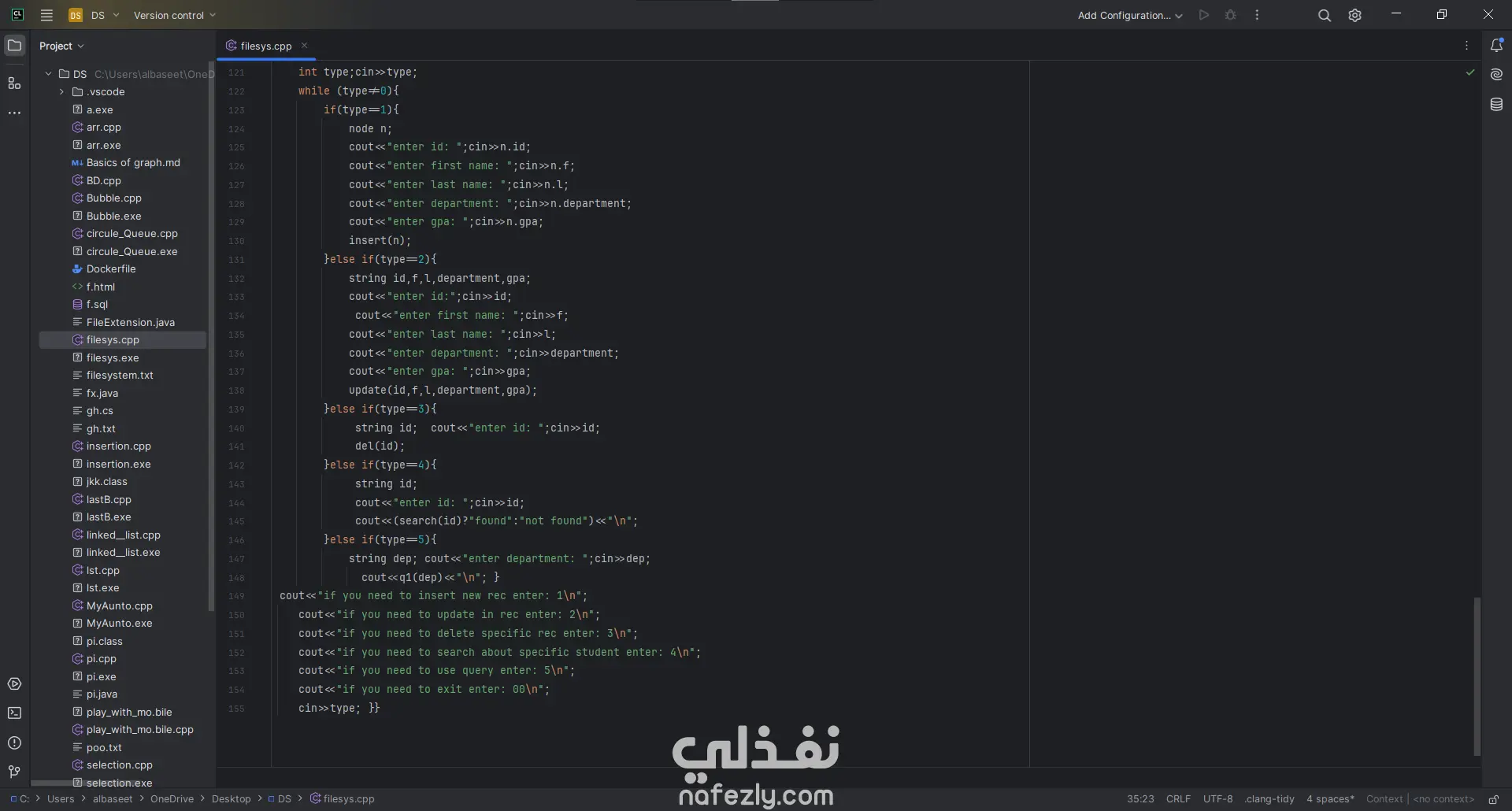 التحديث والحذف (Update & Delete): يعتمد النظام على تحميل البيانات في vector (ذاكرة مؤقتة)، إجراء التعديل، ثم إعادة كتابة الملف بالكامل لضمان تحديث السجلات بدقة.