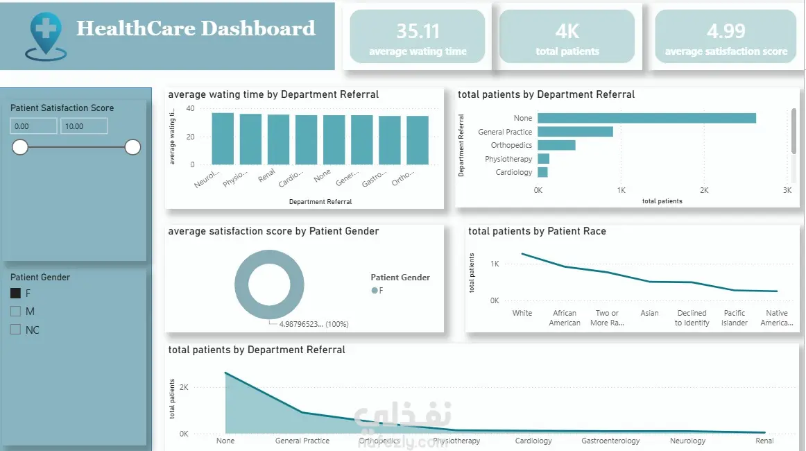مشروع تحليل بيانات تفاعلي يهدف إلى مراقبة وتحسين كفاءة العمل في المنشآت الصحية. قمت من خلال هذه اللوحة بتحويل بيانات المرضى المعقدة إلى رؤى بصرية سهلة الفهم لدعم اتخاذ القرار. تتضمن اللوحة التحليلات التالية: مؤشرات الأداء الرئيسية (KPIs): تتبع متوسط وقت الانتظار، إجمالي عدد المرضى، ومعدل رضا المرضى. تحليل الأقسام: مقارنة أداء الأقسام المختلفة من حيث عدد الإحالات (Referrals) ومتوسط الانتظار. التحليل الديموغرافي: دراسة توزيع المرضى بناءً على النوع (Gender) والعرق (Race) لفهم احتياجات الفئات المختلفة. تجربة المريض: مراقبة تقييمات الرضا لضمان جودة الخدمة الصحية المقدمة.