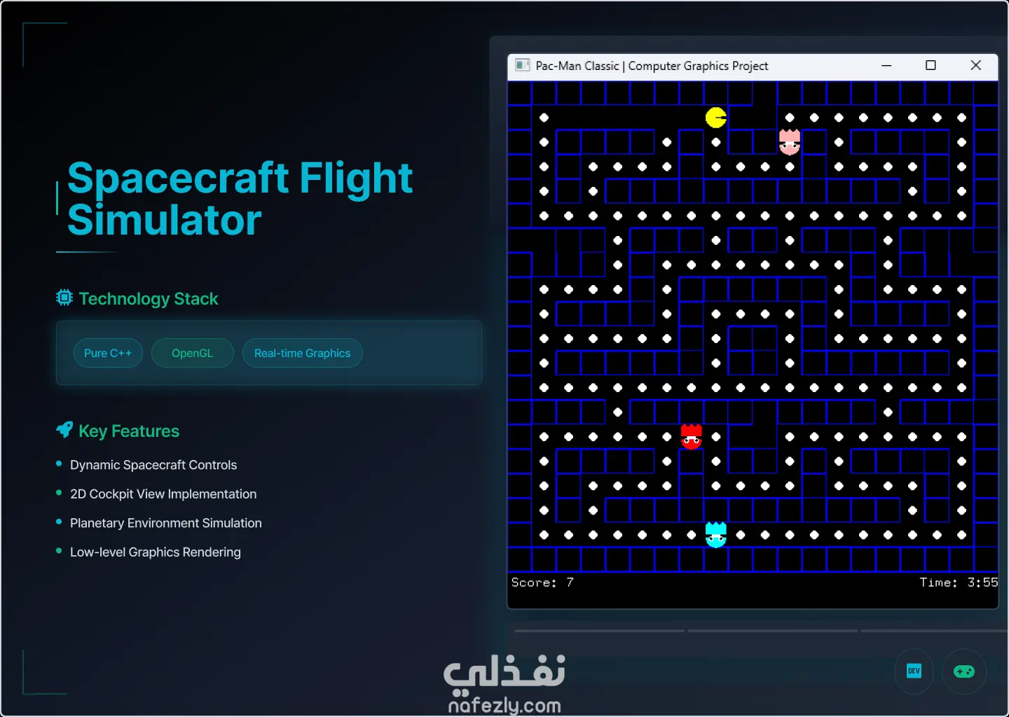 إعادة بناء لعبة Pac-Man الشهيرة من الصفر باستخدام لغة C++ ومكتبة الرسوميات OpenGL، مع التركيز على منطق الألعاب والخوارزميات البرمجية. أبرز المميزات التقنية: الرسوميات منخفضة المستوى (Low-level): بناء بيئة اللعبة والرسوميات باستخدام OpenGL API لضمان سرعة الأداء وكفاءة العرض. الذكاء الاصطناعي للأشباح: برمجة سلوك الأشباح وتتبع المسارات (Pathfinding) داخل المتاهة. نظام التصادم (Collision Detection): تنفيذ منطق دقيق للاصطدام بين اللاعب والعناصر المختلفة (النقاط، الأشباح، الجدران). إدارة حالة اللعبة: تنفيذ نظام متكامل لحساب النقاط (Score)، الوقت (Timer)، وحالات الفوز والخسارة.