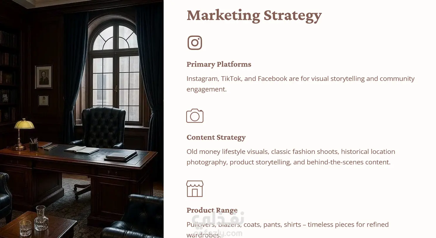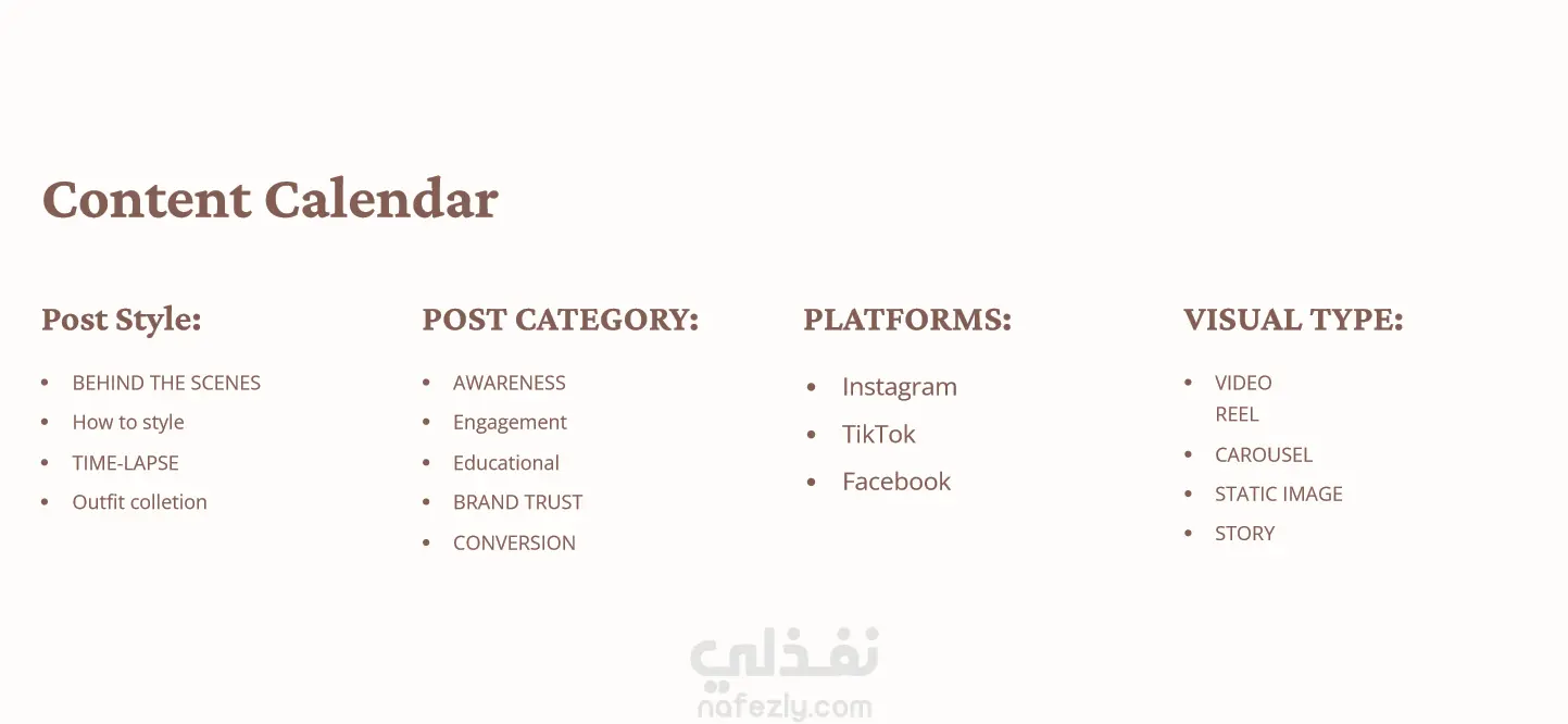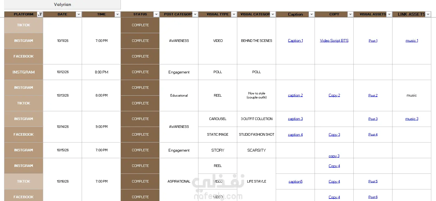 إنشاء تقويم شهري للمحتوي لبراند ملابس كلاسيكية للنشر علي فيسبوك، انستجرام، تيك توك، قمت بانشاء المحتوي بناء علي هدف المطلوب الوصول له وزيادة التفاعل والمتابعين وبعد تحديد الجمهور المستهدف ودراسة البراند وطبيعته تم استخدام post type متنوعة (فيديو، كاروسل،صورة ثابتة،UGC،...) ،وأيضا قمت بتصميم المحتوي المعروض، وكتابة الكابشن لكل بوست