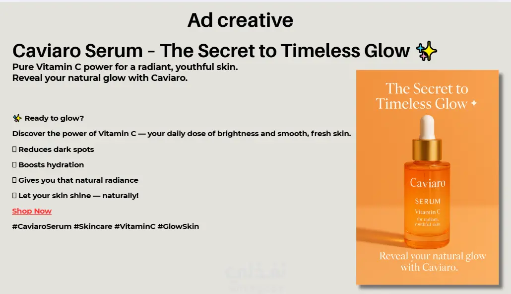 Creative Direction by Me قمت بإدارة وتنفيذ كامل الجانب الإبداعي لهذا الإعلان الخاص بمنتج العناية بالبشرة: تصميم الصورة بشكل احترافي يعكس هوية نظيفة وPremium كتابة كابشن جذاب موجه بدقة للجمهور المستهدف تحديد وكتابة نبرة الصوت (TOV) بما يتناسب مع شخصية البراند ويعزز الثقة من الفكرة إلى التنفيذ — كل تفصيلة معمول لها حساب عشان تحقق أفضل تأثير وتفاعل.
