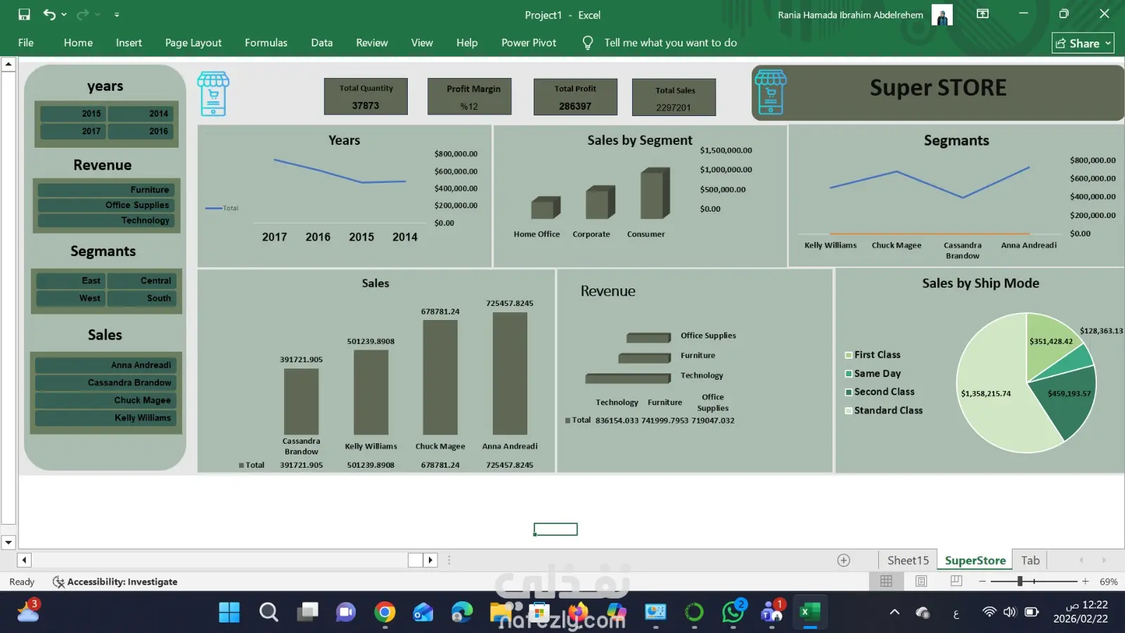 قمت بتنفيذ مشروع متكامل لتحليل بيانات المبيعات لمتجر "Super Store" باستخدام برنامج Microsoft Excel. تضمن المشروع المراحل التالية: معالجة البيانات: تنظيف وفحص البيانات لضمان دقتها. تحليل الأداء المالي: حساب إجمالي المبيعات، الأرباح، وهامش الربح بدقة. لوحة تحكم تفاعلية: تصميم Dashboard مرئي يتضمن: مقارنة المبيعات عبر السنوات (2014-2017). تحليل المبيعات حسب فئات العملاء (Segments). تقييم أداء مناديب المبيعات وتوزيع المبيعات حسب طرق الشحن. المرونة: إضافة أدوات تصفية (Slicers) تتيح عرض البيانات حسب السنة أو القطاع بضغطة زر. الهدف من المشروع: تحويل الأرقام المعقدة إلى رؤى بصرية سهلة الفهم تساعد أصحاب القرار في تحسين استراتيجيات البيع.