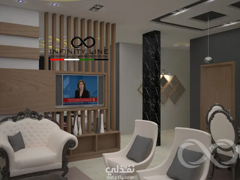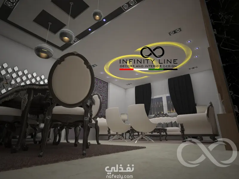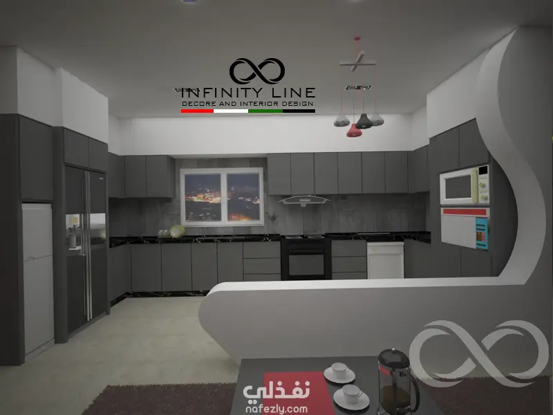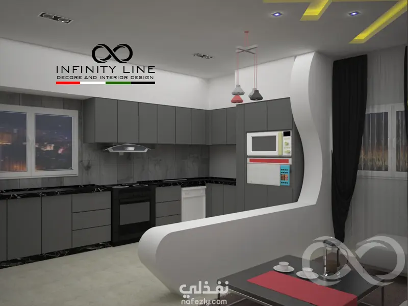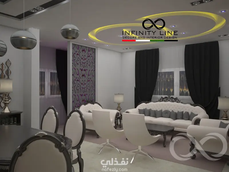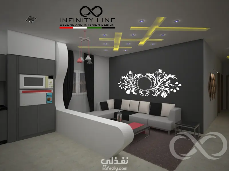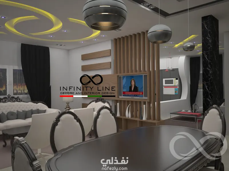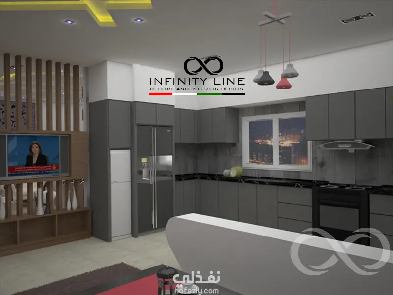 العمل عبارة عن تصميم لغرفة المعيشة والجلوس والمطبخ وطاولة الطعام في مساحة80 متر مربع مفتوحة على بعض