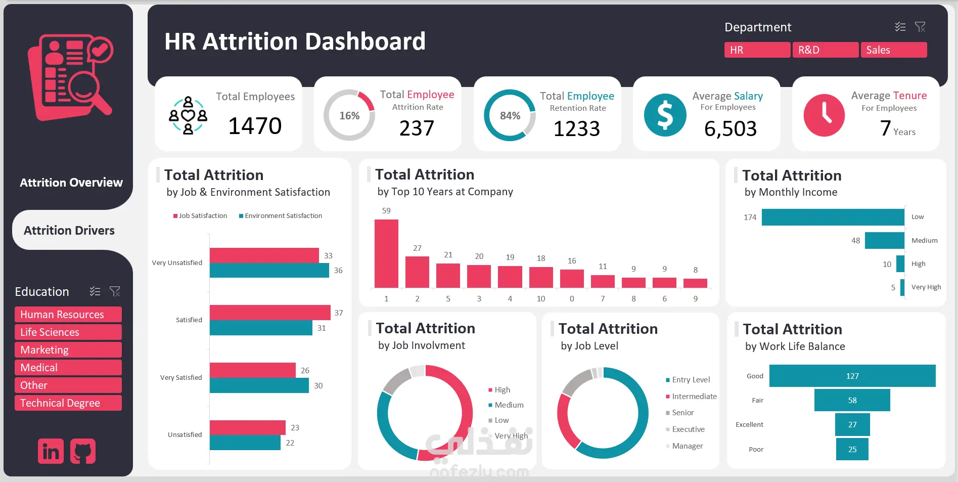 مشروع متقدم في تحليل الموارد البشرية بإستخدام اكسيل يهدف إلى دراسة سبب إستقاله الموظفين داخل المؤسسة. تم تصميم الداشبورد من صفحتين (نظرة عامة ومحركات الاستقالة) لتزويد قسم HR برؤية شاملة حول الأسباب التي تدفع الموظفين للمغادرة، مما يساعد في وضع استراتيجيات فعالة لزيادة معدل الاستبقاء (Retention Rate). الخطوات التقنية المنفذة: هندسة وتنظيف البيانات: استخدام Power Query لمعالجة بيانات الموظفين، وضمان دقة التصنيفات (مثل الفئات العمرية، مستويات الدخل، والمسافة عن العمل). التحليل الإحصائي (DAX): بناء مقاييس حسابية دقيقة لحساب معدل الاستقالات (Attrition Rate) الذي بلغ 16%، ومعدل الاستبقاء، ومتوسط الرواتب وسنوات الخدمة. تصميم واجهة المستخدم (UI/UX): إنشاء نظام ملاحة (Navigation) بين صفحة "Overview" وصفحة "Drivers" لتوفير تجربة مستخدم سلسة وتفاعلية. تفاصيل صفحات لوحة التحكم: - صفحة النظرة العامة (Attrition Overview): تركز على الخصائص الديموغرافية للمستقيلين (الجنس، الحالة الاجتماعية، العمر، والقسم)، وتكشف أن قطاع الأبحاث والتطوير (R&D) هو الأكثر تأثراً بالاستقالات بنسبة 56%. - صفحة محركات الاستقالة (Attrition Drivers): تحلل العوامل النفسية والمادية، مثل مدى الرضا عن بيئة العمل، التوازن بين العمل والحياة (Work-Life Balance)، ومستوى الدخل الشهري. أبرز النتائج والرؤى (Key Insights): - سنة الاستقالة الحرجة: كشف التحليل أن أعلى معدل استقالات يحدث بعد السنة الأولى من العمل (59 موظفاً)، مما يشير إلى الحاجة لتحسين عملية دمج الموظفين الجدد (Onboarding). - عامل الدخل المادي: هناك علاقة مباشرة بين انخفاض الدخل وزيادة الاستقالات، حيث سجل الموظفون ذوو "الدخل المنخفض" أعلى معدل مغادرة (174 موظفاً). - تأثير الحالة الاجتماعية: الموظفون "العزاب" (Single) هم الأكثر عرضة لترك العمل بنسبة 51% مقارنة بالمتزوجين أو المطلقين. - الرضا الوظيفي: الموظفون الذين لديهم تقييم "منخفض جداً" في الرضا عن البيئة والعمل يمثلون الشريحة الأكبر في الاستقالات، مما يستدعي مراجعة ثقافة العمل الداخلية. الأدوات المستخدمة: Excel (Visualisation & Dashboarding) Power Query (Data Cleaning & Transformation) DAX (Advanced Measures & KPIs)