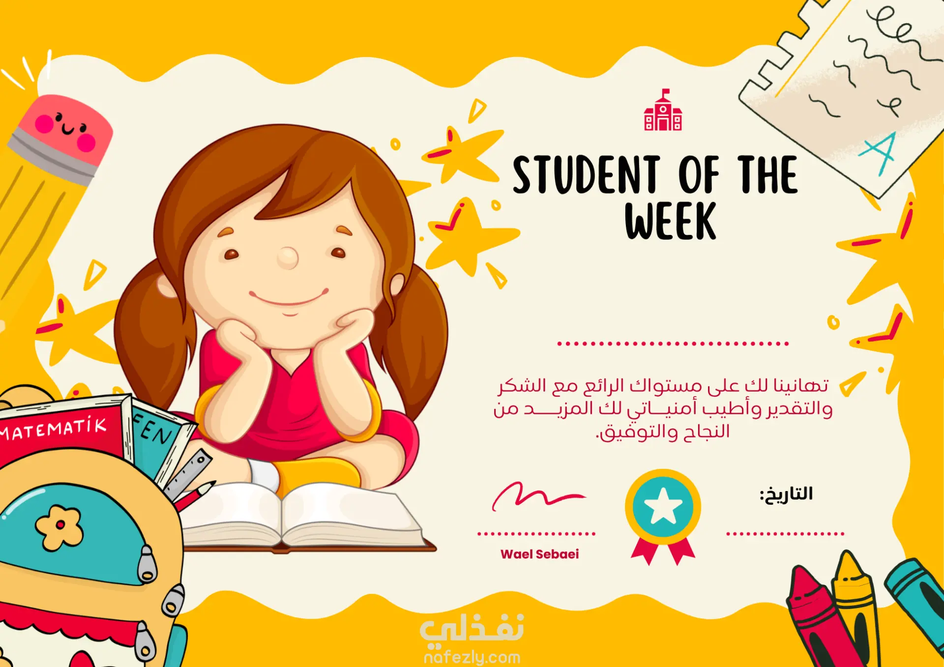 "مرحبًا، أقدر أساعدك في تصميم شهادة Student of the Week بشكل جذاب ومناسب لأطفال KG، مع ألوان مبهجة وتصميم لطيف يناسب الأطفال.
