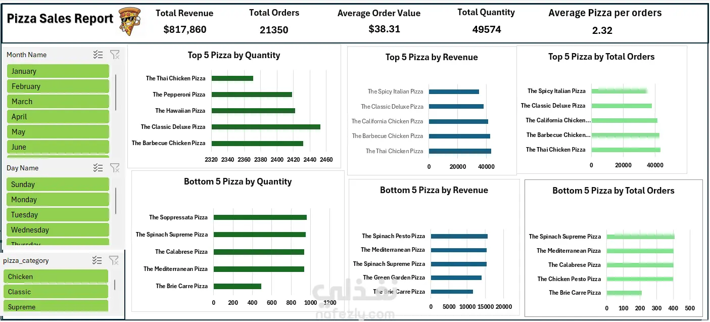 🍕 مشروع تحليل بيانات مبيعات متجر بيتزا (End-to-End Analysis) تحويل بيانات مبيعات ضخمة لمتجر بيتزا إلى لوحة تحكم (Dashboard) تفاعلية، تهدف إلى فهم سلوك العميل وتحديد المنتجات الأكثر ربحية لتحسين سلسلة التوريد وزيادة المبيعات. المهام التقنية (Data Pipeline): تنظيف البيانات (Data Cleaning): معالجة القيم المفقودة وتنسيق التواريخ والأوقات لضمان دقة التحليل. بناء مؤشرات الأداء (KPIs): حساب إجمالي الإيرادات، متوسط قيمة الطلب، وكمية الطلبات. التحليل المتقدم: استخدام الـ Pivot Tables لربط الفئات (Category) بالأحجام (Size) مع المبيعات. أبرز النتائج والرؤى (Key Insights): الأكثر مبيعاً: فئة الـ Classic هي المحرك الأساسي للإيرادات، مما يستوجب التركيز عليها في الحملات الإعلانية. تحليل الوقت: رصد ذروة الطلبات في ساعات المساء، مما يساعد في تنظيم شفتات الموظفين وسرعة التوصيل. مفارقة الربحية: اكتشاف أصناف ذات شعبية عالية ولكن بهامش ربح منخفض، مما استدعى اقتراح إعادة تسعير أو تغيير المكونات. الاتجاهات الشهرية: تتبع نمو المبيعات شهرياً لتحديد المواسم الراكدة ونقاط القوة.
