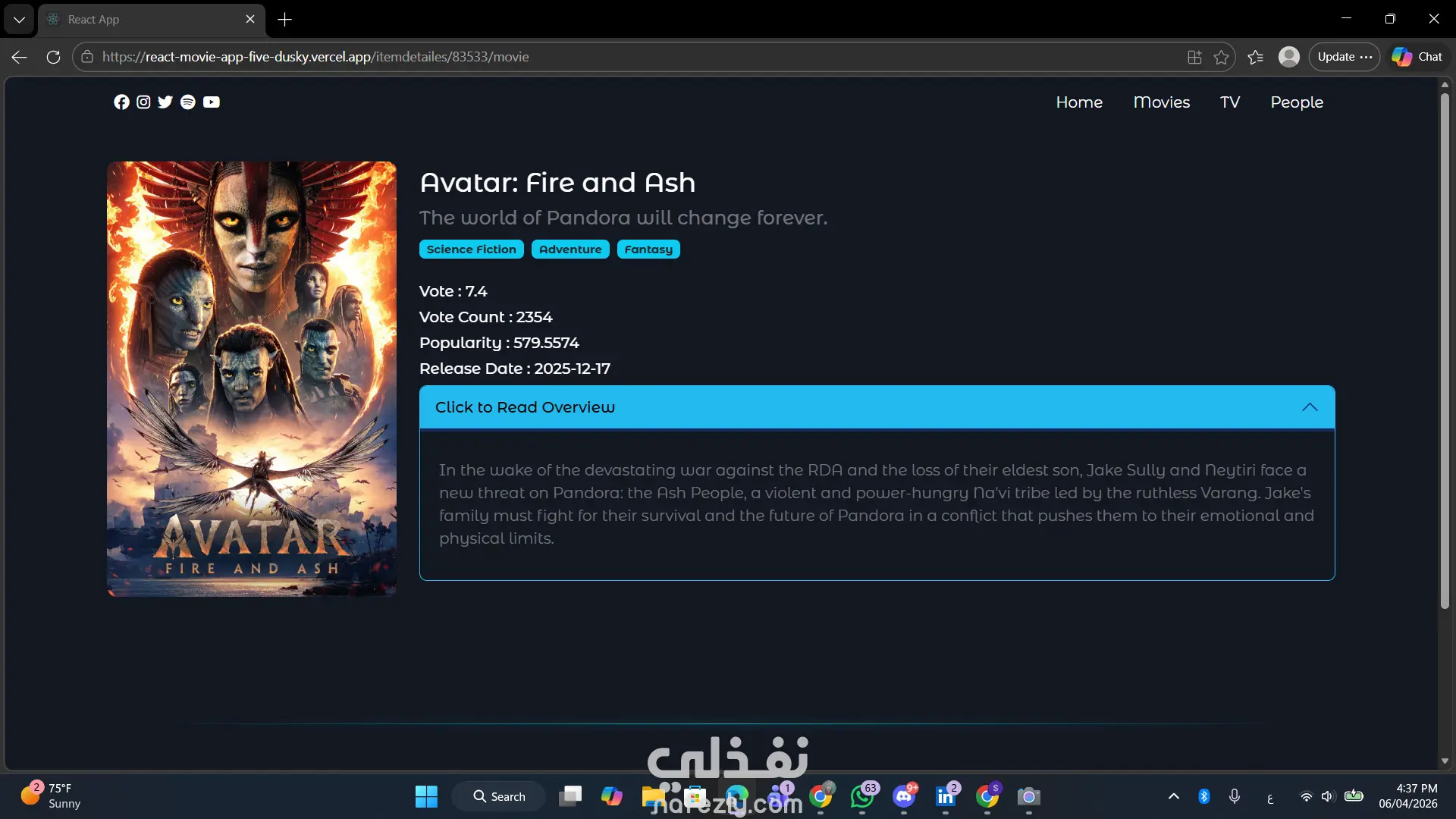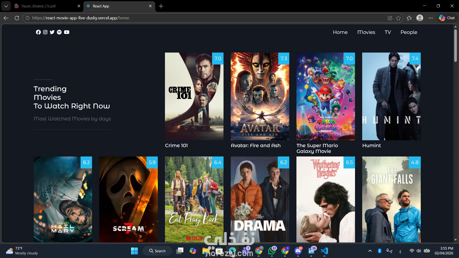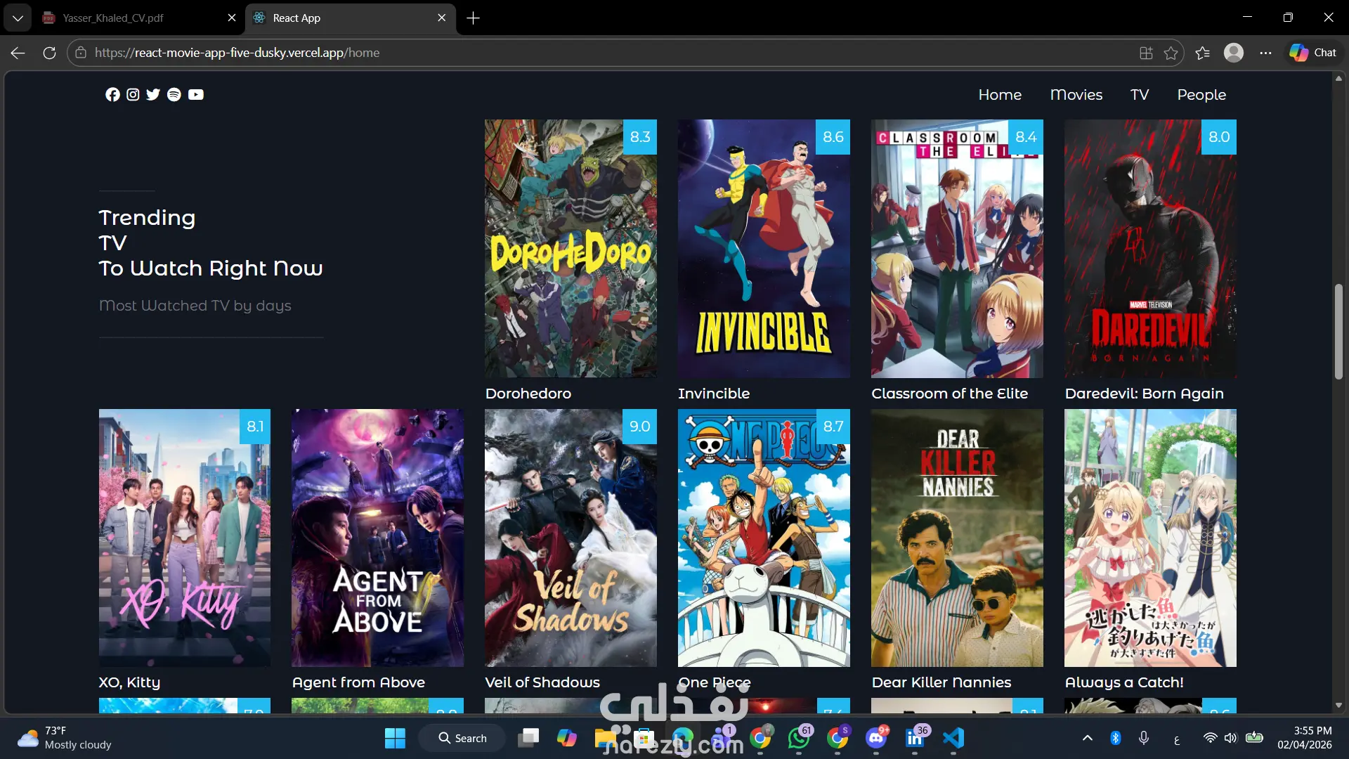 قمت بتطوير تطبيق ويب باستخدام React لعرض الأفلام والمسلسلات والأشخاص الأكثر شهرة باستخدام TMDb API.