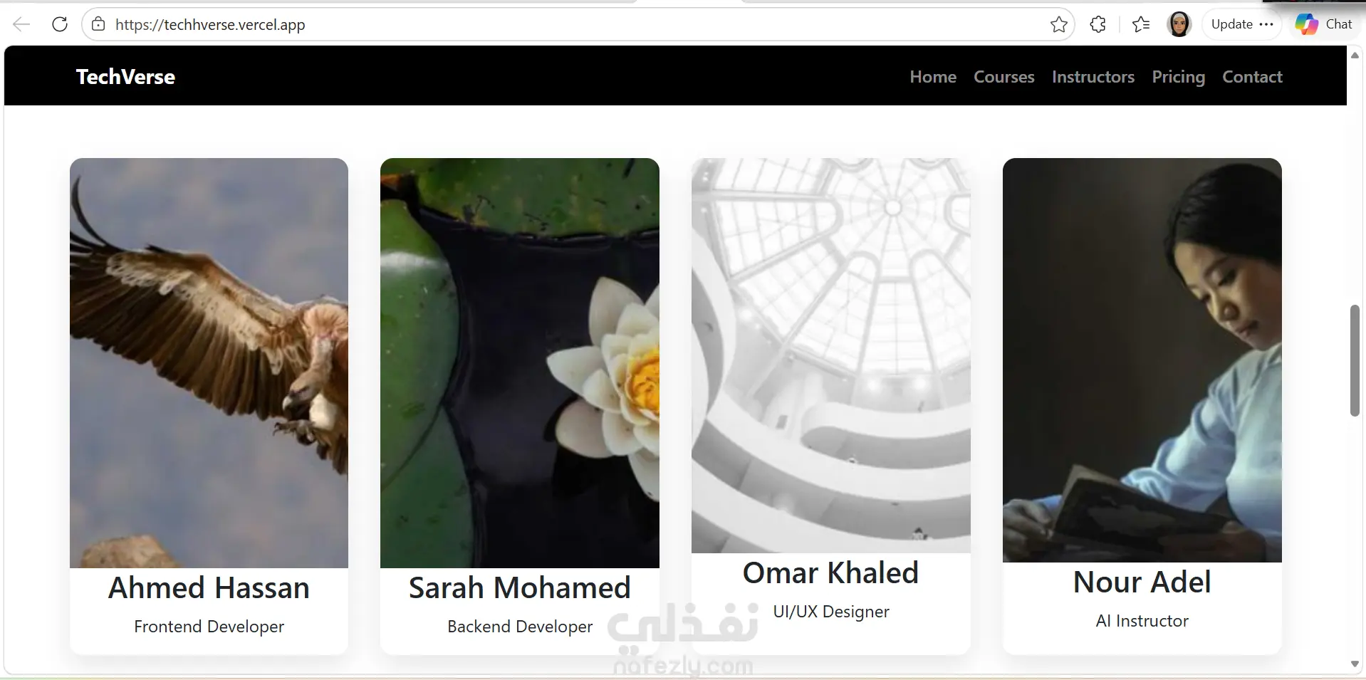 تُعدّ هذه الصفحة صفحة هبوط (Landing Page) مخصّصة لعرض دورات البرمجة، حيث تتيح للمستخدمين التعرّف على نخبة من المدرّسين في مجالات متعددة مثل تطوير الويب . تتضمّن الصفحة معلومات موجزة عن الدورات، و اسعارها، مع تصميم بسيط وجذّاب يسهّل على المستخدم اختيار الدورة المناسبة والتسجيل بسهولة. كما تحتوي الصفحة على بعض الأزرار والأيقونات التوضيحية التي تم استخدامها لأغراض تصميمية فقط، بهدف إبراز الشكل العام وتحسين تجربة العرض، دون تنفيذ وظائف تفاعلية فعلية، نظرًا لأن الصفحة تُعرض كنموذج (Demo).