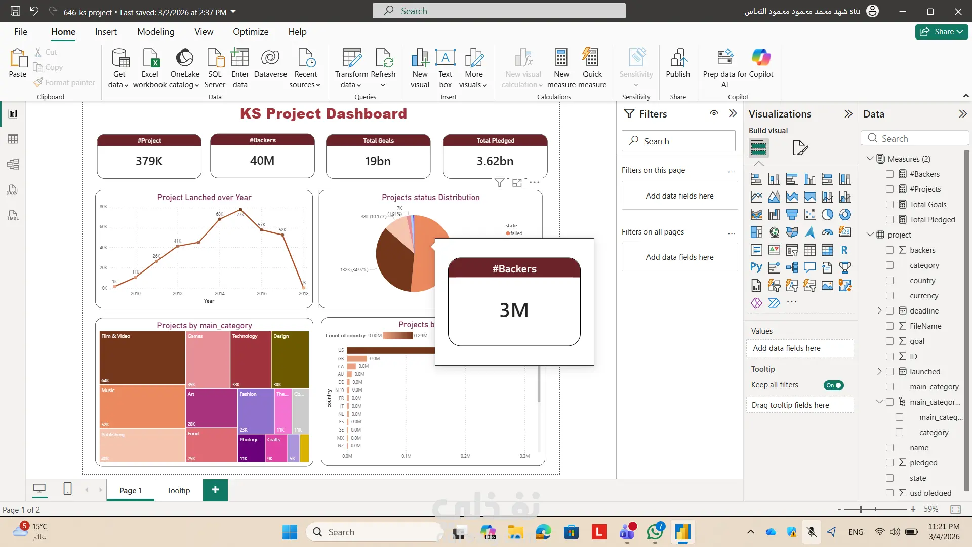 هذا المشروع عبارة عن لوحة تحكم تفاعلية لتحليل بيانات مشاريع التمويل الجماعي (Crowdfunding Dashboard) تم تصميمها باستخدام Power BI، بهدف تقديم رؤى شاملة حول أداء المشاريع واتجاهات التمويل.