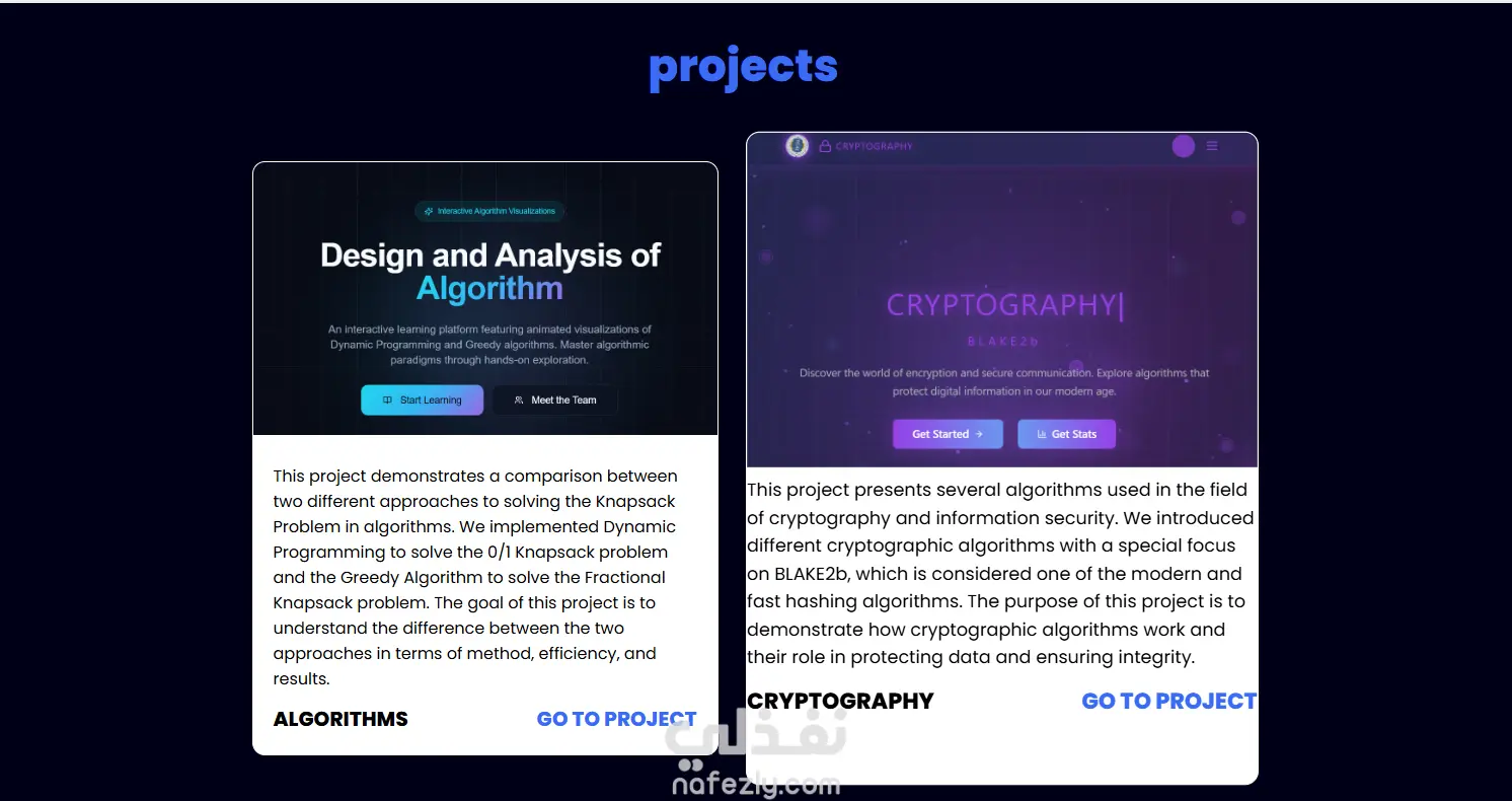 الموقع تم تطويره باستخدام HTML و CSS تصميم نظيف ومنظم يعرض الأعمال بطريقة جذابة متوافق مع جميع الأجهزة (Responsive Design) يحتوي على الصفحات الرئيسية: Services – Projects – Contact