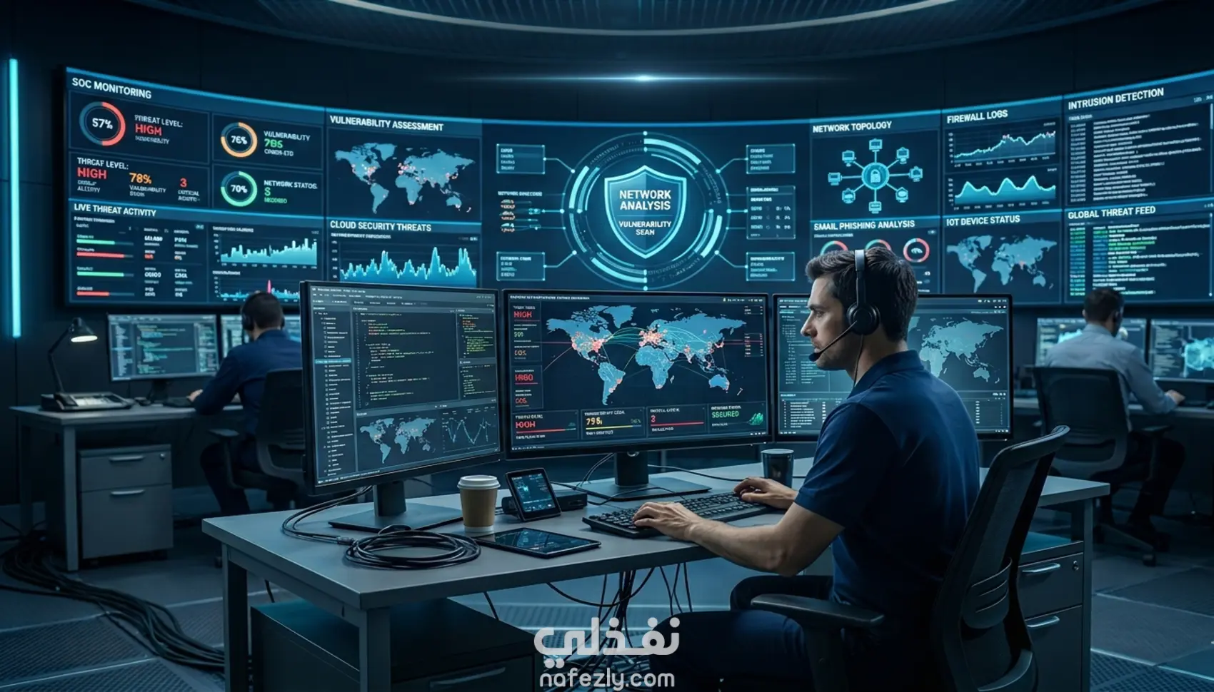 كما تتضمن الخدمة تحليل السجلات الأمنية (Logs) ومراقبة الأنشطة المشبوهة بأسلوب يشبه بيئة مراكز العمليات الأمنية (SOC)، مع استخدام أدوات مثل Wireshark لفحص حركة البيانات واكتشاف أي سلوك غير طبيعي داخل الشبكة.
