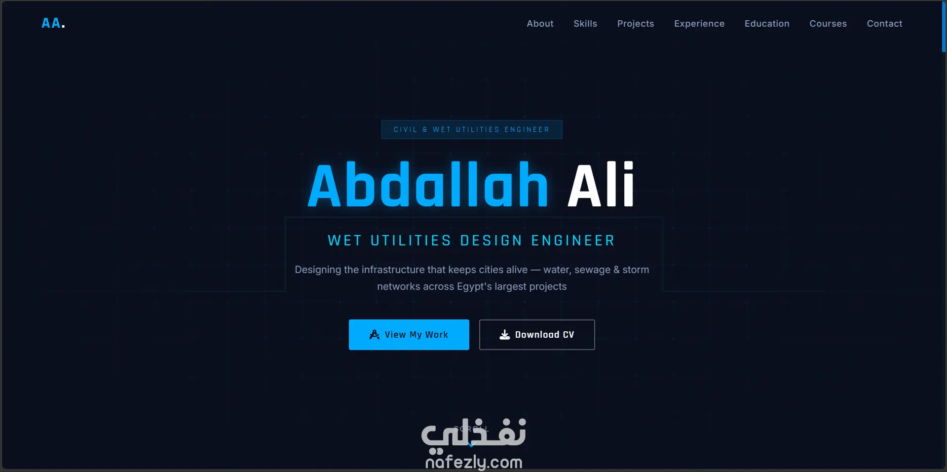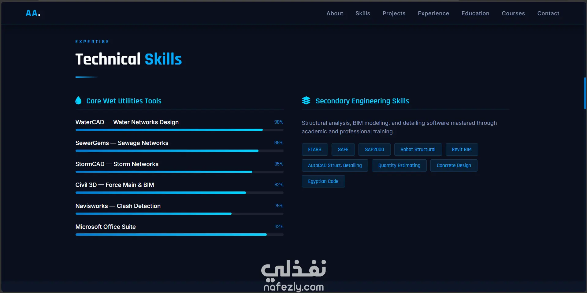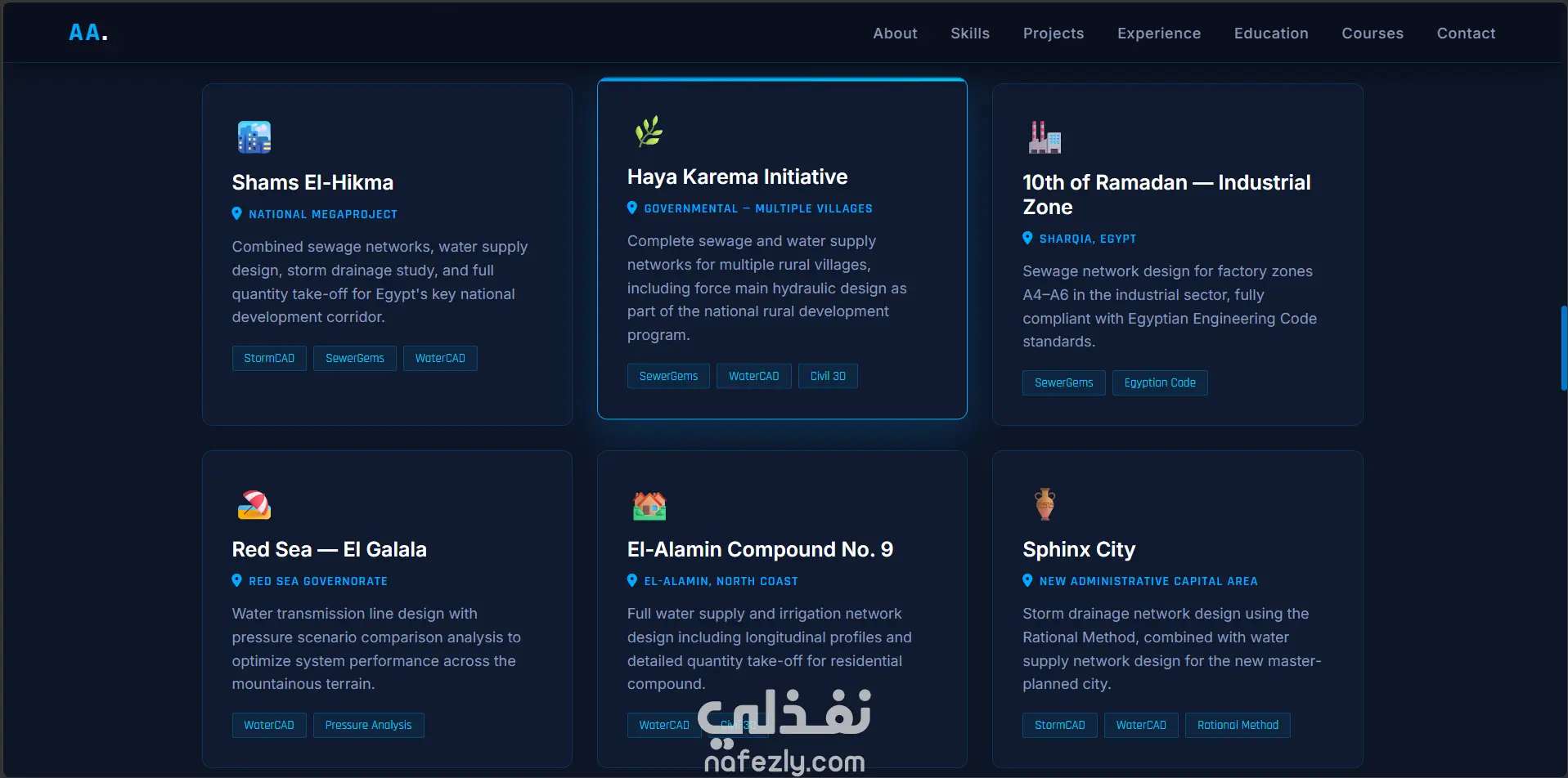 تصميم وبرمجة موقع ويب تعريفي متكامل يعرض السيرة الذاتية، المهارات التقنية، ومعرض المشاريع لمهندس مدني متخصص في تصميم شبكات المياه .