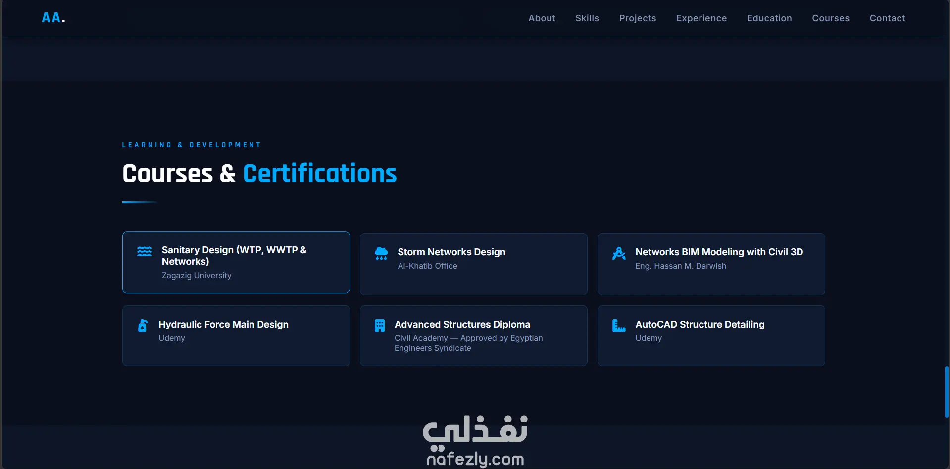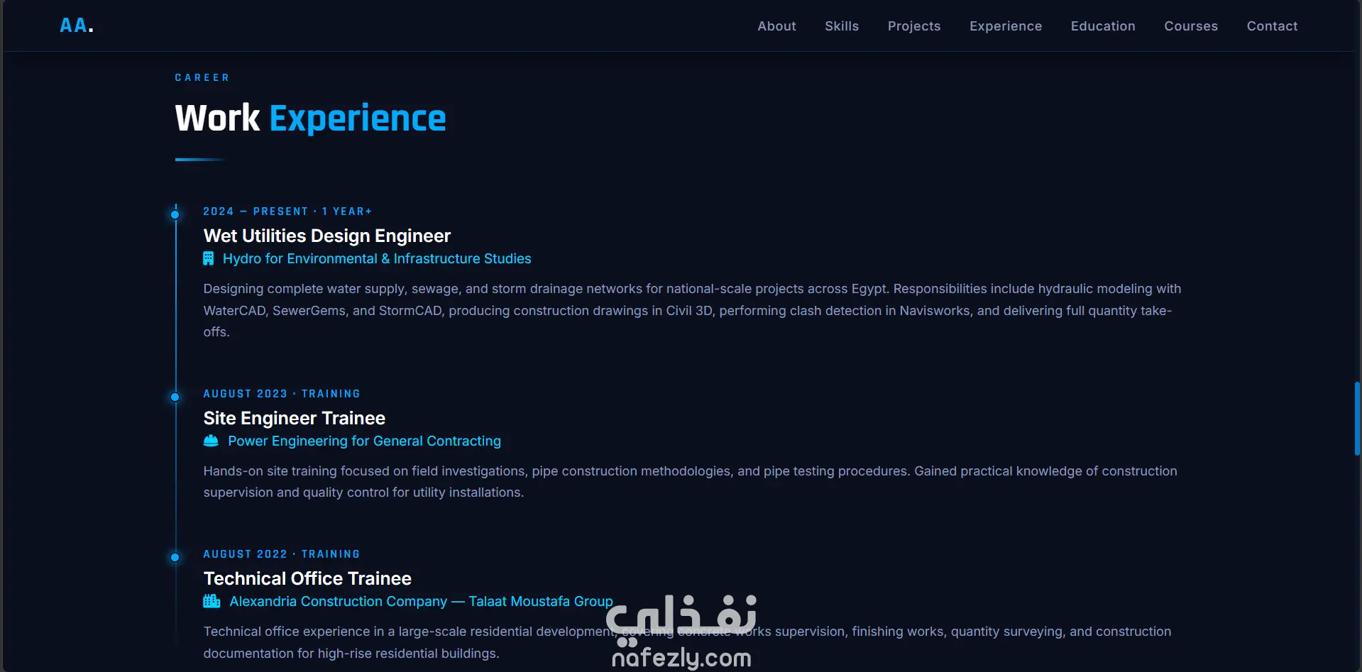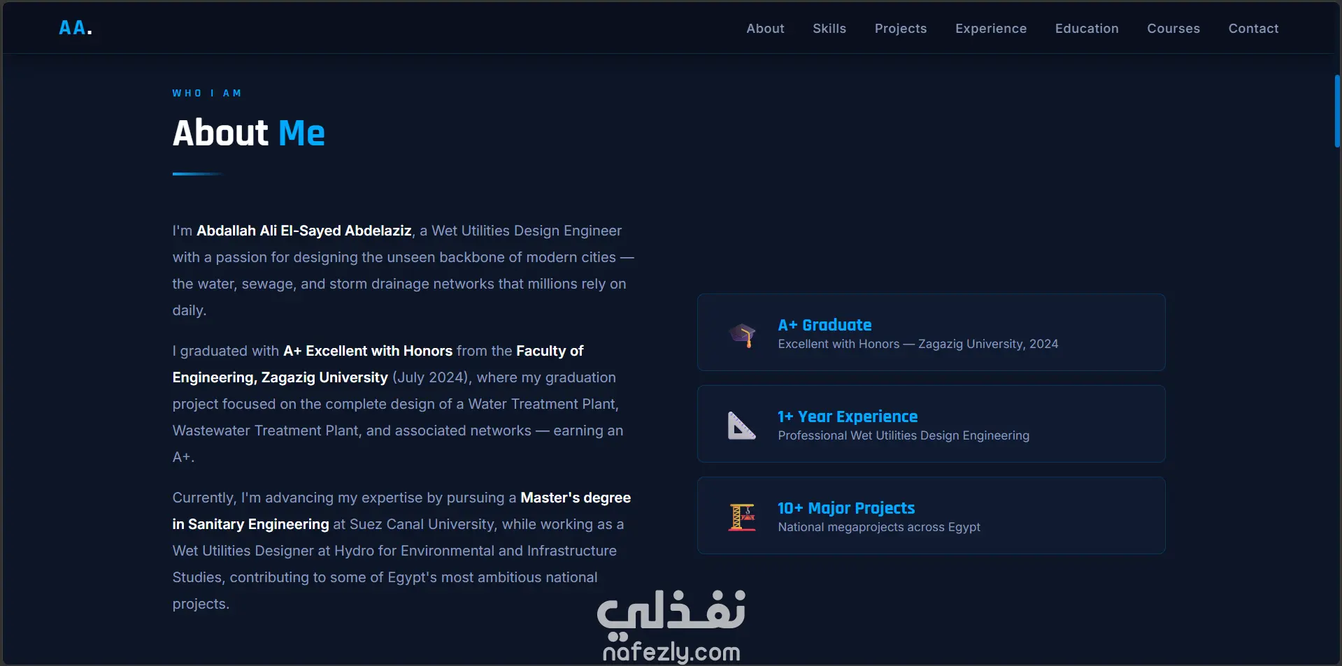 تصميم وبرمجة موقع ويب تعريفي متكامل يعرض السيرة الذاتية، المهارات التقنية، ومعرض المشاريع لمهندس مدني متخصص في تصميم شبكات المياه .