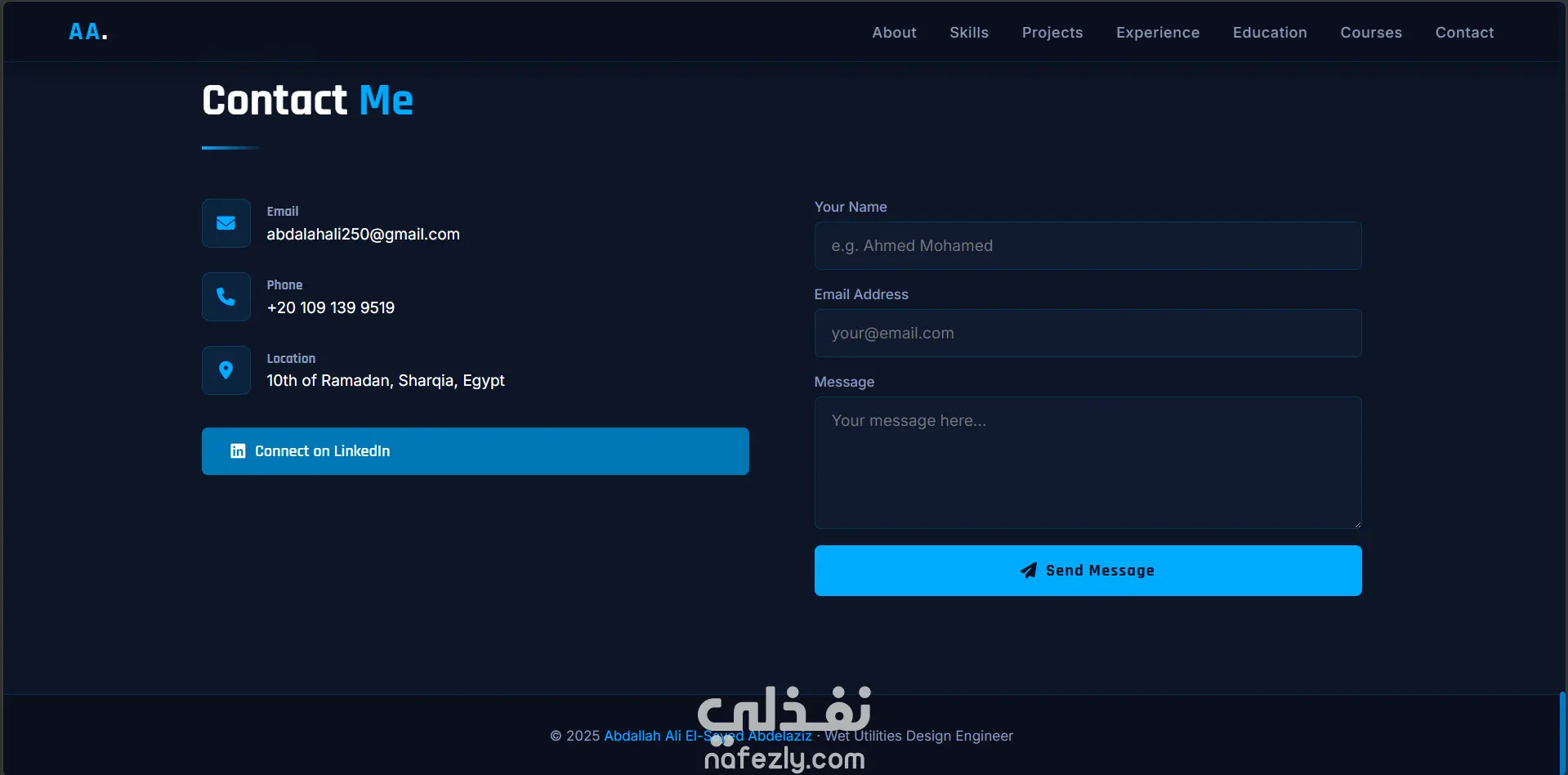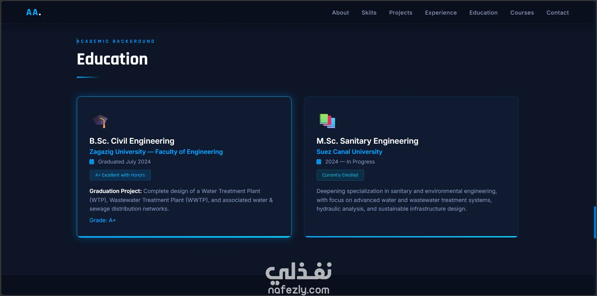 يتميز الموقع بتصميم عصري واحترافي، ويعمل بكفاءة على جميع الشاشات والأجهزة (Responsive Design). يحتوي الموقع على أقسام تفاعلية تشرح الخبرات العملية، المؤهلات الأكاديمية، والمهارات البرمجية والهندسية، بالإضافة إلى واجهة لعرض المشاريع السابقة وتسهيل التواصل لاقتناص الفرص الوظيفية والعمل الح