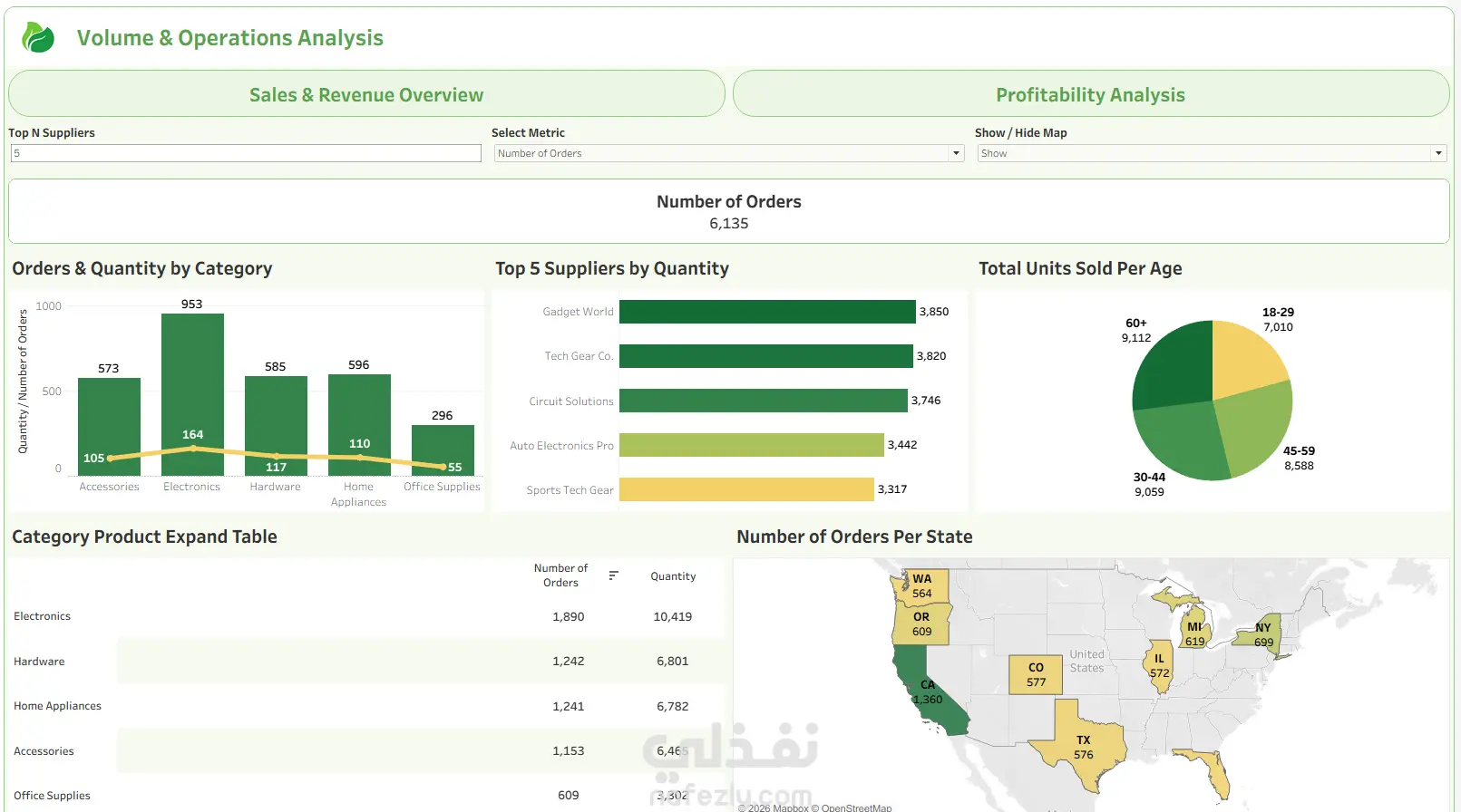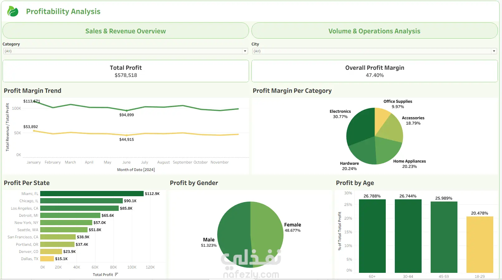 داشبورد تفاعلي متكامل من 3 صفحات تم تطويره بـ Tableau لتحليل بيانات مبيعات متجر تجزئة خلال عام 2024. الصفحة الأولى – Sales & Revenue Overview: تعرض إجمالي الإيرادات ($1,220,491)، التكاليف، والوحدات المباعة (33,769)، مع تحليل الأداء الشهري، توزيع المبيعات حسب الفئات، أفضل 5 منتجات، والإيرادات حسب المنطقة مع خريطة تفاعلية. الصفحة الثانية – Profitability Analysis: تحليل إجمالي الأرباح ($578,518) وهامش الربح (47.40%)، مع توزيع الأرباح حسب الفئات والمدن والجنس والفئات العمرية. الصفحة الثالثة – Volume & Operations Analysis: تحليل 6,135 طلب حسب الفئات والموردين، جدول تفصيلي للمنتجات، وخريطة توزيع الطلبات جغرافياً. أبرز ما يميز هذا العمل: - تصميم بصري احترافي بهوية موحدة - فلاتر تفاعلية ديناميكية - حقول محسوبة لمؤشرات الأداء الرئيسية - Dashboard Actions للتنقل السلس بين الصفحات