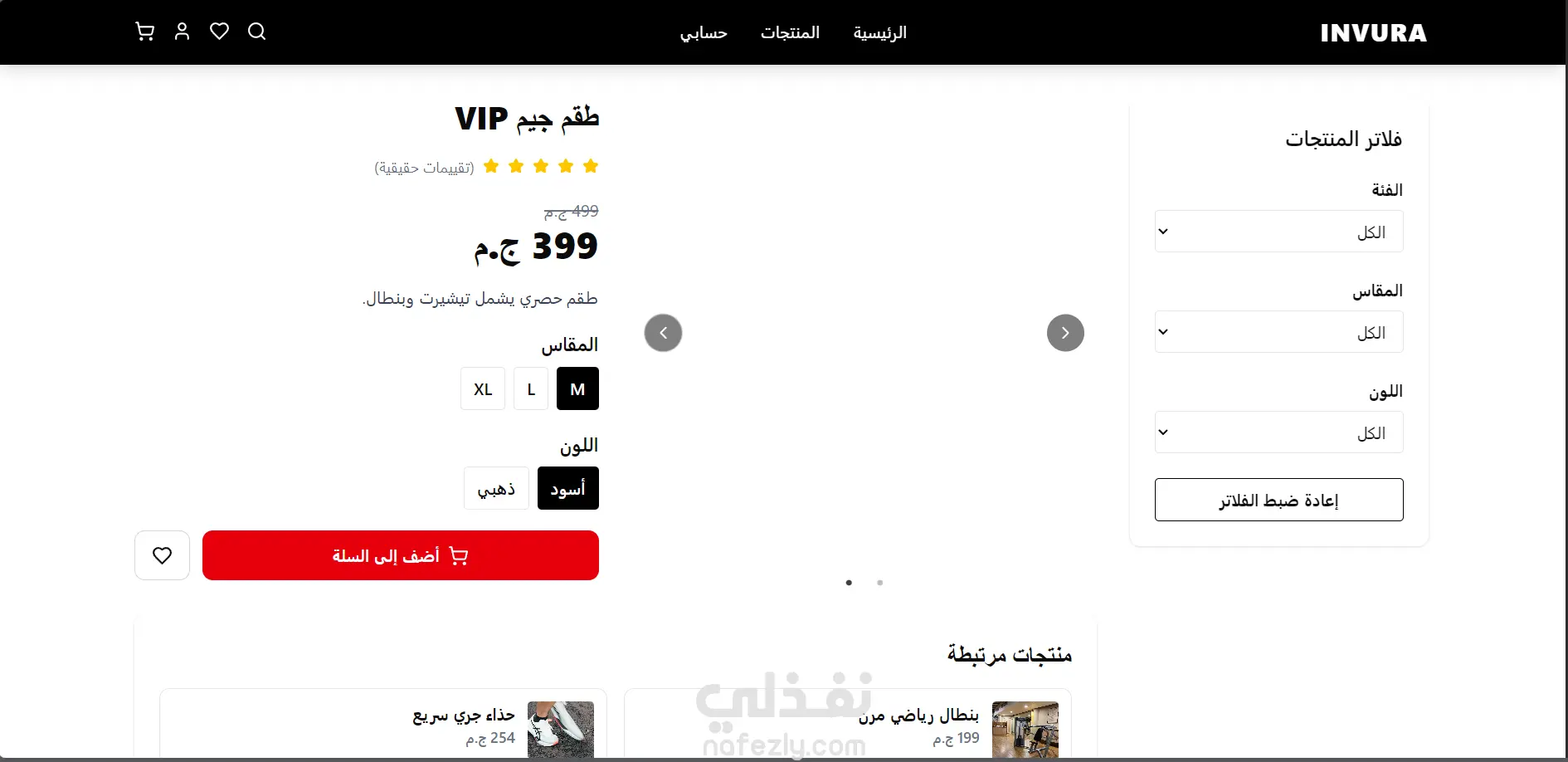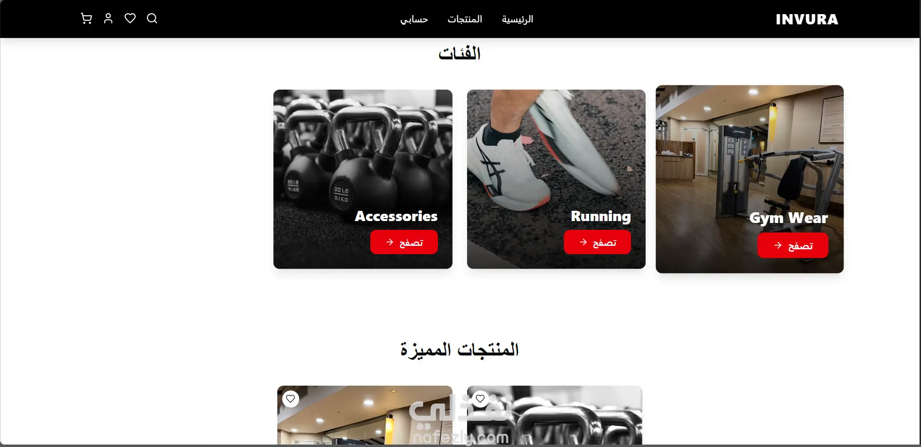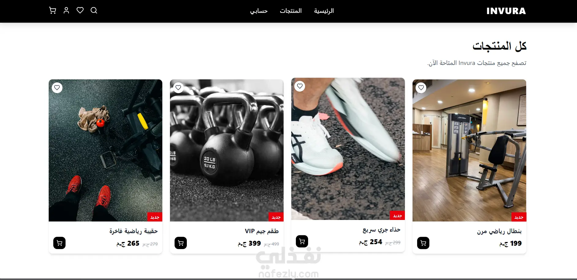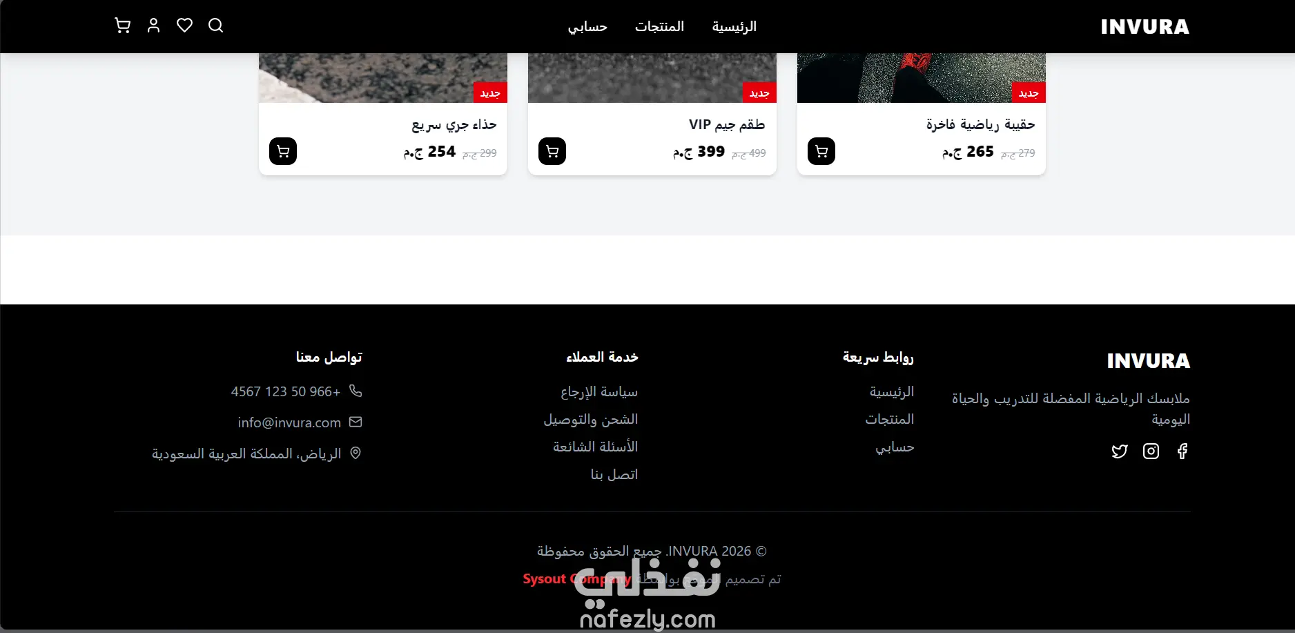 هذا مشروع متجر إلكتروني رياضي عربي باسم Invura. الهدف من المشروع كان بناء منصة تسوق متكاملة تعرض منتجات أصلية بجودة عالية مع تجربة مستخدم عربية سلسة. الموقع يشمل: - واجهة رئيسية جذابة وسهلة الاستخدام - أقسام للمنتجات والفئات الرياضية (Accessories, Running, Gym Wear) - نظام تسجيل دخول وحساب شخصي - لوحة تحكم لإدارة المنتجات والمخزون - تصميم متجاوب يعمل على جميع الأجهزة (موبايل، تابلت، كمبيوتر)