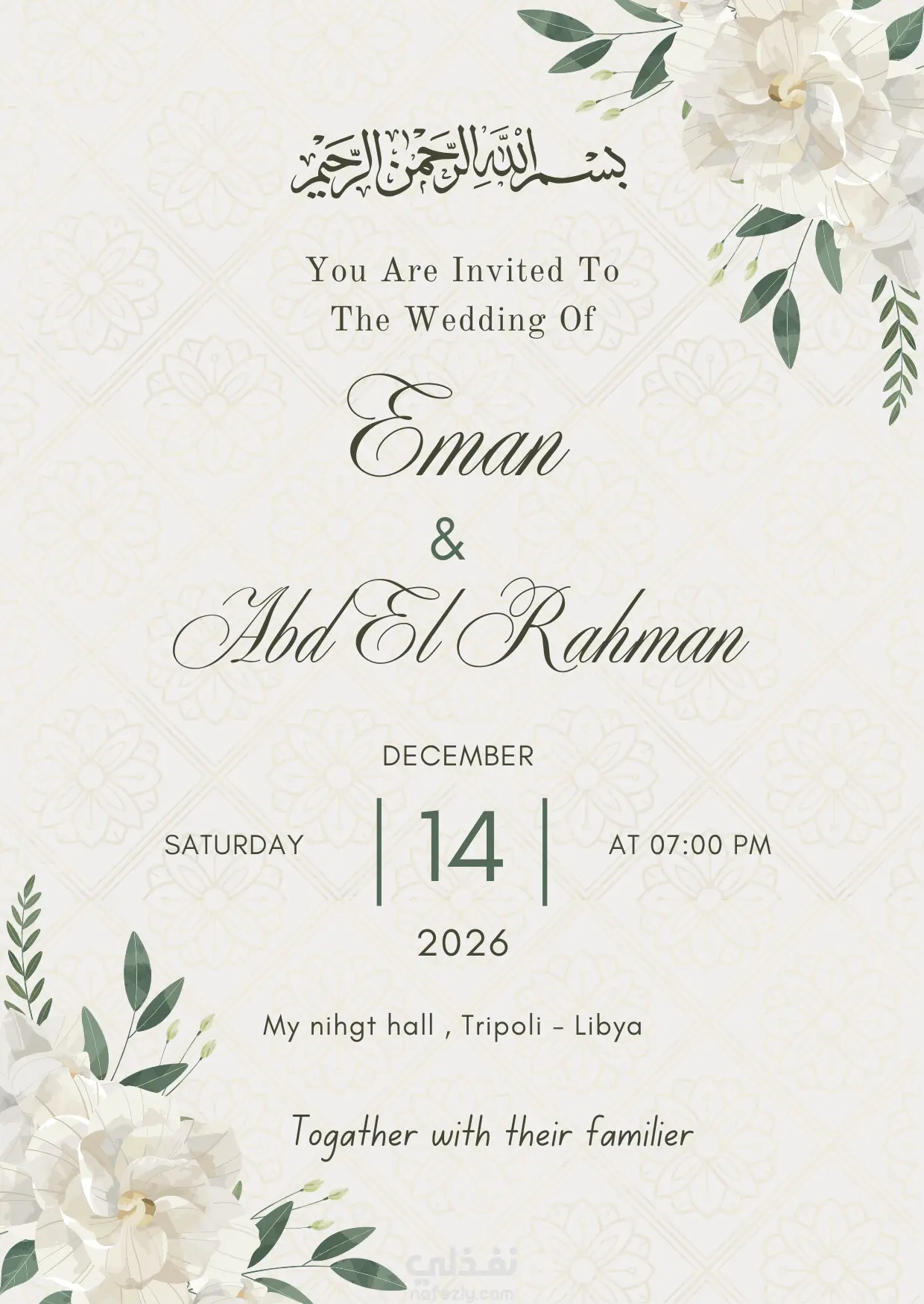 تصميم دعوة زفاف أنيقة وفاخرة، جاهزة للطباعة أو الاستخدام الرقمي، تشمل: اسم العروسين، تاريخ الزفاف، مكان الحفل، نص الدعوة، مع إمكانية التعديل حتى الرضا التام. التسليم بصيغة PNG وJPG عالية الجودة.