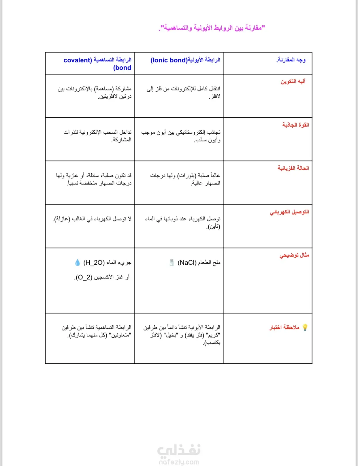 تصميم وتنسيق جدول مقارنة تعليمي (الروابط الكيميائية)"