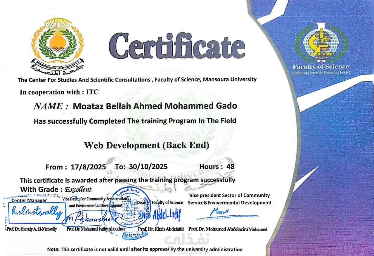 شهاده في تطوير الواجهه الخلفية للمواقع باستخدام PHP مقدمة من جامعة المنصورة المصرية بتقدير "ممتاز" لمشروع التخرج .