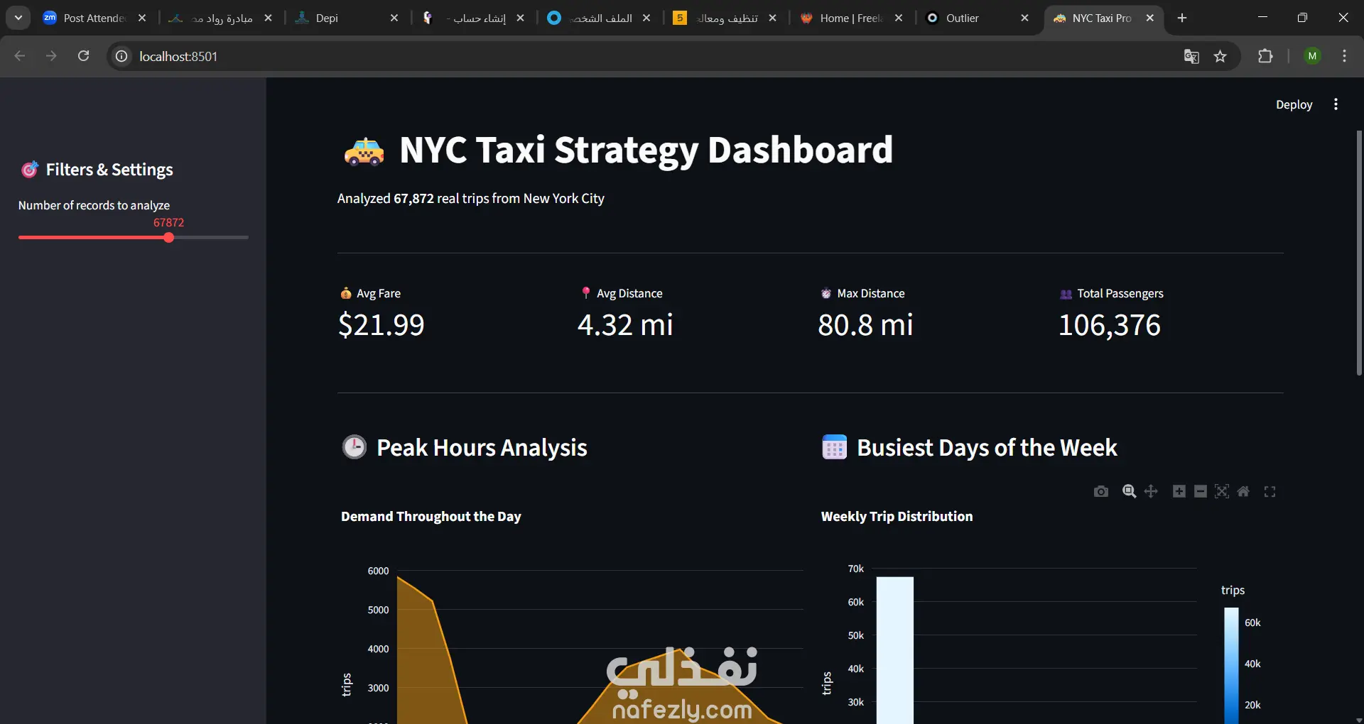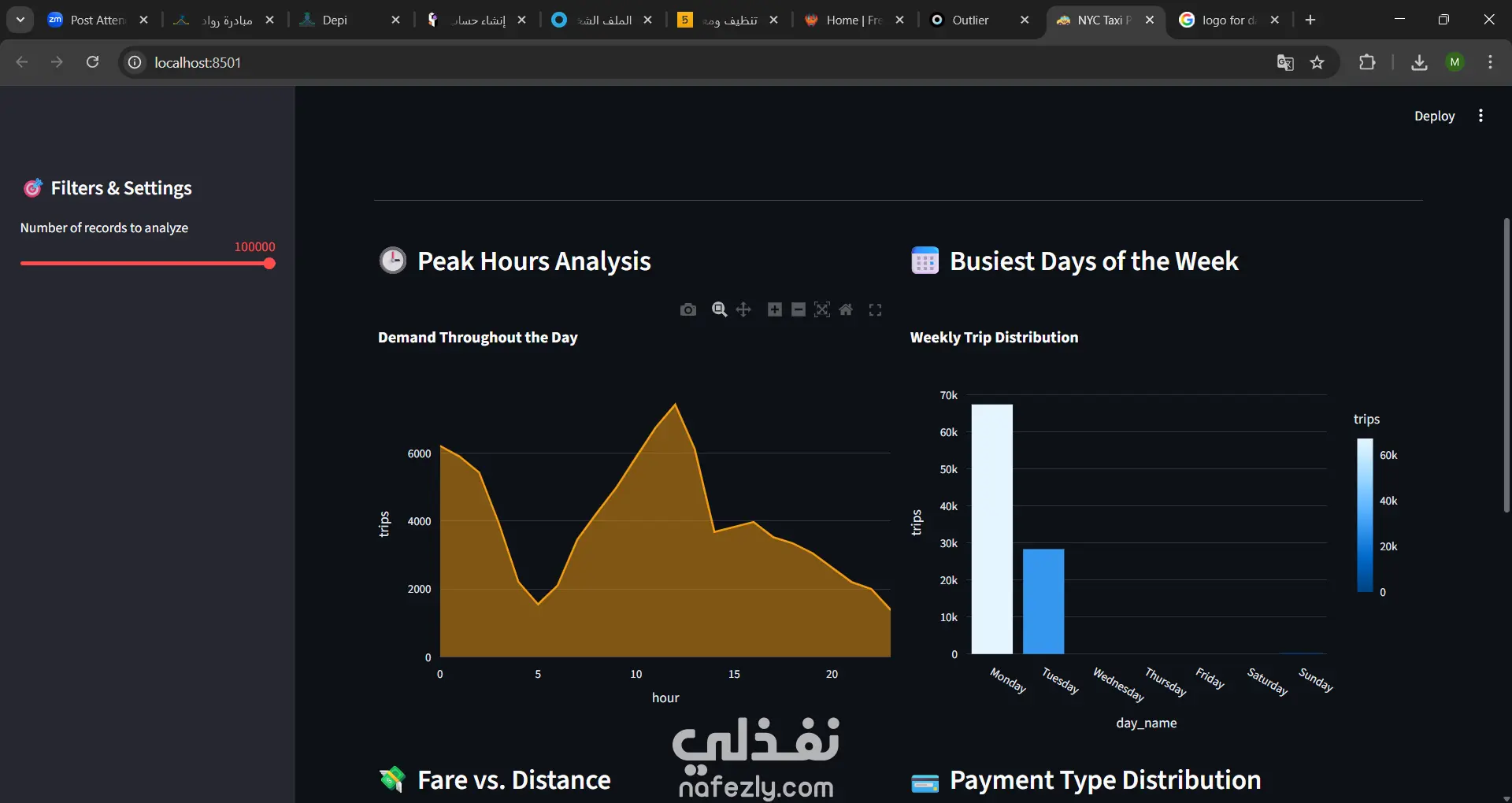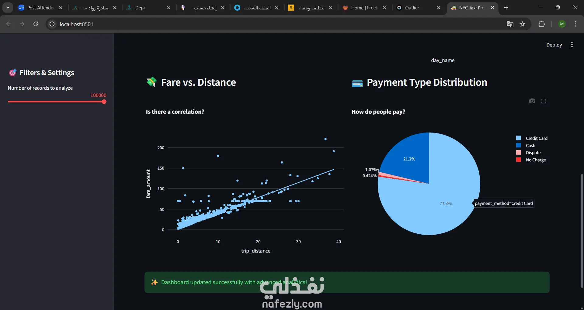بناء نظام معالجة وتحليل بيانات (Data Pipeline) فائق السرعة يعمل بالكامل على الجهاز المحلي. المشروع يركز على استخدام أدوات حديثة مثل DuckDB و Parquet لتحليل ملايين السجلات من بيانات تاكسي نيويورك الحقيقية (NYC Taxi Data) بكفاءة تتخطى الطرق التقليدية بمرات مضاعفة.