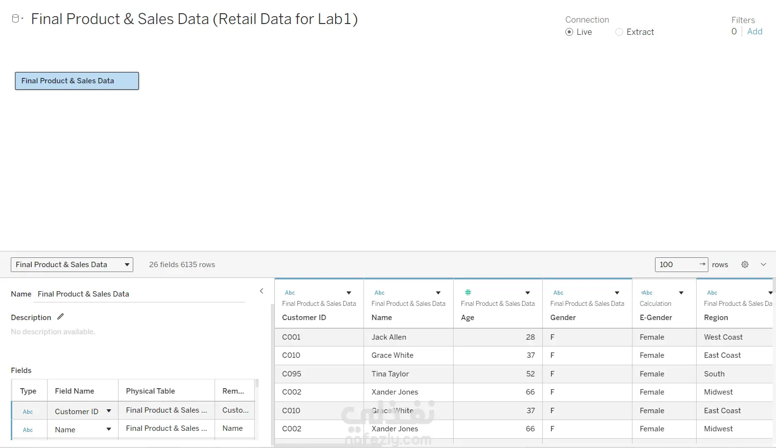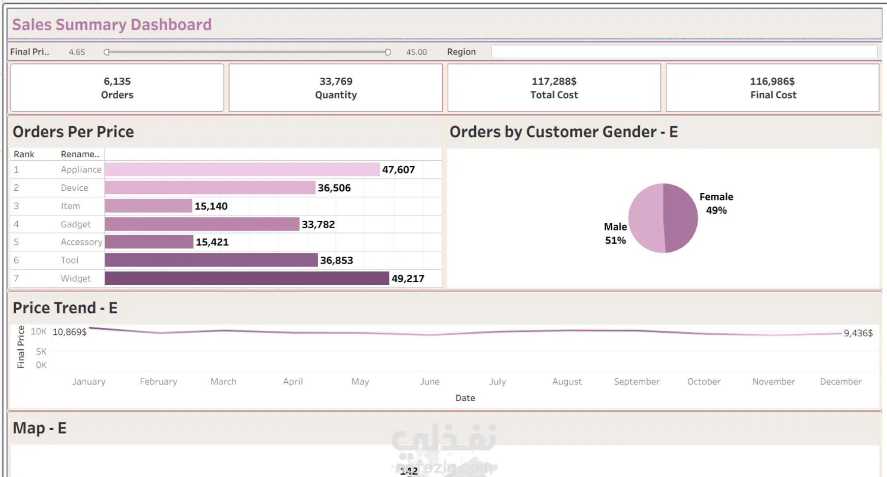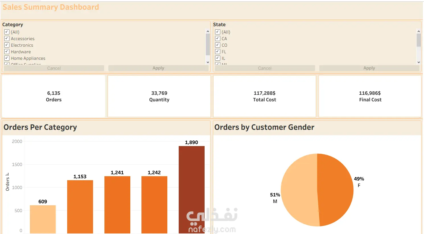معالجة وتنظيف البيانات وتجهيزها للاستخدام، مع إنشاء Data Model مبسط لتنظيم العلاقات بين الجداول. تصميم Dashboard صفحه واحده تفاعلية ومخصصة باستخدام Tableau لعرض الأداء بشكل واضح وسهل الفهم. تقديم تحليل لمؤشرات الأداء الرئيسية (KPIs 4) الخاصة بالمبيعات أو الأداء العام. يشمل الخدمة تعديلين مجانًا بعد التسليم، وأي تعديل إضافي يُحسب كإضافة. تتكون الـ Dashboard من صفحة تحتوي على 5 رسوم بيانية و 3 فلاتر.