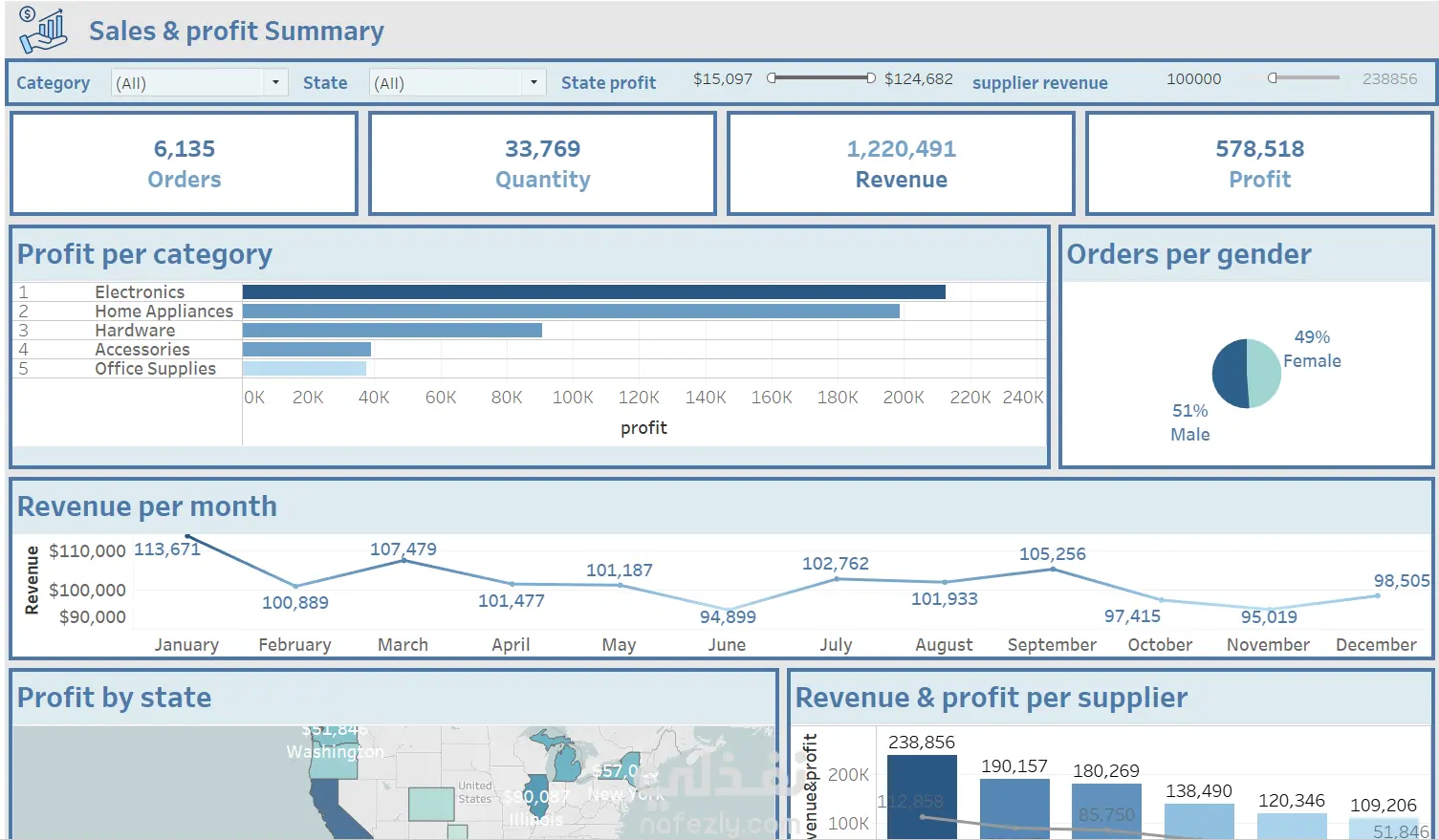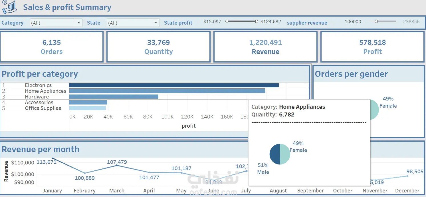 داشبورد تفاعلي مصمم لتحليل الأداء المالي والتجاري، يهدف إلى تقديم رؤى سريعة وشاملة حول مؤشرات الأداء الرئيسية (KPIs) وسلوك المستهلكين لتسهيل اتخاذ القرارات المبنية على البيانات. أبرز التحليلات المتضمنة: ملخص الأداء العام: تتبع فوري لإجمالي الإيرادات (1.2M+ دولار)، الأرباح، وعدد الطلبات. تحليل الربحية: تصنيف الأرباح حسب فئات المنتجات، حيث تصدرت "الإلكترونيات" القائمة. التوزيع الجغرافي: خريطة تفاعلية توضح الولايات الأكثر تحقيقاً للربح (مثل إلينوي ونيويورك). التحليل الزمني: مخطط خطي لمراقبة تذبذب الإيرادات شهرياً على مدار العام. بيانات الموردين والمستهلكين: مقارنة كفاءة الموردين وتحليل ديموغرافي للطلبات حسب النوع.