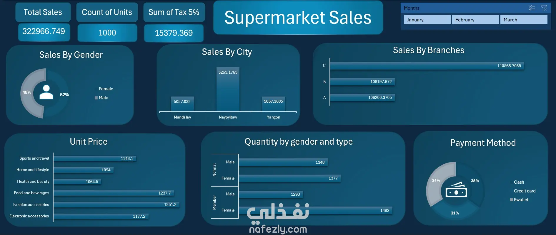 مشروع تحليل بيانات لسوبرماركت تم جلب البيانات من موقع kaggle أهم ما يقدمه المشروع: تحليل إجمالي المبيعات وإجمالي عدد الوحدات المباعة حساب إجمالي الضريبة (5%) بشكل تلقائي تحليل المبيعات حسب: المدن (Sales by City) الفروع (Branches) نوع المنتجات (Categories) الجنس (Male / Female) تحليل متوسط أسعار المنتجات حسب الفئة تحليل الكميات حسب نوع العميل (Member / Normal) والجنس عرض طرق الدفع الأكثر استخدامًا (Cash – Credit Card – E-Wallet) تصميم Dashboard احترافي بألوان متناسقة وتجربة استخدام واضح