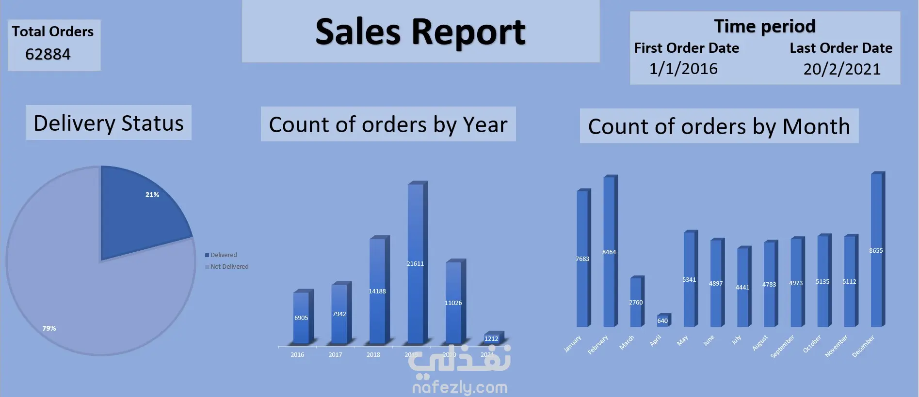 مشروع تحليل بيانات لسوبرماركت تم جلب البيانات من موقع kaggle أهم ما يقدمه المشروع: تحليل إجمالي عدد الطلبات خلال فترة زمنية كاملة تحديد أول وآخر تاريخ للطلبات لمعرفة نطاق البيانات تحليل حالة التوصيل (تم التوصيل / لم يتم التوصيل) تحليل عدد الطلبات حسب: السنوات (Orders by Year) الشهور (Orders by Month) اكتشاف اتجاهات النمو والتغير في حجم الطلبات بمرور الوقت تصميم Dashboard احترافي بألوان متناسقة وتجربة استخدام واضح