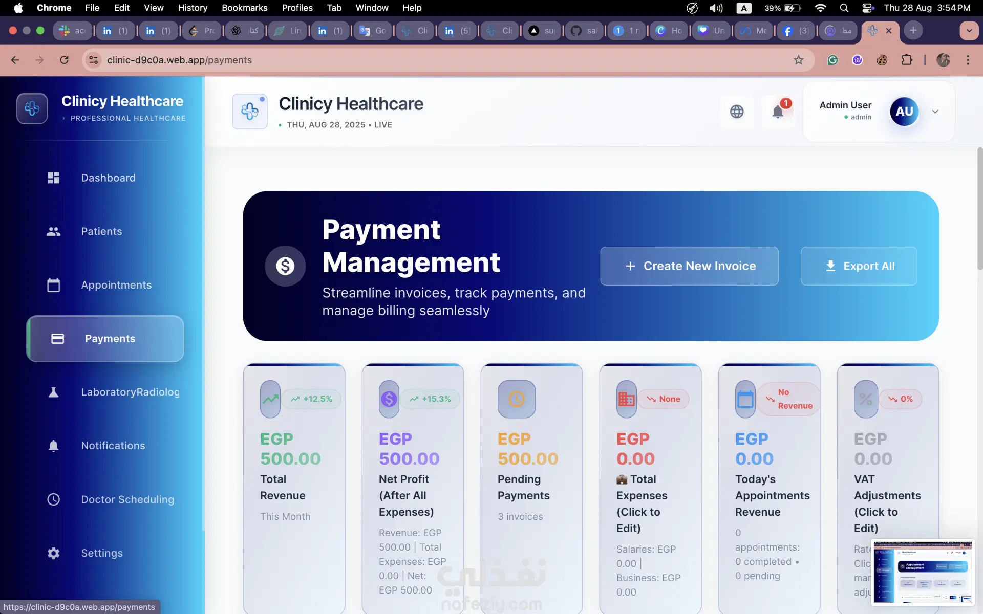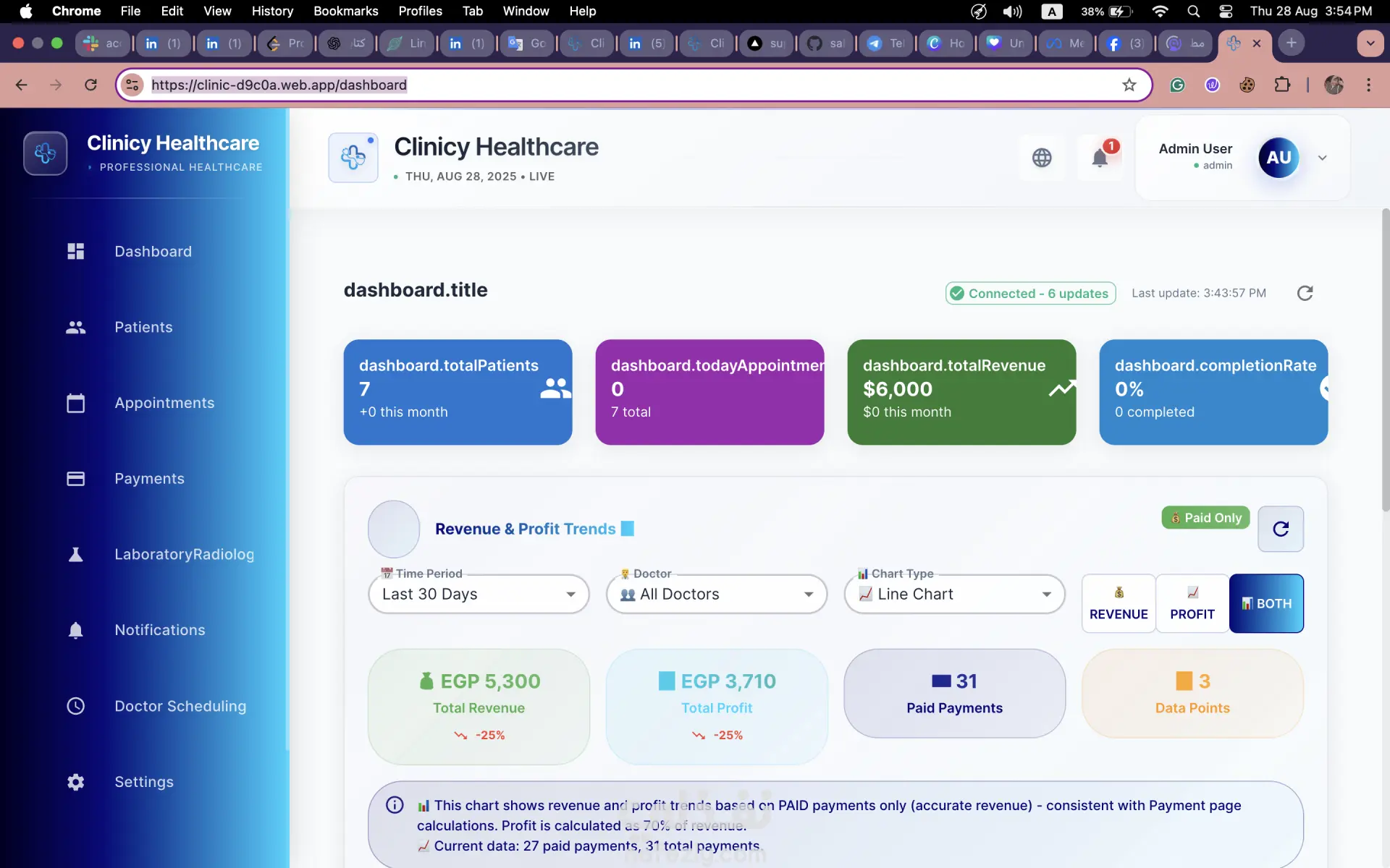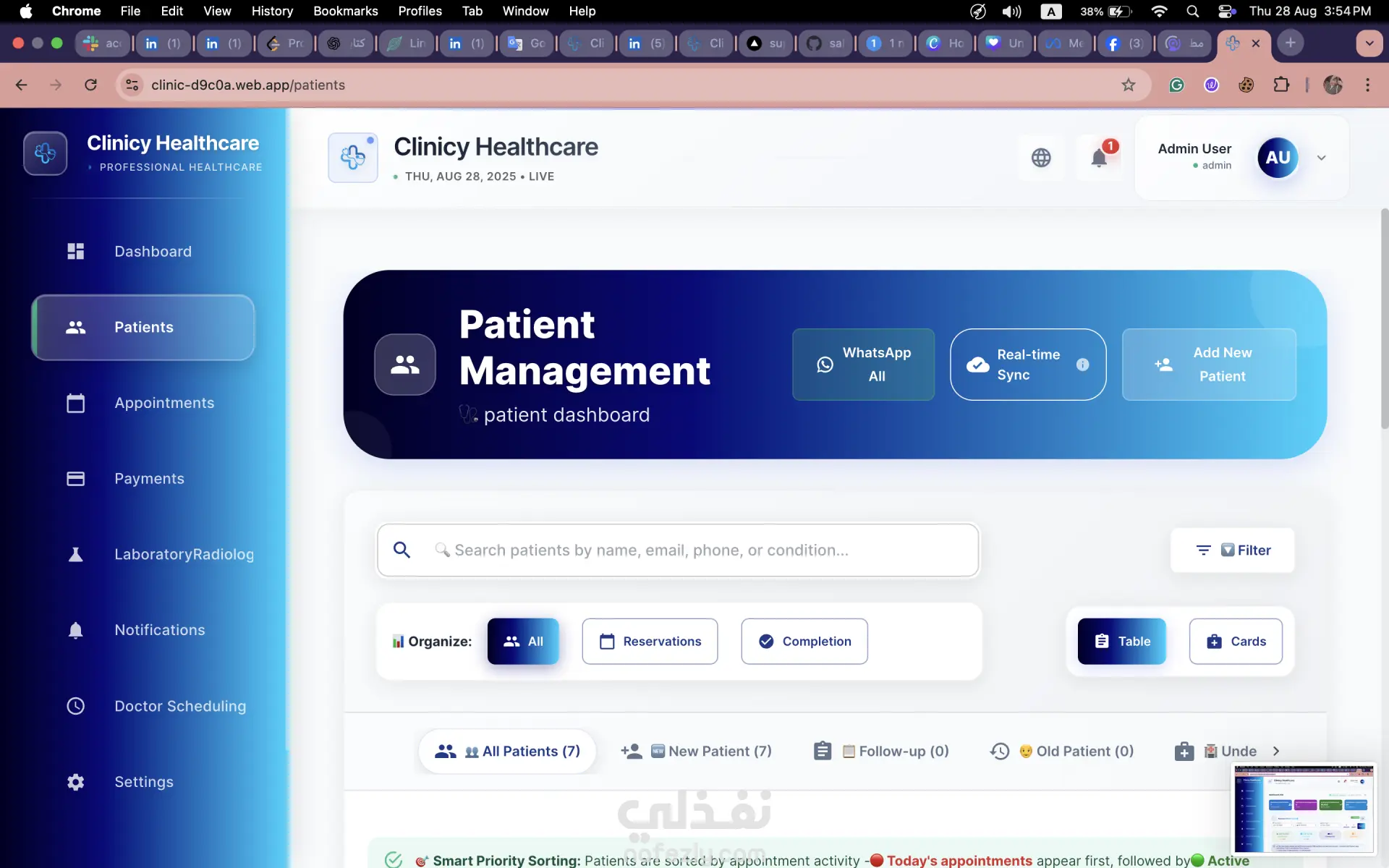 منصة رعاية صحية حديثة تتيح الجدولة الآمنة للمواعيد، وإدارة المرضى، وسير العمليات التشغيلية. تم بناؤها بالكامل (End-to-End) بهيكلية واجهات أمامية قابلة للتوسع، وتوجيه آمن للمسارات (Secure Routing/Guards)، مع خدمات خلفية معتمدة على Firebase. مساهماتي الرئيسية (ما قمت ببنائه): 1) بنية حديثة للواجهات الأمامية (Modern Frontend Architecture) صممت تطبيقاً قابلاً للتوسع باستخدام React 18 و Vite و TypeScript بهيكلية تعتمد على الميزات (Feature-based structure). قمت بمركزة مزودات الحالة (Centralized Providers) للمصادقة/المستخدمين، واجهة المستخدم العامة، الإشعارات، وتحديد اتجاه النصوص (LTR/RTL). ضمنت استقرار واجهة المستخدم من خلال تخصيص حد للأخطاء (Error Boundary). 2) أمان وتوجيه متقدم (Advanced Security and Routing) نفذت نظام توجيه وتحكم في الوصول متعدد الطبقات باستخدام الـ Guards (مثل: ProtectedRoute, AdminProtectedRoute, ClinicAccessGuard, EnhancedRouteGuard). كتبت قواعد أمان (Security Rules) شاملة لـ Firestore تغطي صلاحيات الـ Admin/Super-admin، تحديد نطاق الوصول للعيادات (Clinic Scoping)، والتحكم الدقيق في الوصول لقواعد البيانات (Collections). 3) الوظائف الأساسية للعيادة (Core Clinic Functionality) طورت لوحات تحكم (Dashboards) مخصصة لموظفي الاستقبال والأطباء. نفذت وحدات متكاملة لإدارة المرضى، المواعيد (قوائم وتقويم)، المدفوعات، جداول الأطباء، والتحاليل/الأشعة. أضفت نظام دفع مرن وموثوق: تهيئة المدفوعات مع مزامنة احتياطية للمواعيد عند بدء تشغيل التطبيق. 4) أنظمة خلفية قابلة للتوسع وعمليات الربط (Scalable Backend & Integrations) طورت وظائف Firebase Cloud Functions (Node 18) للعمليات البرمجية الأساسية: معالجات قابلة للاستدعاء (Callable Handlers) لإدارة المواعيد وحذف المرضى، ومُشغلات (Firestore Triggers) لمعالجة المدفوعات. برمجت مهام مجدولة (Scheduled Jobs) لإرسال التذكيرات، فحص جرد المخزون المنخفض (للتحاليل/الأشعة)، وتنظيف الإشعارات القديمة. أسست البنية التحتية للمراسلة: إعداد FCM Service Worker، وعمليات ربط (Integrations) مع خدمات مثل Twilio، Nodemailer، و SendGrid. 5) تجربة المطور والصيانة (DX and Maintenance) دمج كامل لمكتبة i18next لدعم اللغات المتعددة مع التعرف التلقائي على لغة المتصفح، ودعم ديناميكي للاتجاه من اليمين لليسار (RTL). بناء واجهة مستخدم وهوية بصرية متناسقة باستخدام MUI 5، Emotion، و Tailwind CSS 4. كتابة سكربتات تشغيلية (DevOps/Tooling) لعمليات النشر (Deployment)، إصلاح الفهارس (Index Fixes)، إعادة البناء، وأدوات منح صلاحيات الإدارة (Admin-claim Utilities).