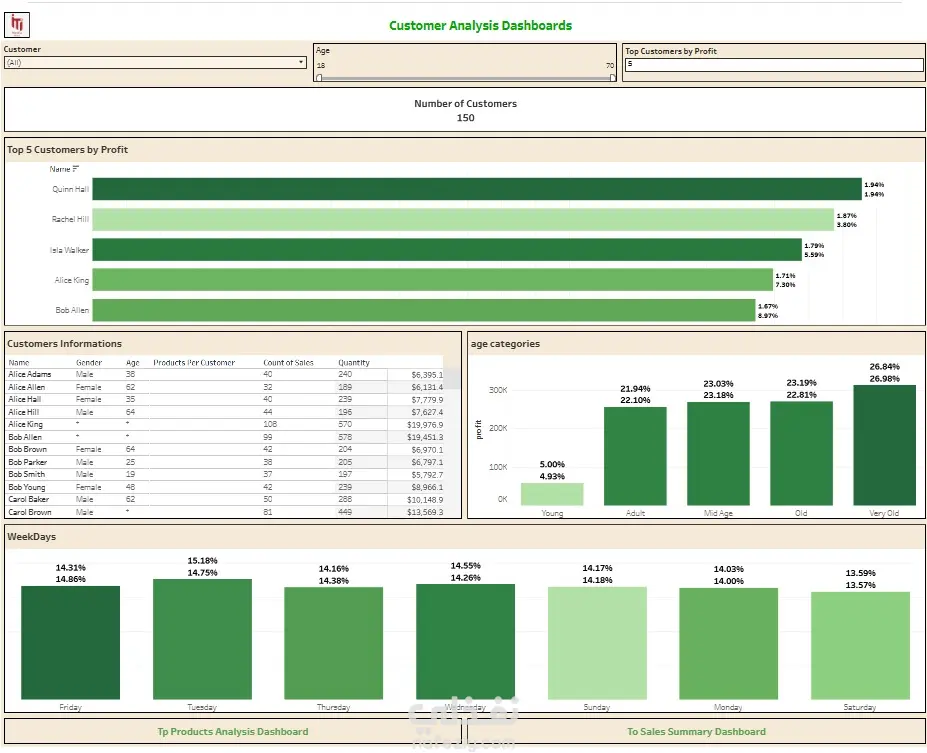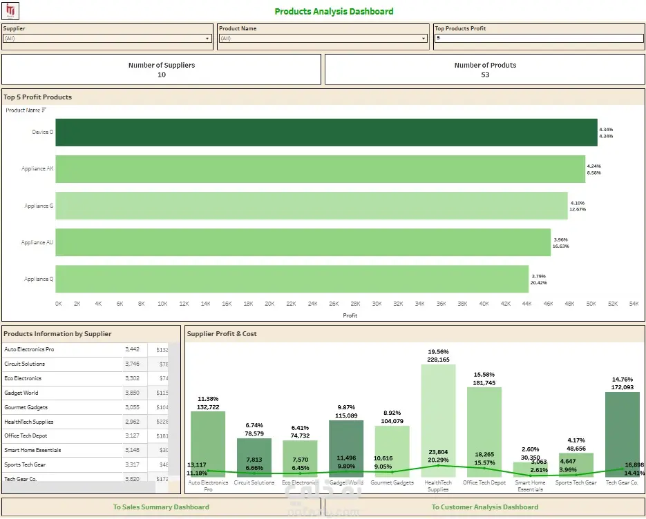 قمت بتنفيذ مشروع تحليل بيانات مبيعات باستخدام Tableau بهدف استخراج أهم المؤشرات وتحليل الأداء العام للشركة. يشمل المشروع 3 لوحات معلومات (Dashboards): لوحة ملخص المبيعات: تعرض المؤشرات الأساسية مثل الأرباح والكمية وتحليل الأداء حسب الفئات والمناطق، بالإضافة إلى تتبع الاتجاهات الزمنية وخريطة جغرافية لتوزيع الأرباح. لوحة تحليل المنتجات: توضح أفضل المنتجات من حيث الأرباح، وتحليل أداء الموردين، بالإضافة إلى مقارنة التكلفة مقابل الربح. لوحة تحليل العملاء: تتضمن تحليل سلوك العملاء، أفضل العملاء، توزيع الفئات العمرية، وتحليل المبيعات حسب أيام الأسبوع. تم استخدام فلاتر تفاعلية وParameters لتمكين المستخدم من التحكم في البيانات، بالإضافة إلى خاصية Drill-down للوصول إلى تفاصيل أدق.