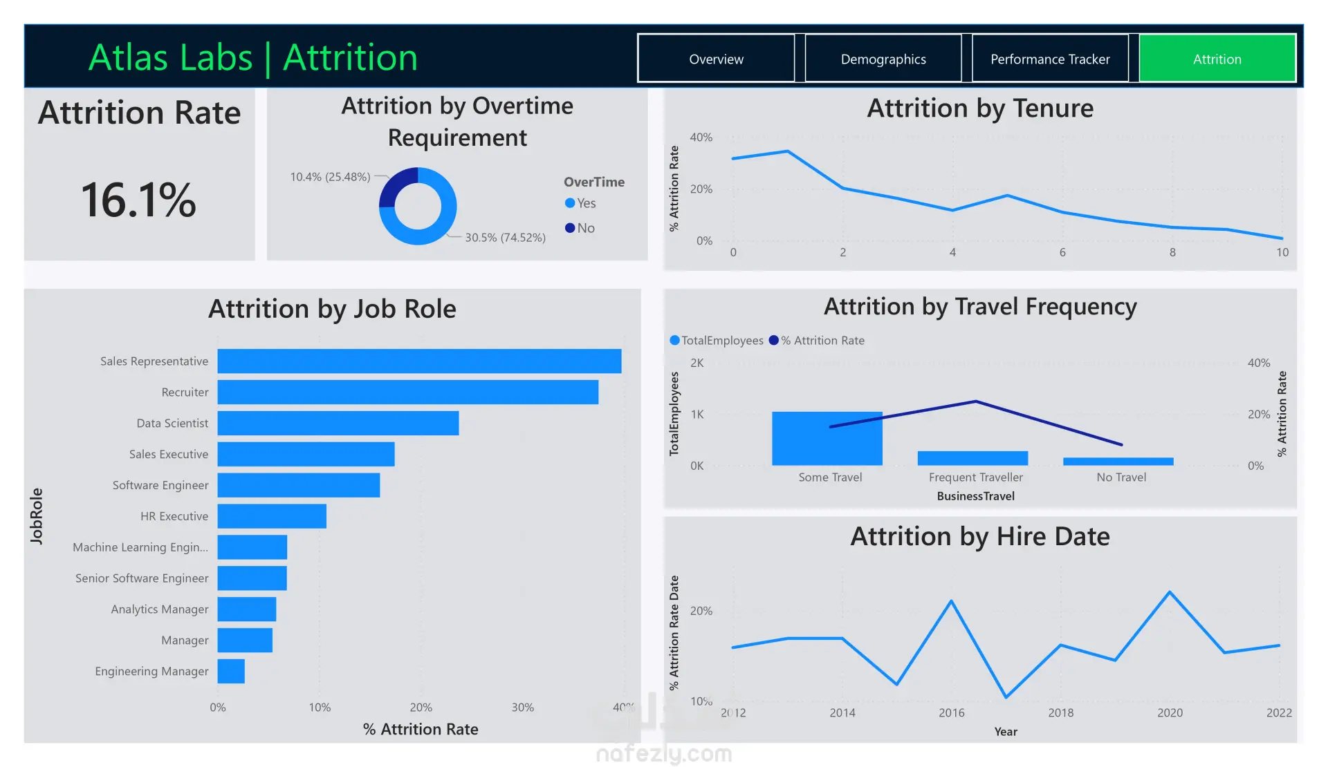 Overview: عرض المؤشرات الأساسية مثل عدد الموظفين ومعدل ترك العمل، بالإضافة إلى تحليل اتجاهات التوظيف عبر الزمن.