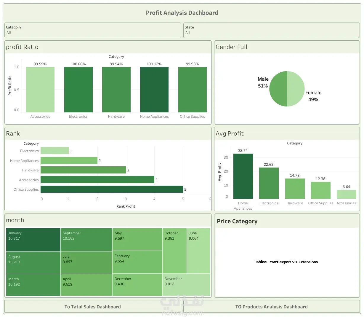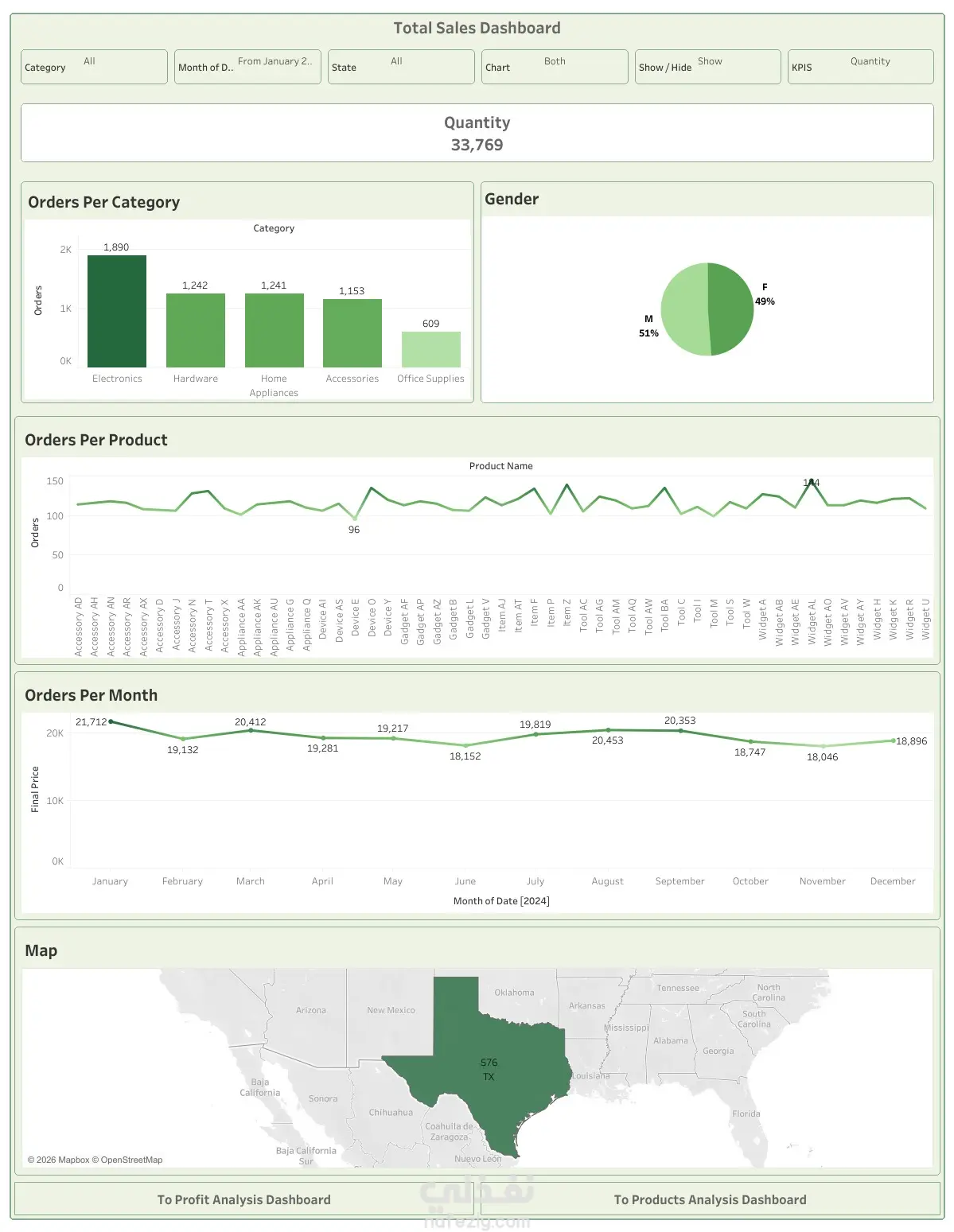 KPIs Design: تصميم بطاقات الأداء الرئيسية (Total Sales, Total Profit, Quantity) لتكون واضحة في مقدمة اللوحة.