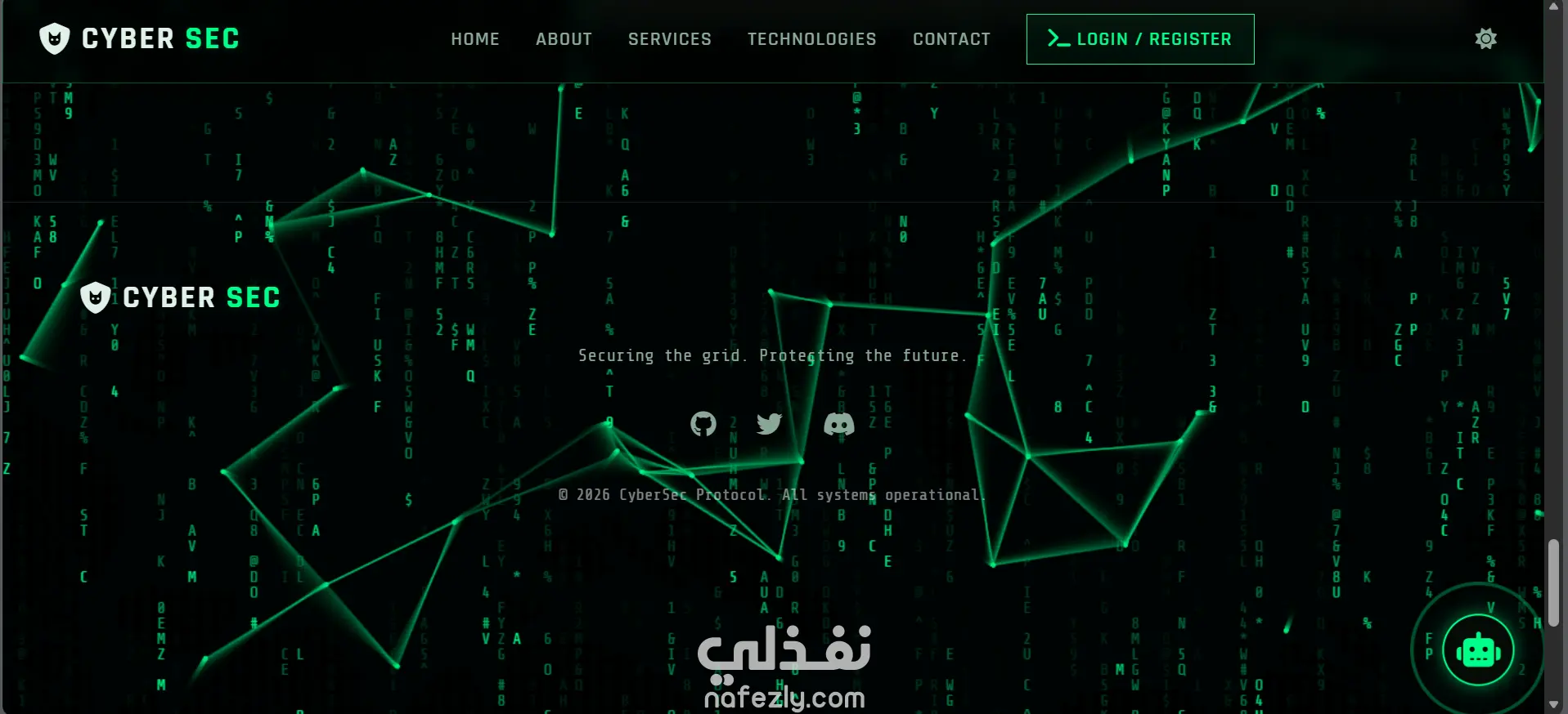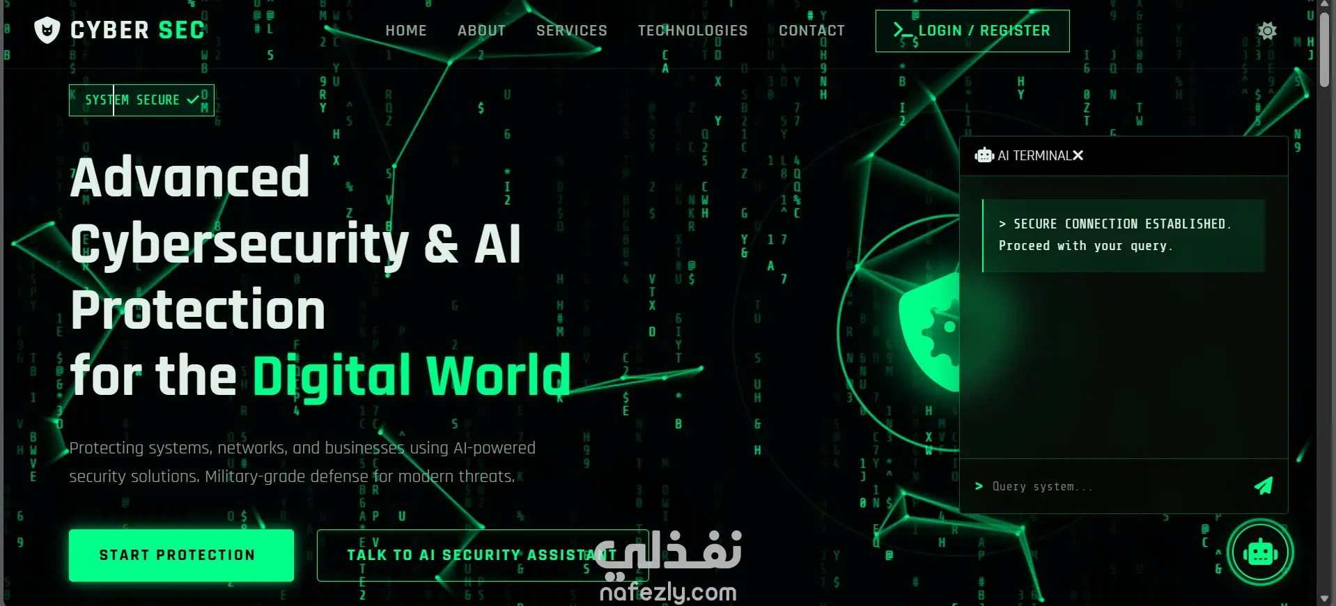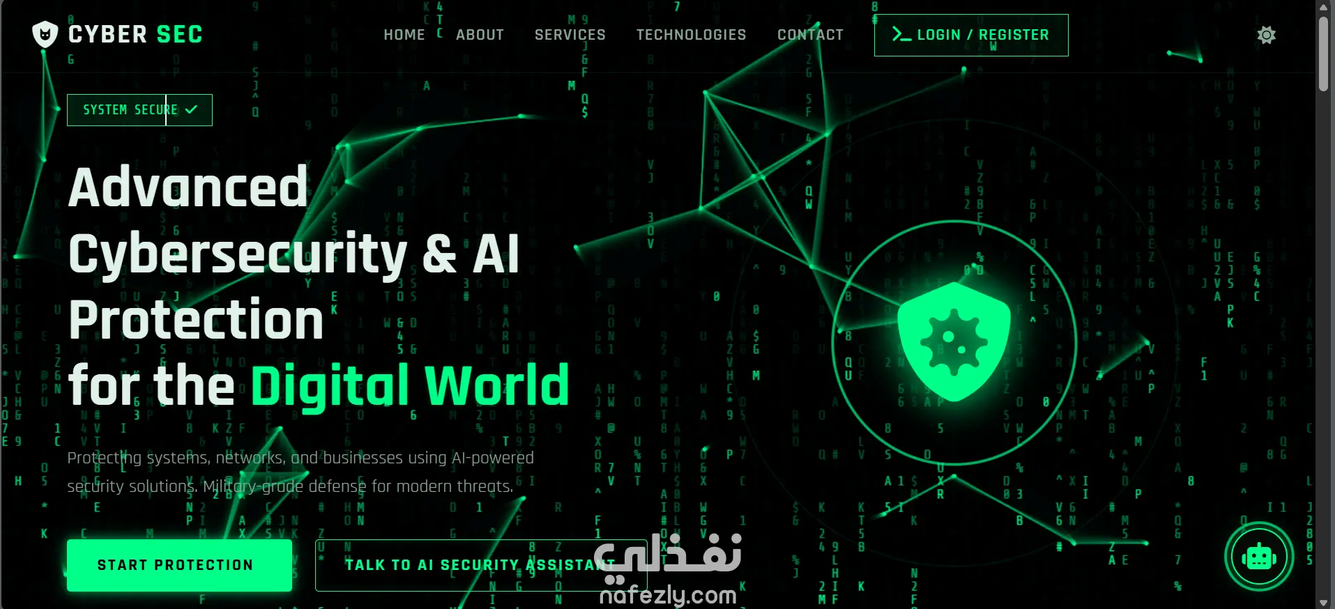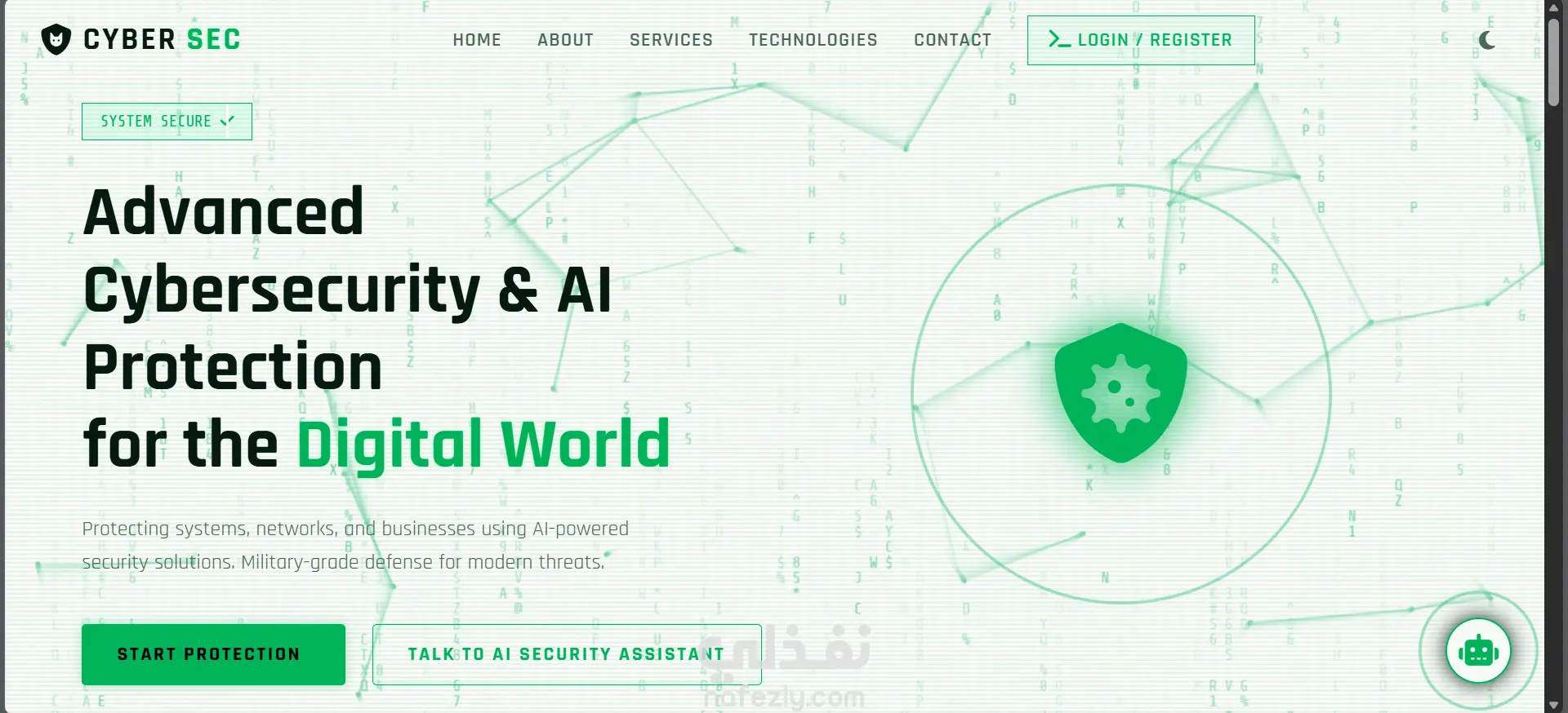 صفحة هبوط حديثة لشركة متخصصة في الأمن السيبراني، تم تصميمها بواجهة احترافية تعكس الطابع التقني والمستقبلي للمجال. يتضمن الموقع تصميمًا تفاعليًا مع حركات (Animations) جذابة، بالإضافة إلى دعم الوضعين الفاتح والداكن (Light & Dark Mode) لتجربة استخدام مريحة. كما يحتوي على نظام تسجيل دخول وإنشاء حساب، ونظام مساعد ذكي (AI) يتيح للمستخدمين طرح الأسئلة والحصول على إجابات متعلقة بالأمن السيبراني. تم تطوير الصفحة لتكون سريعة الاستجابة ومتوافقة مع مختلف الأجهزة مع التركيز على تجربة مستخدم عصرية وجذابة.