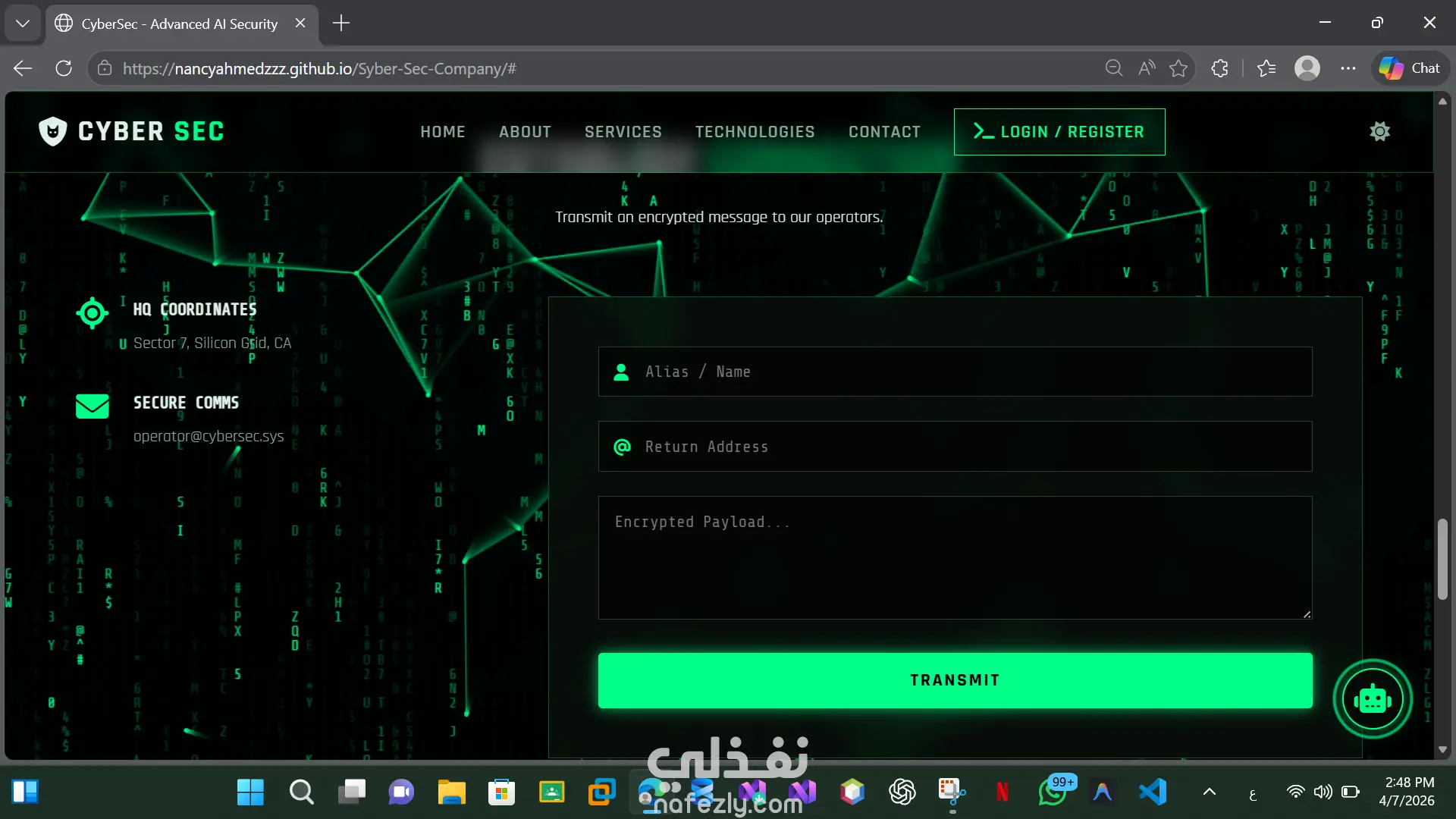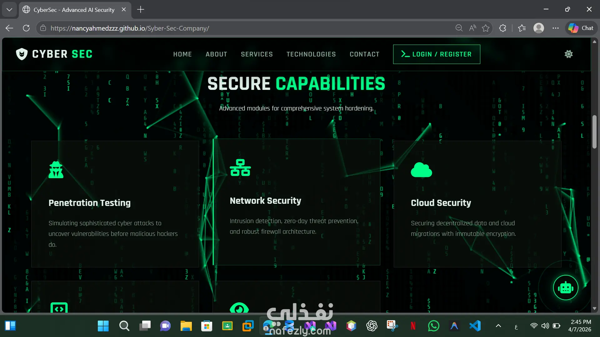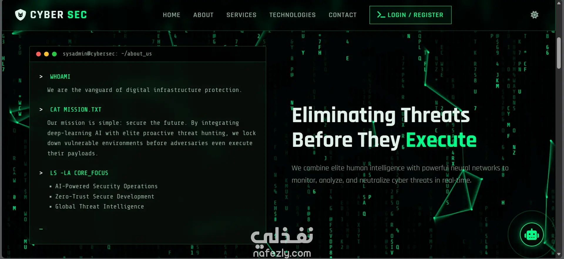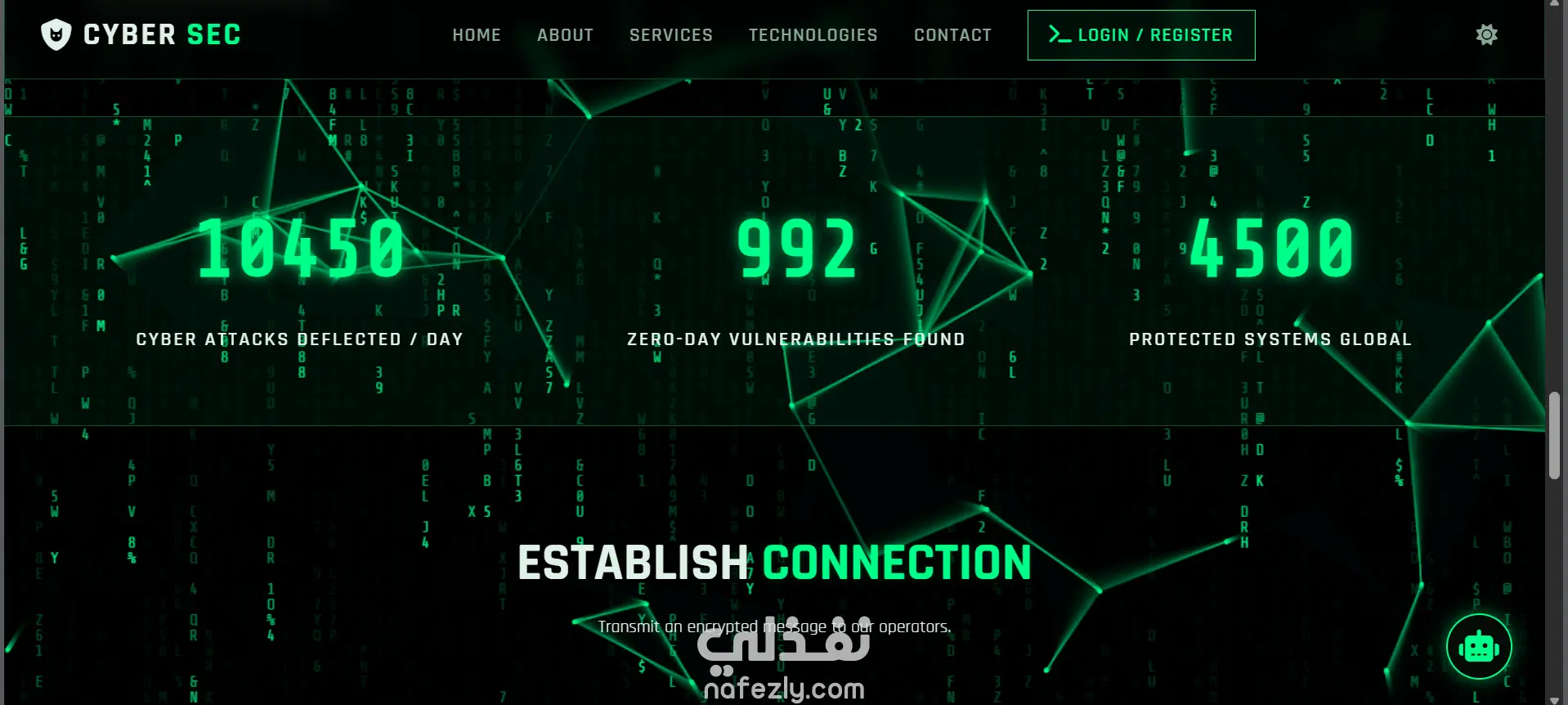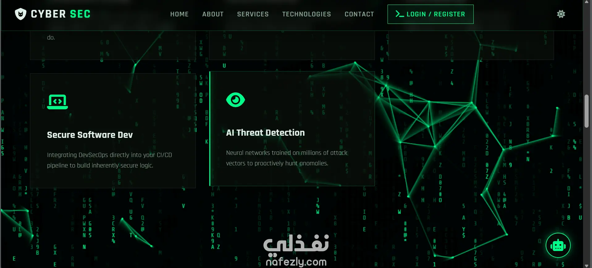 صفحة هبوط حديثة لشركة متخصصة في الأمن السيبراني، تم تصميمها بواجهة احترافية تعكس الطابع التقني والمستقبلي للمجال. يتضمن الموقع تصميمًا تفاعليًا مع حركات (Animations) جذابة، بالإضافة إلى دعم الوضعين الفاتح والداكن (Light & Dark Mode) لتجربة استخدام مريحة. كما يحتوي على نظام تسجيل دخول وإنشاء حساب، ونظام مساعد ذكي (AI) يتيح للمستخدمين طرح الأسئلة والحصول على إجابات متعلقة بالأمن السيبراني. تم تطوير الصفحة لتكون سريعة الاستجابة ومتوافقة مع مختلف الأجهزة مع التركيز على تجربة مستخدم عصرية وجذابة.