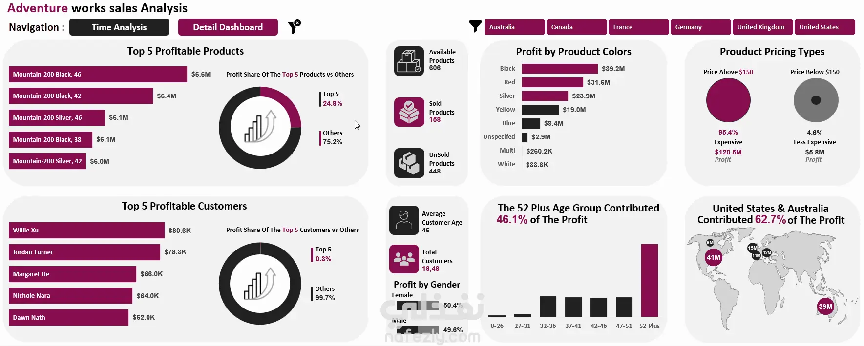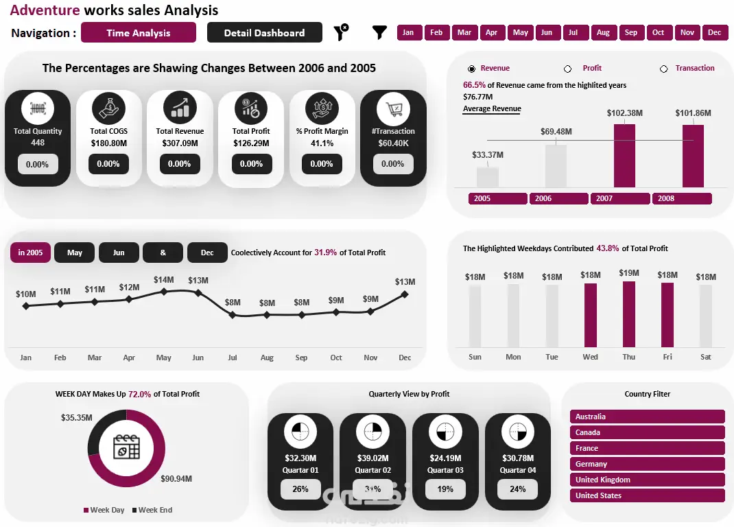 Excel BI Dashboard لتحليل المبيعات والربحية Adventure Works Project